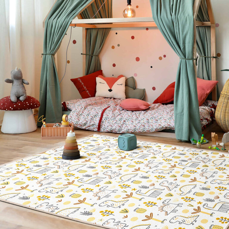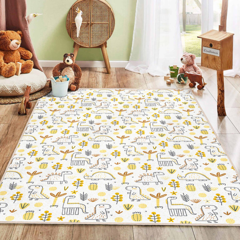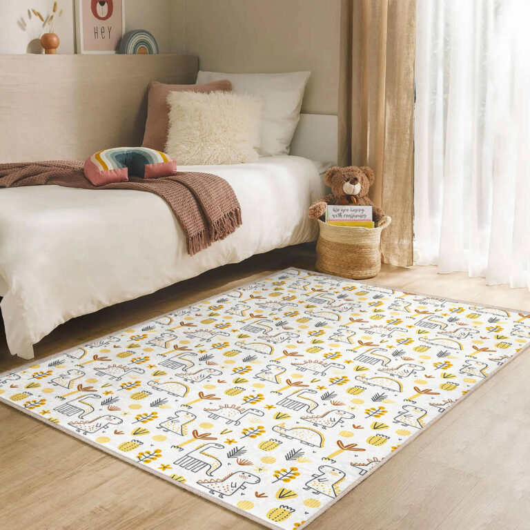 Dinozor Desenli Renkli Çocuk Halısı – Kaymaz Taban ile Yıkanabilir Dikdörtgen Çocuk Halısı