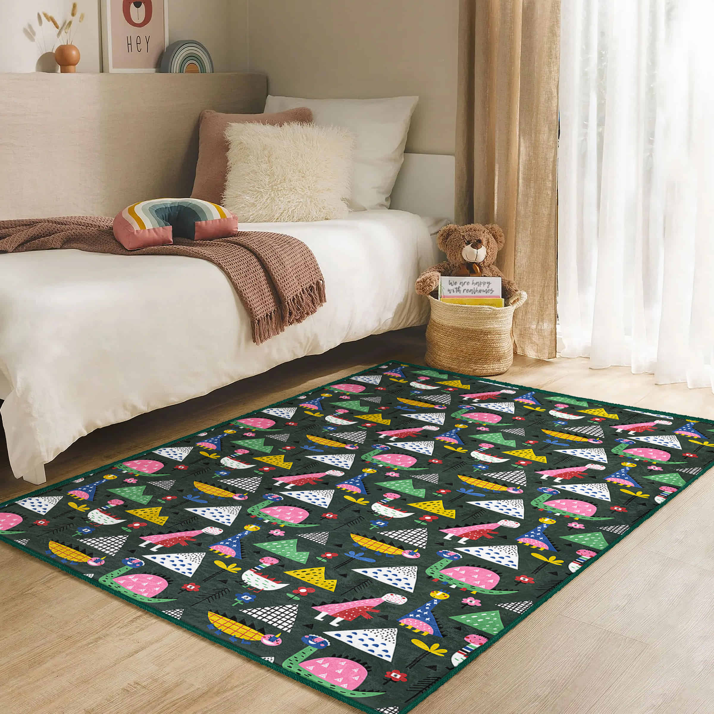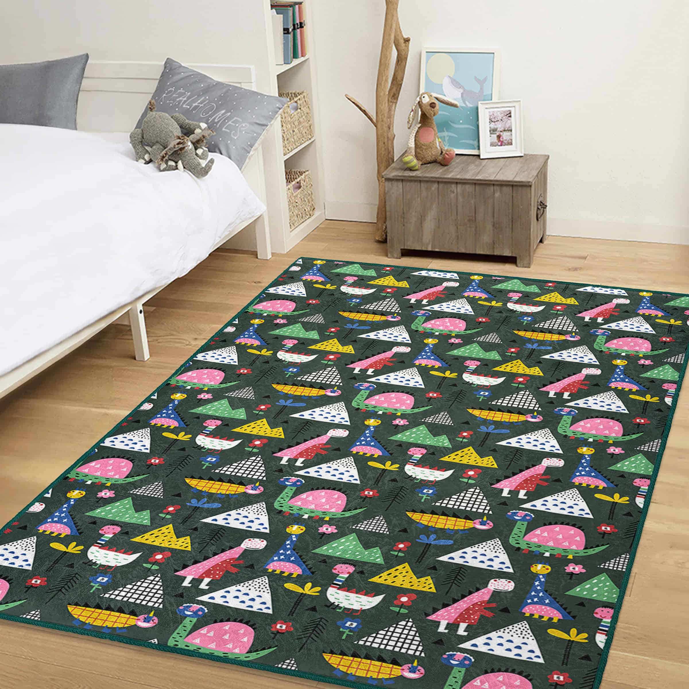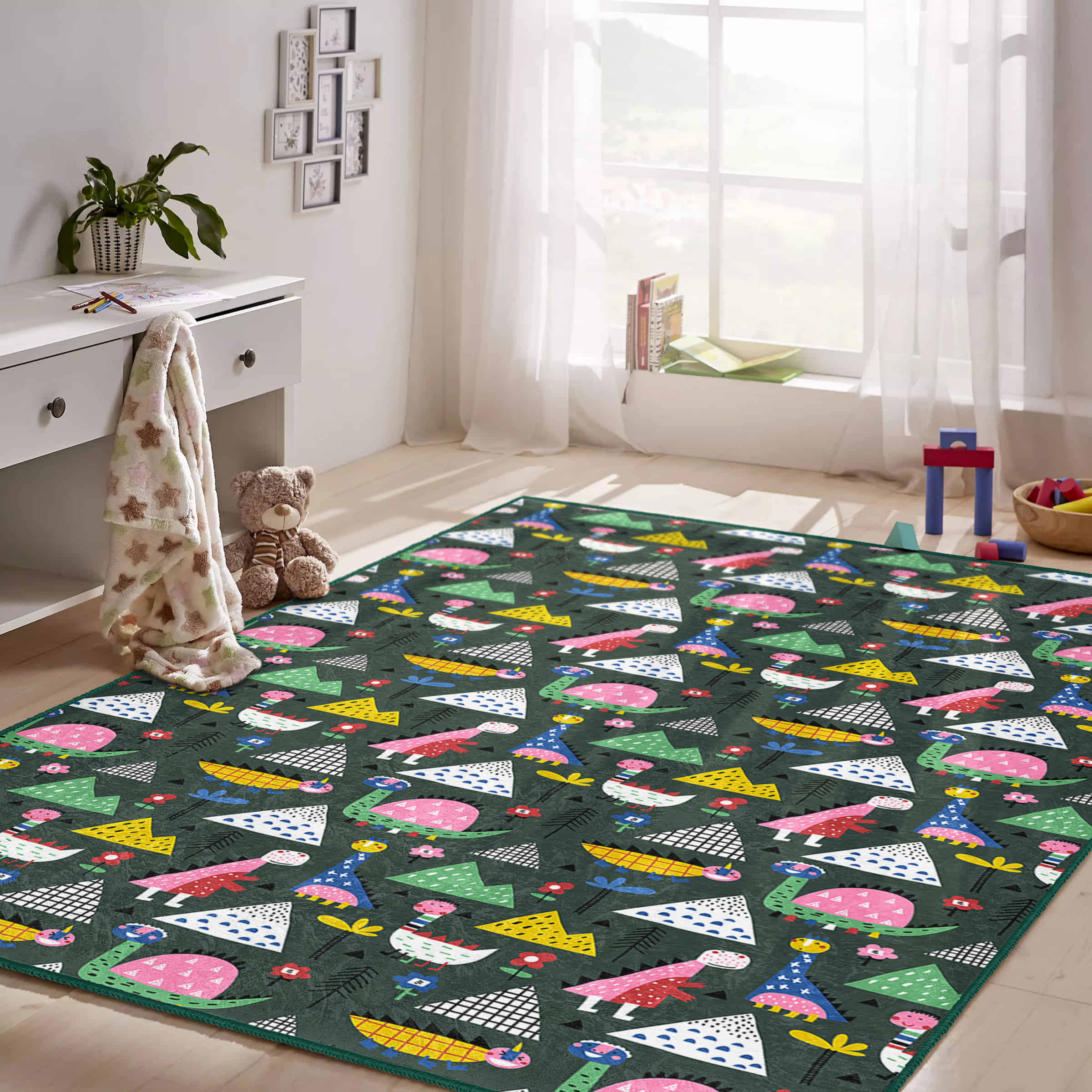 Dinozor Temalı Çocuk Halısı – Eğlenceli Desenlerle Renkli ve Konforlu Dikdörtgen Kaymaz Taban Halı