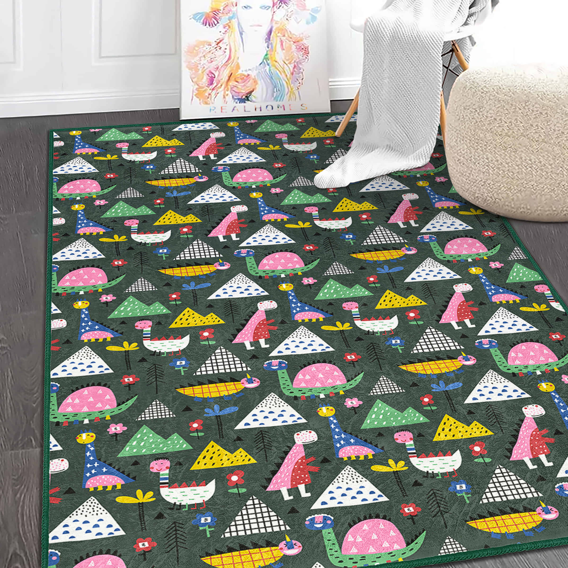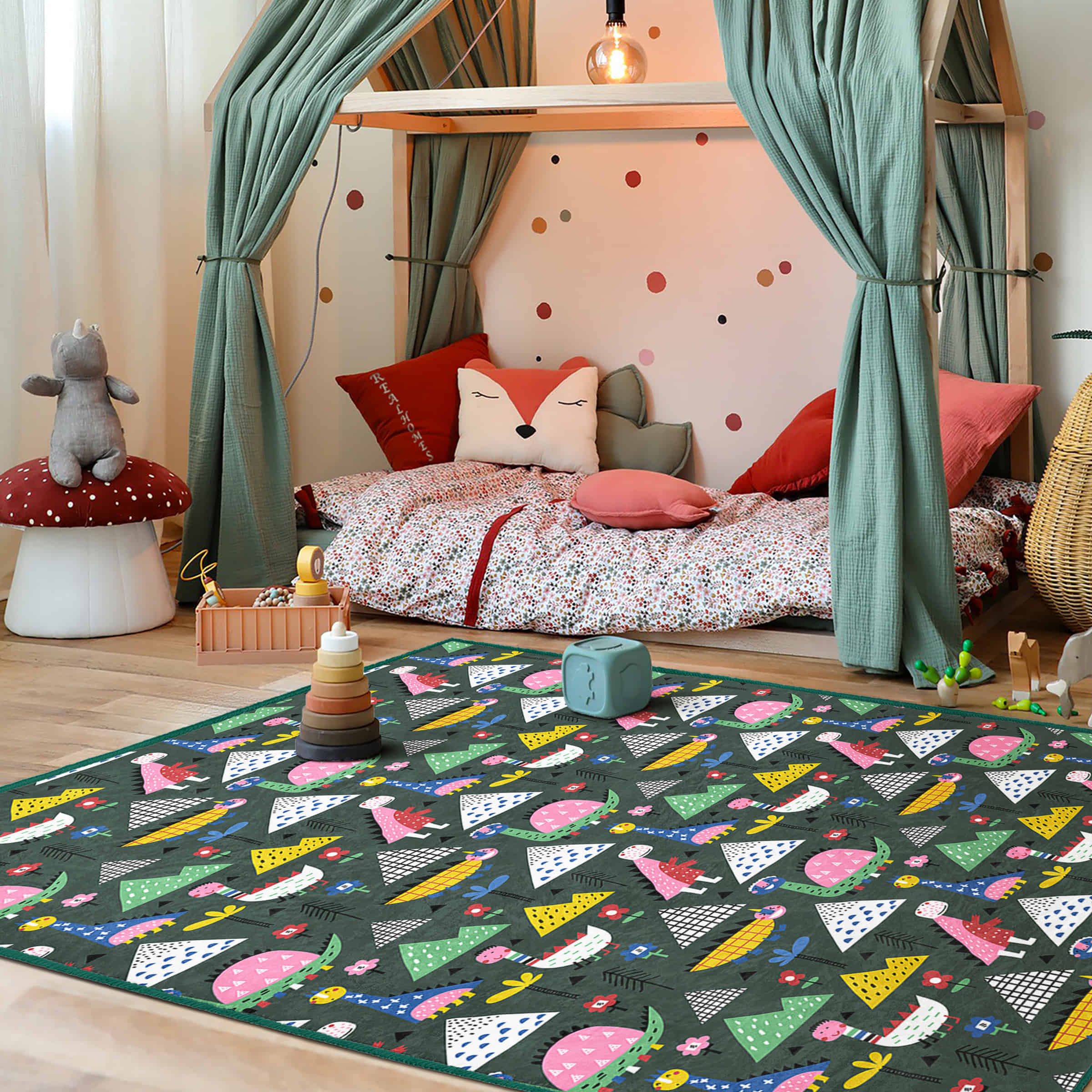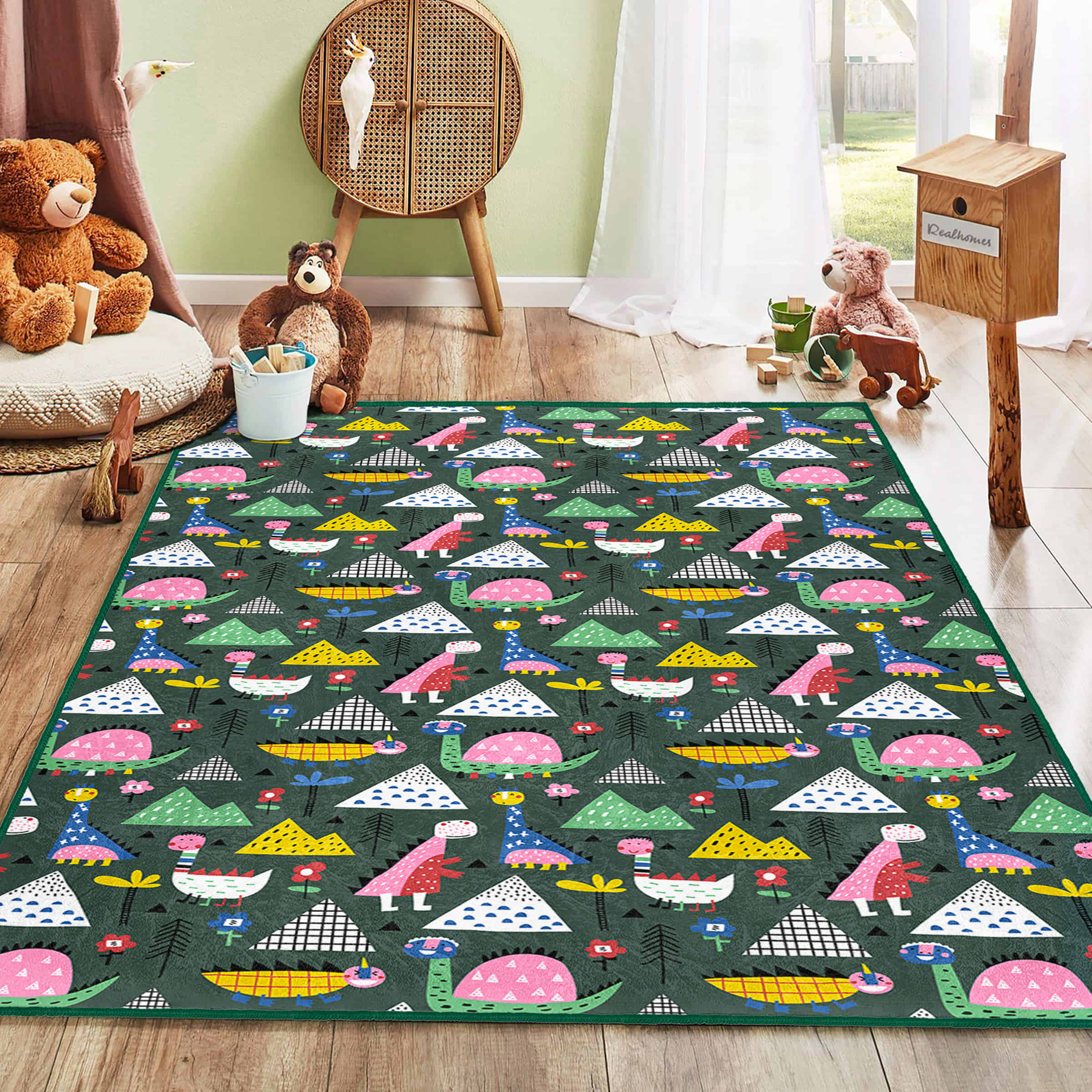 Dinozor Temalı Çocuk Halısı – Eğlenceli Desenlerle Renkli ve Konforlu Dikdörtgen Kaymaz Taban Halı