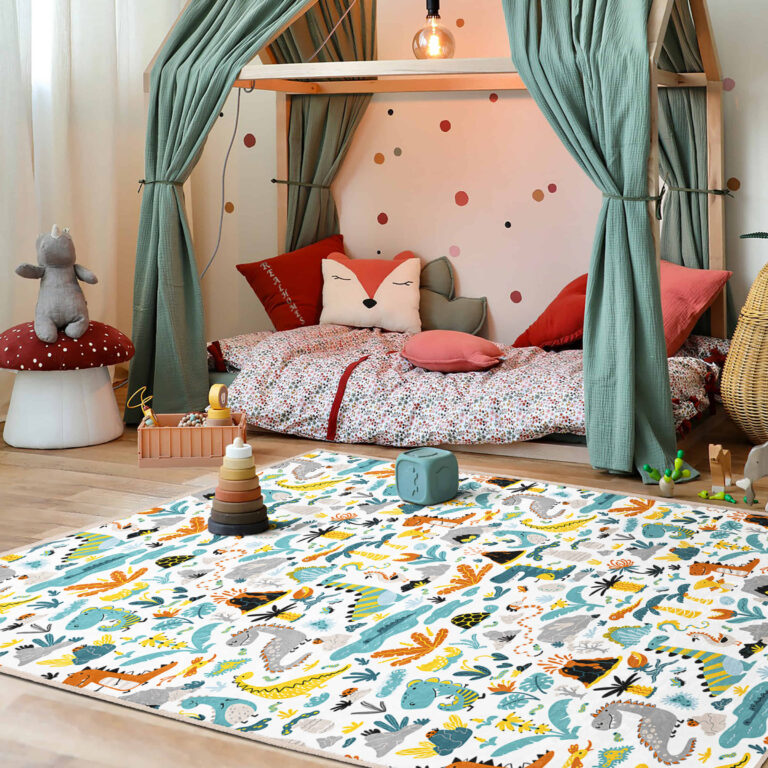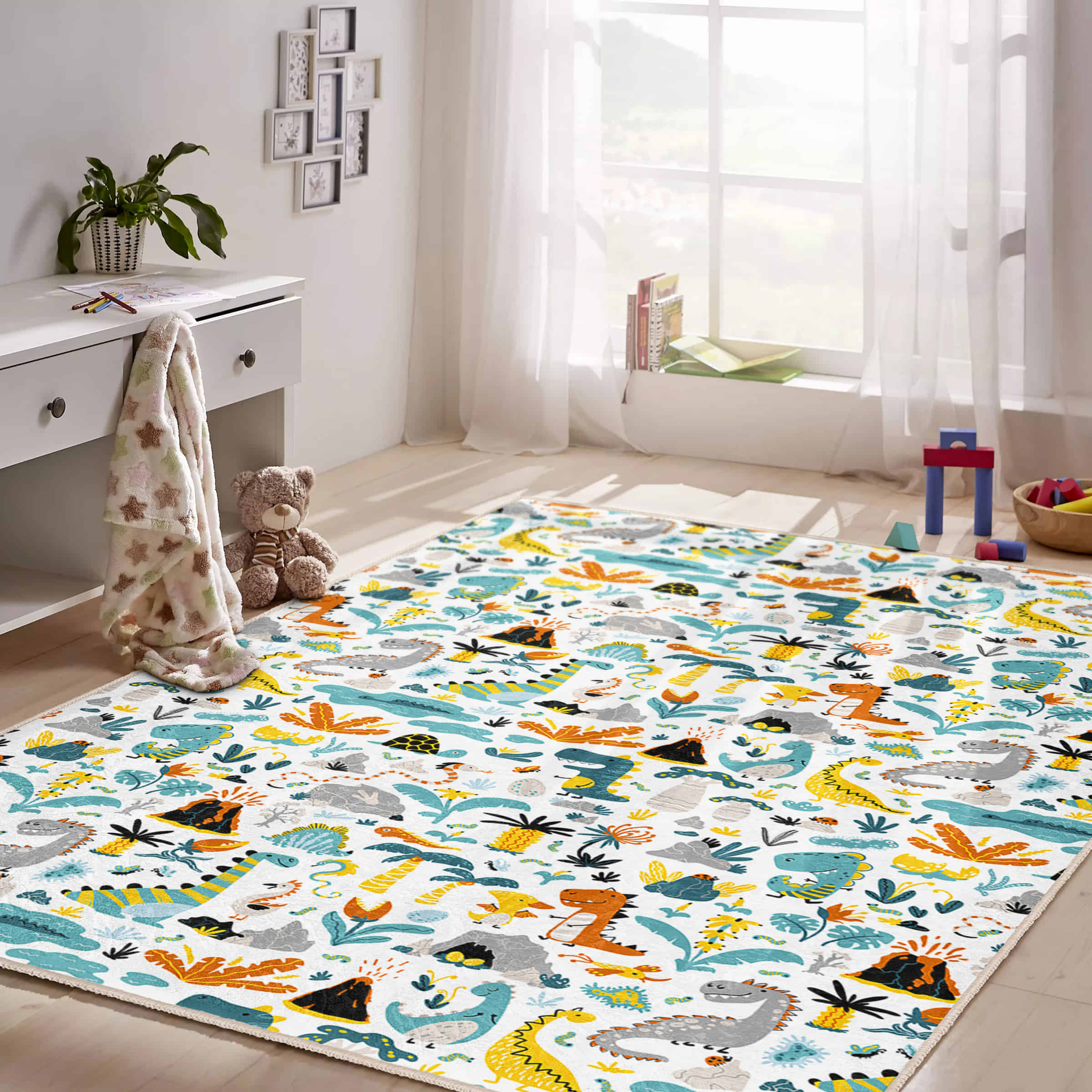 Dinozor Temalı Renkli Desenli Yıkanabilir Kaymaz Taban Çocuk Halısı