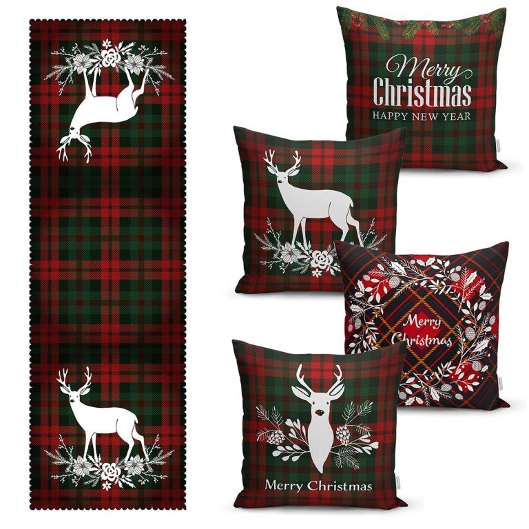 Ekose Zemin Mery Christmas Tasarımlı 4 Kırlent Kılıfı ve 1 Runner Seti