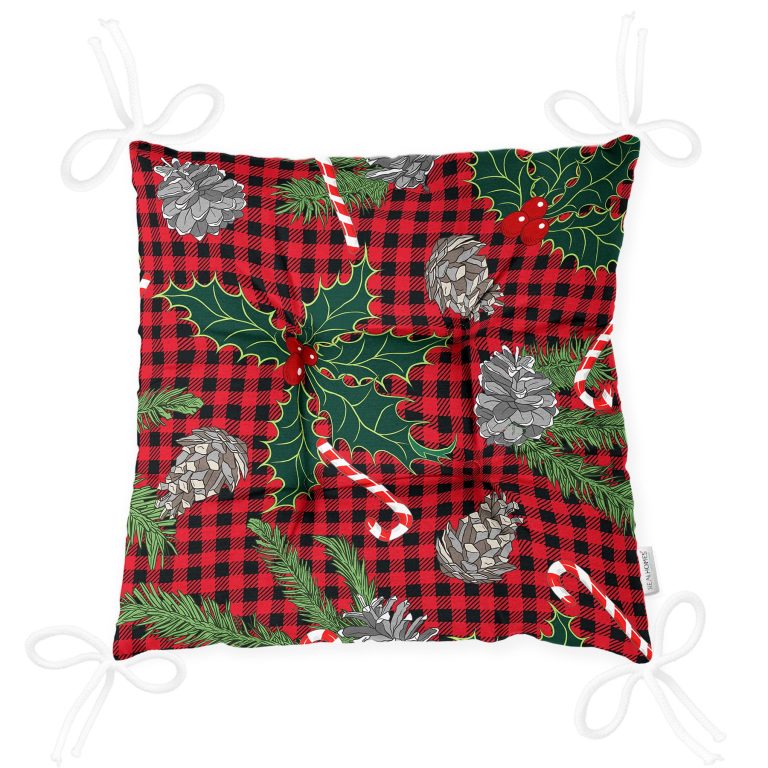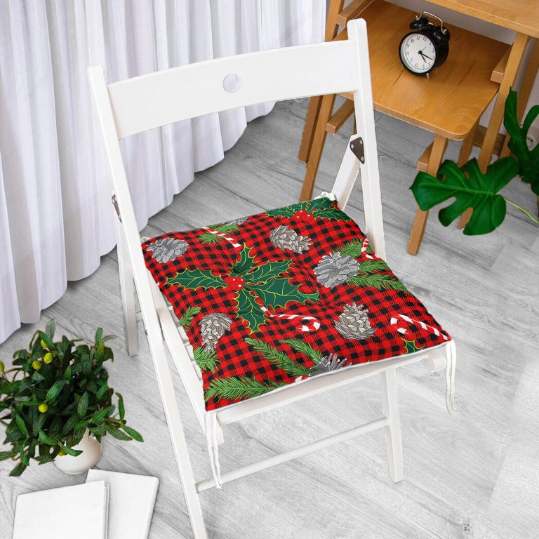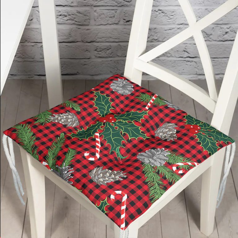 Ekose Zeminli Yılbaşı Temalı Dijital Baskılı Modern Pofidik Sandalye Minderi