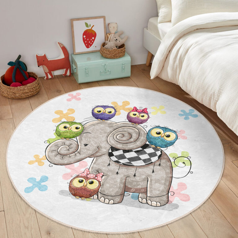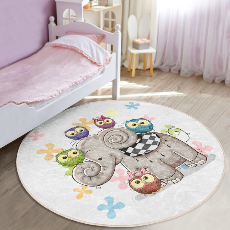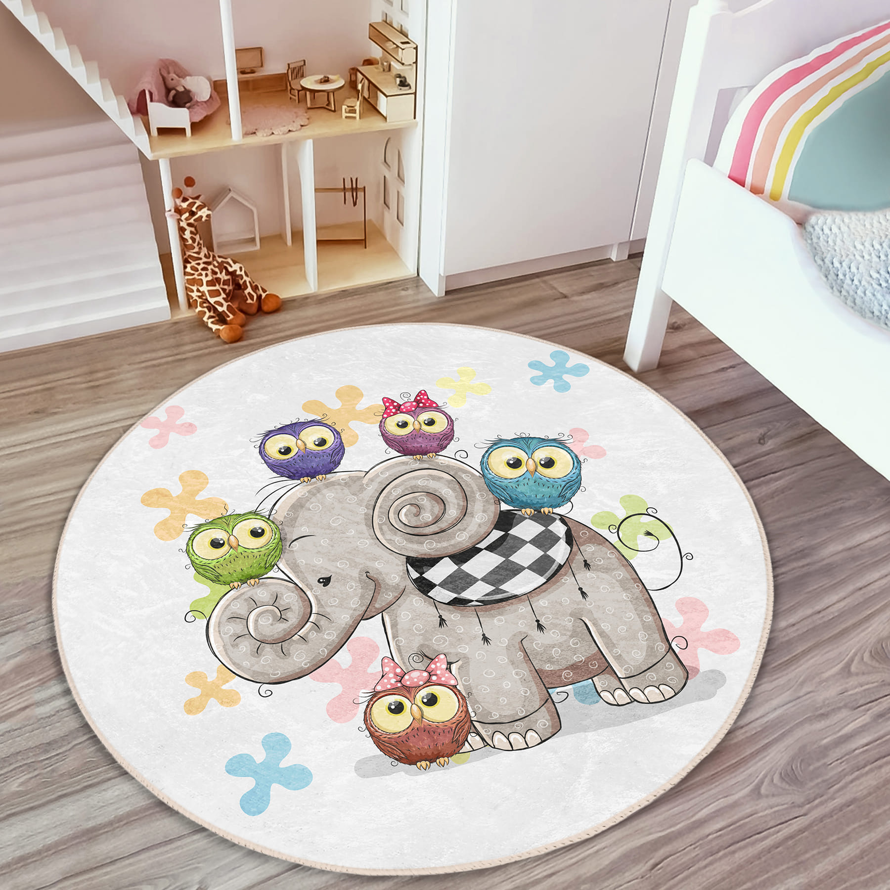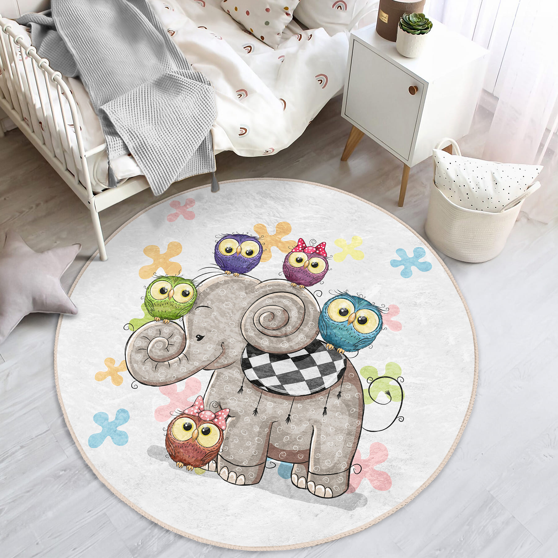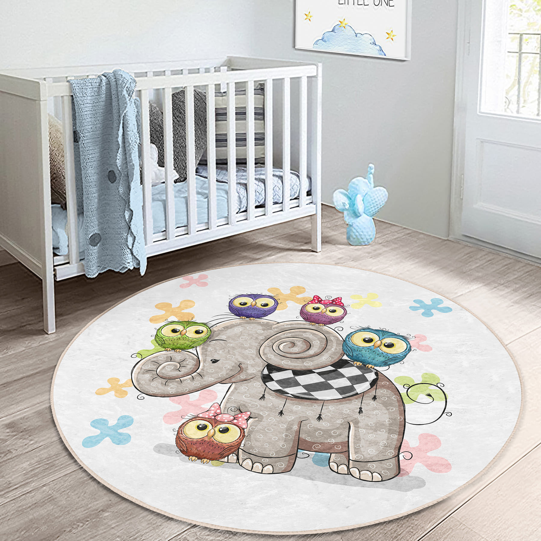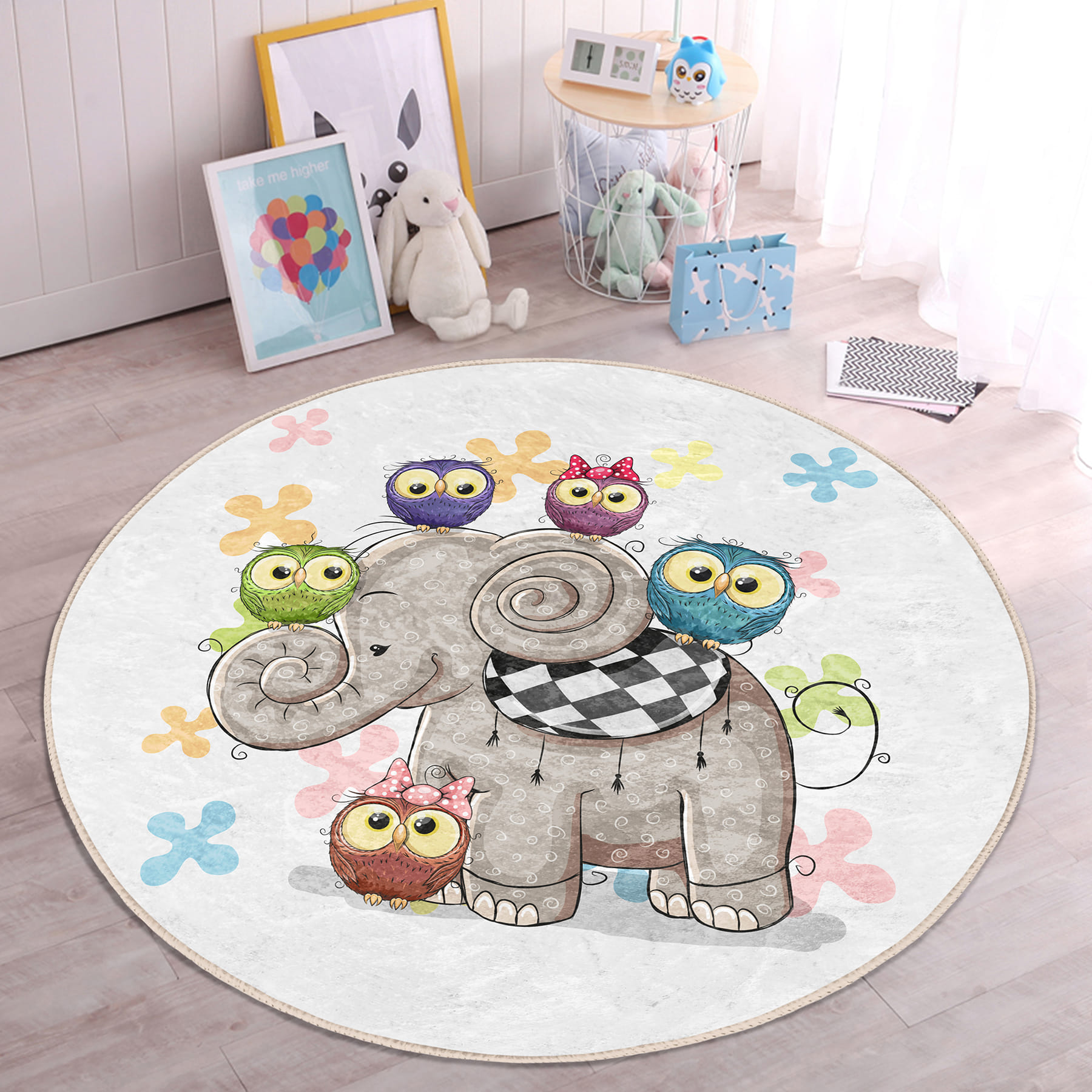 Fil Desen Çocuk Genç Odası Makinede Yıkanabilir Kaymaz Tabanlı Yuvarlak Kadife Halı