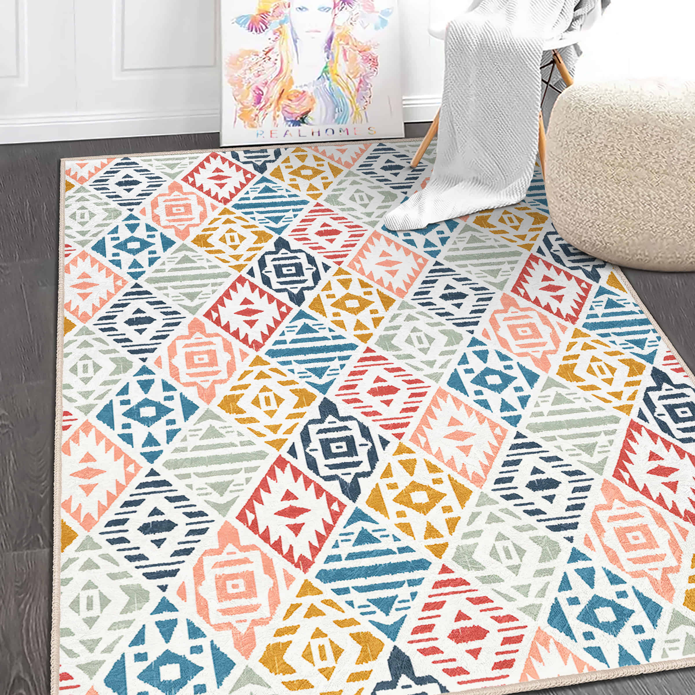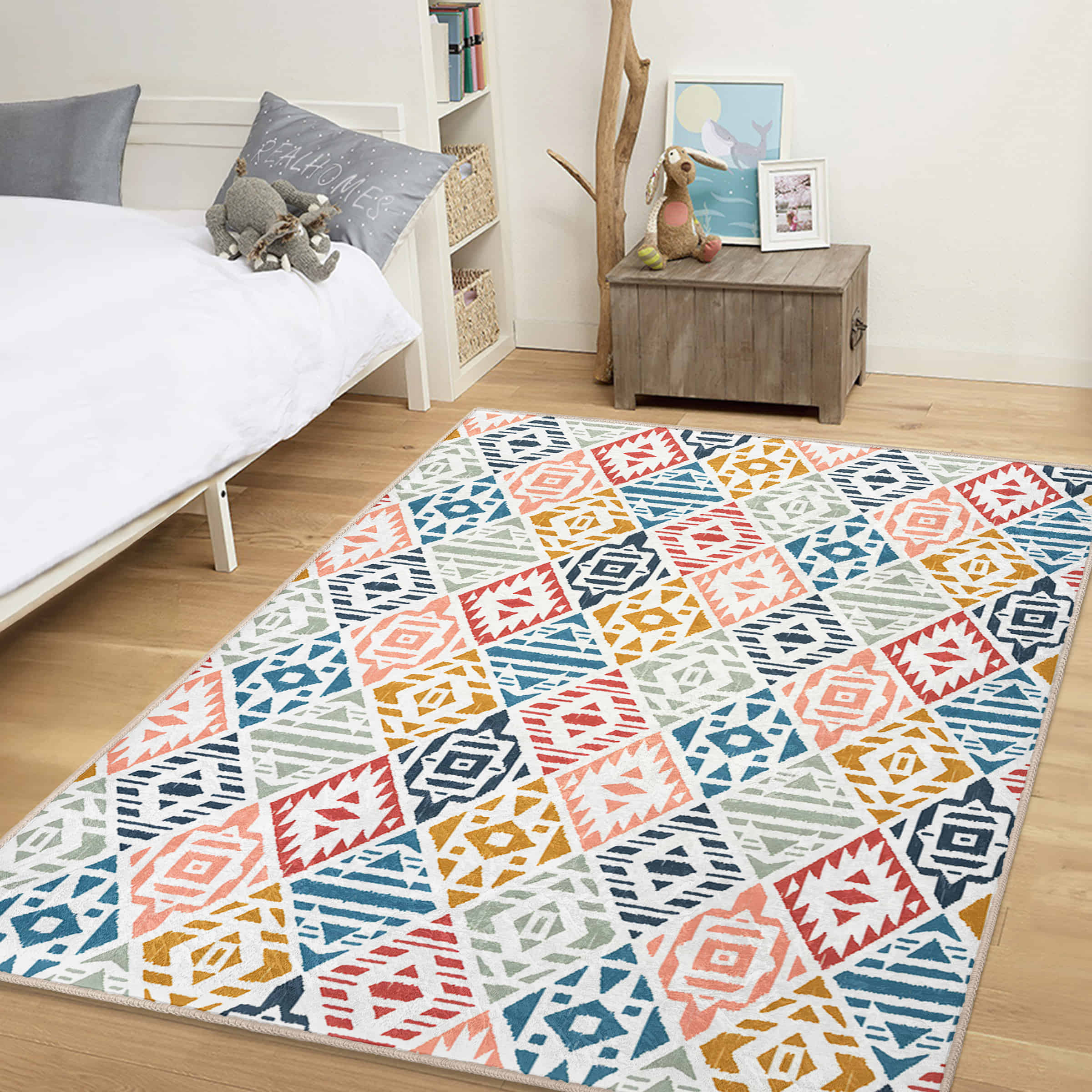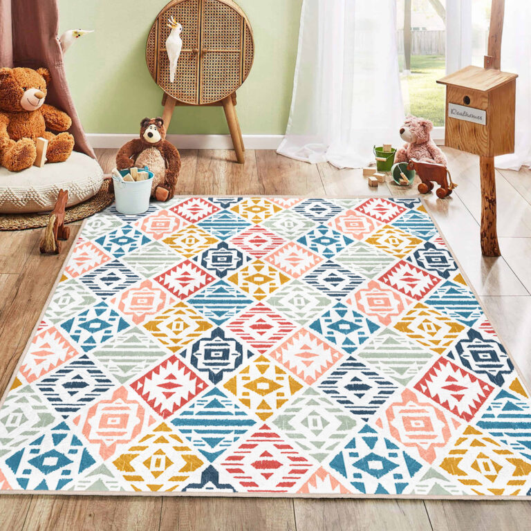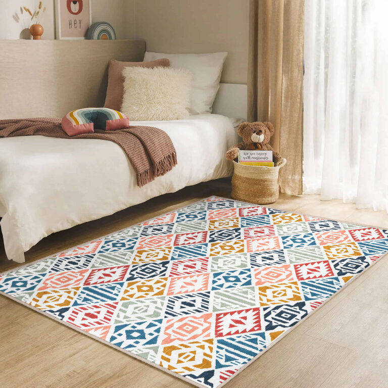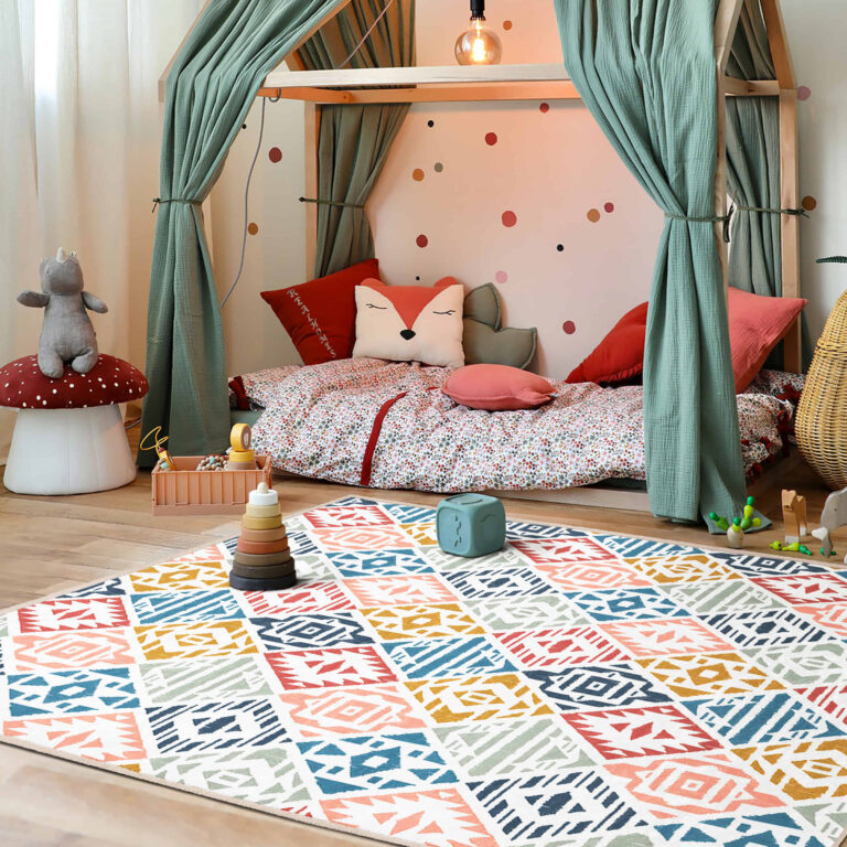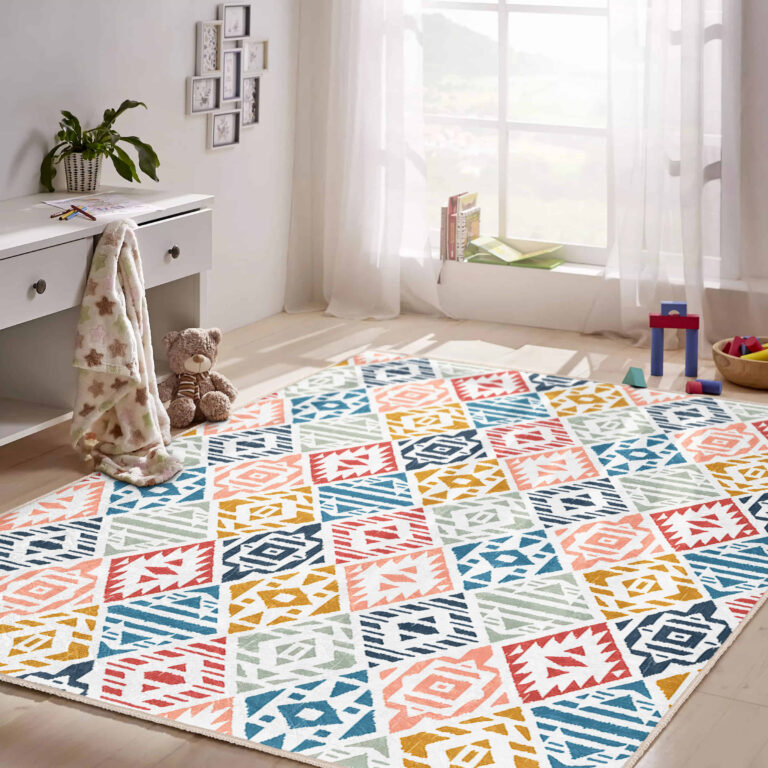 Geometrik Desenli Renkli Çocuk Halısı – Dikdörtgen Makinede Yıkanabilir Kaymaz Taban Halı