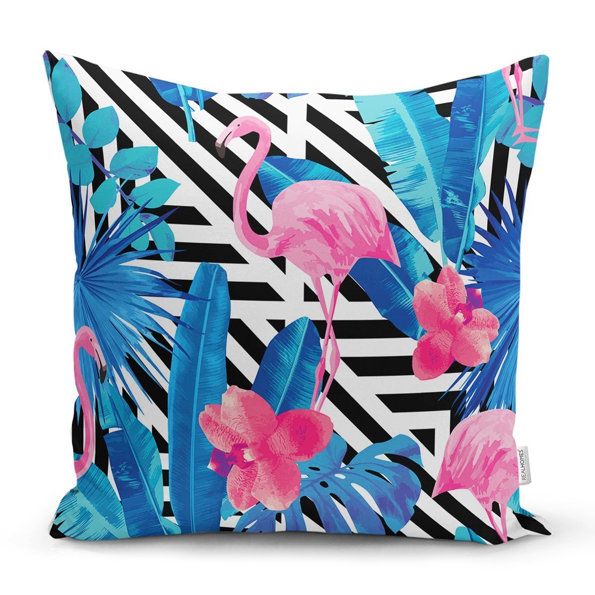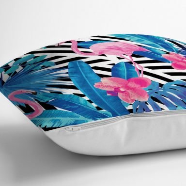 Geometrik Mavi Pempe Flamingo Tasarımlı Dijital Baskılı Yastık Kırlent Kılıfı