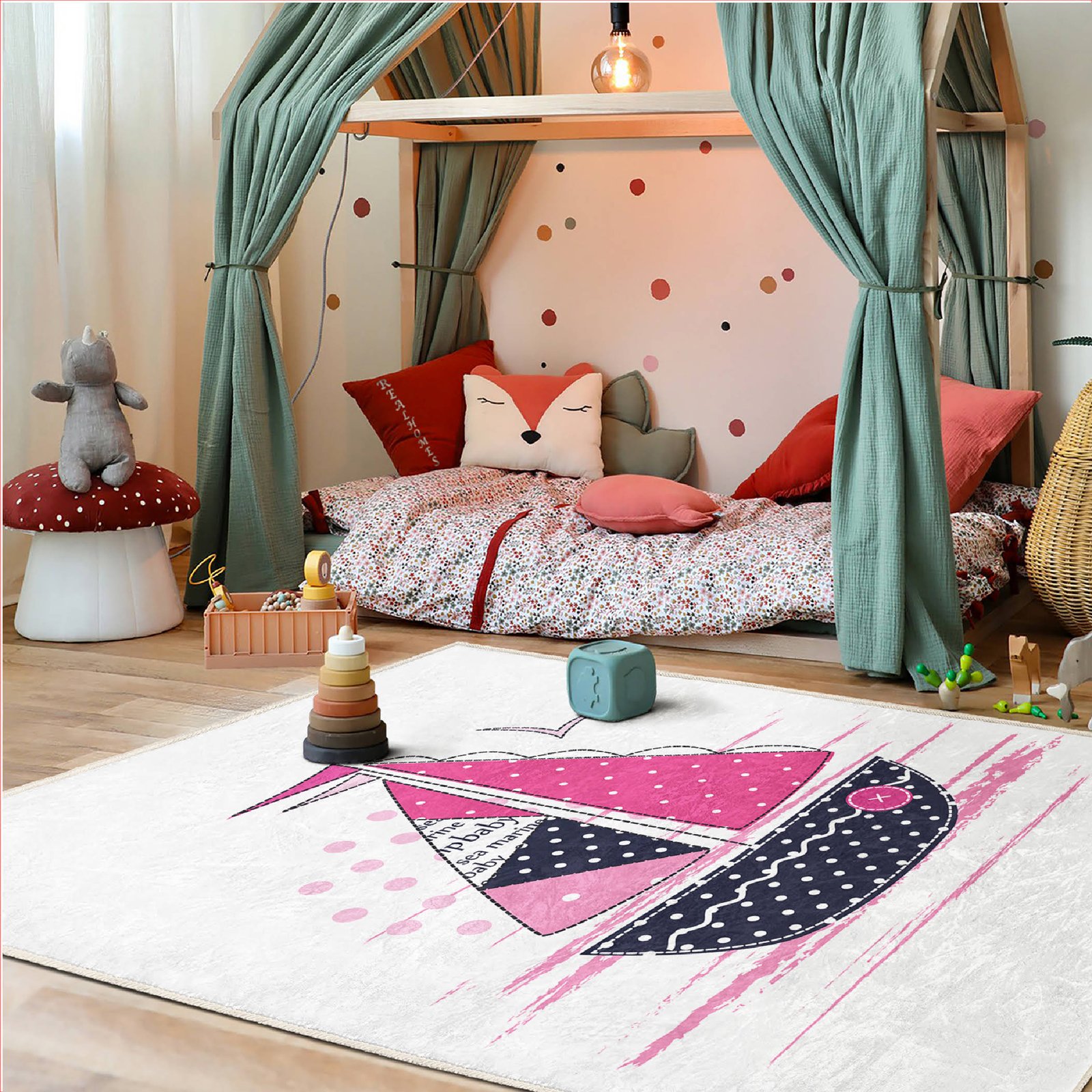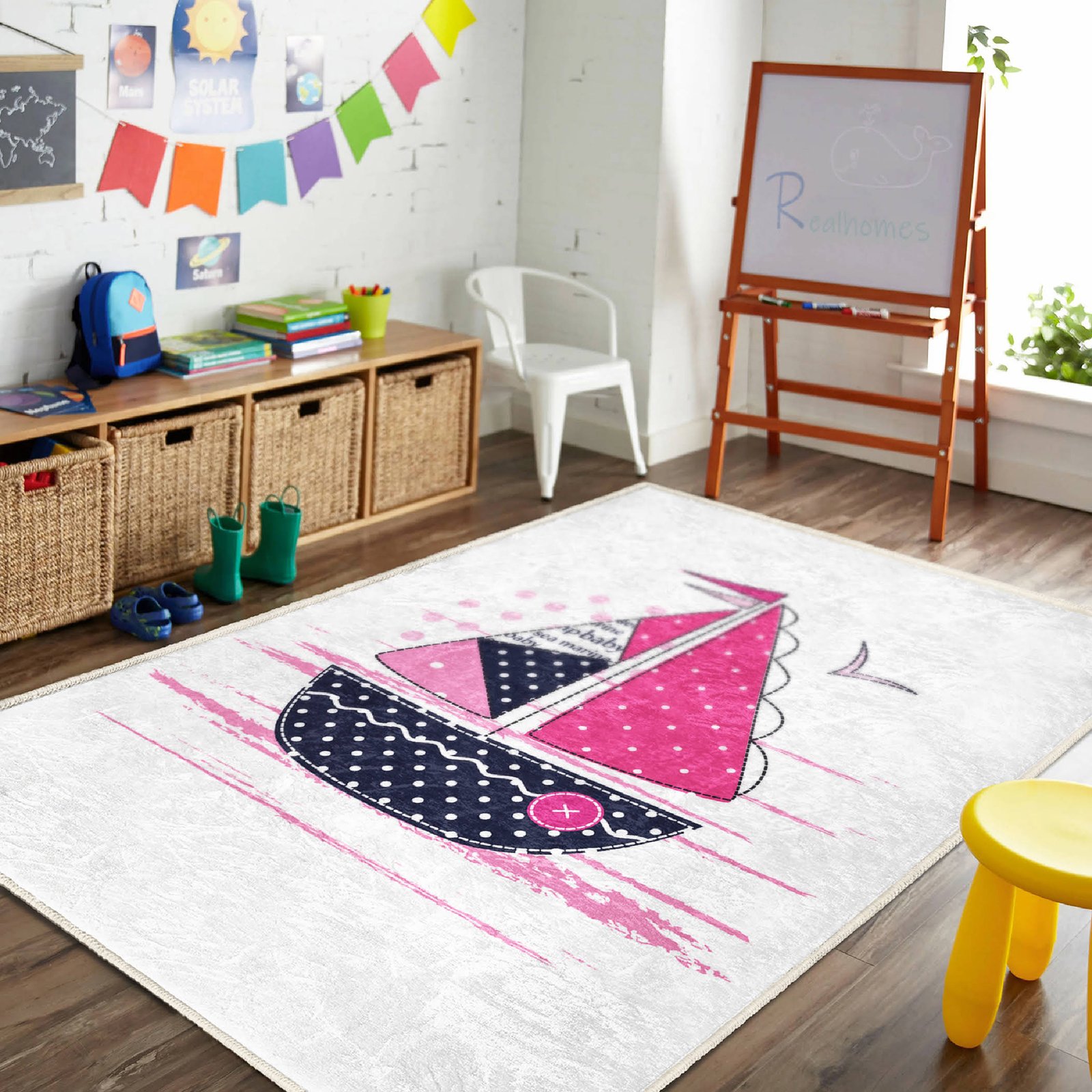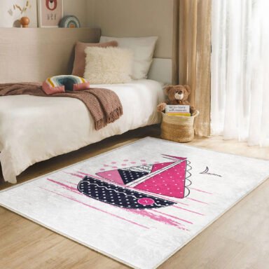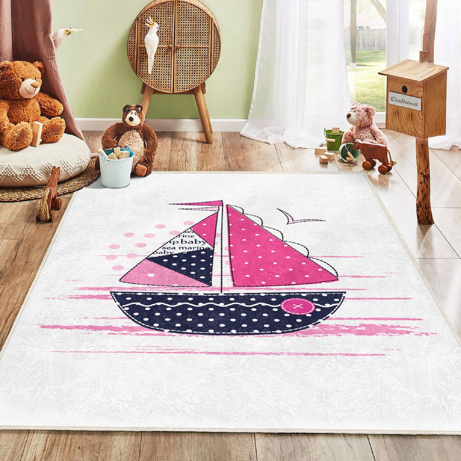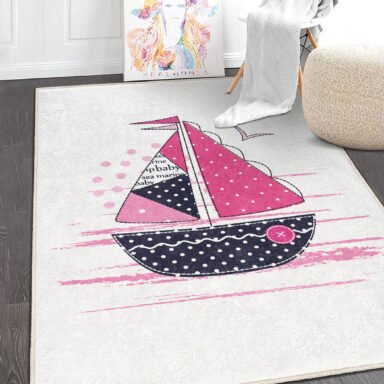 Gök Mavisi ve Pembe Renkli Yelken Desenli Yıkanabilir Kaymaz Taban Çocuk Halısı