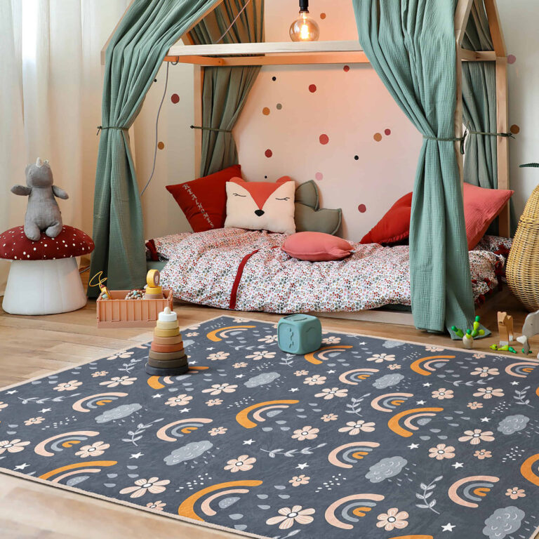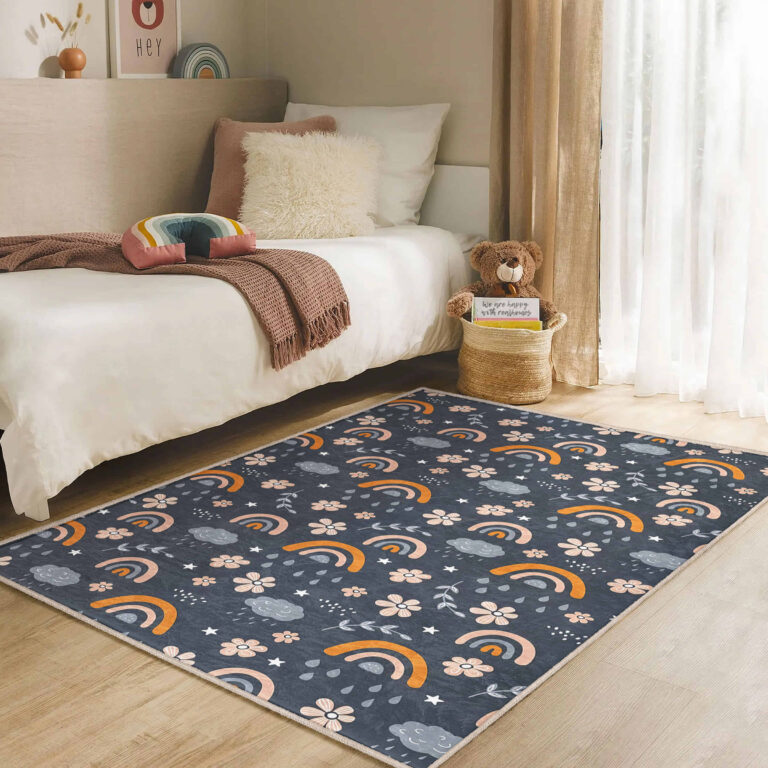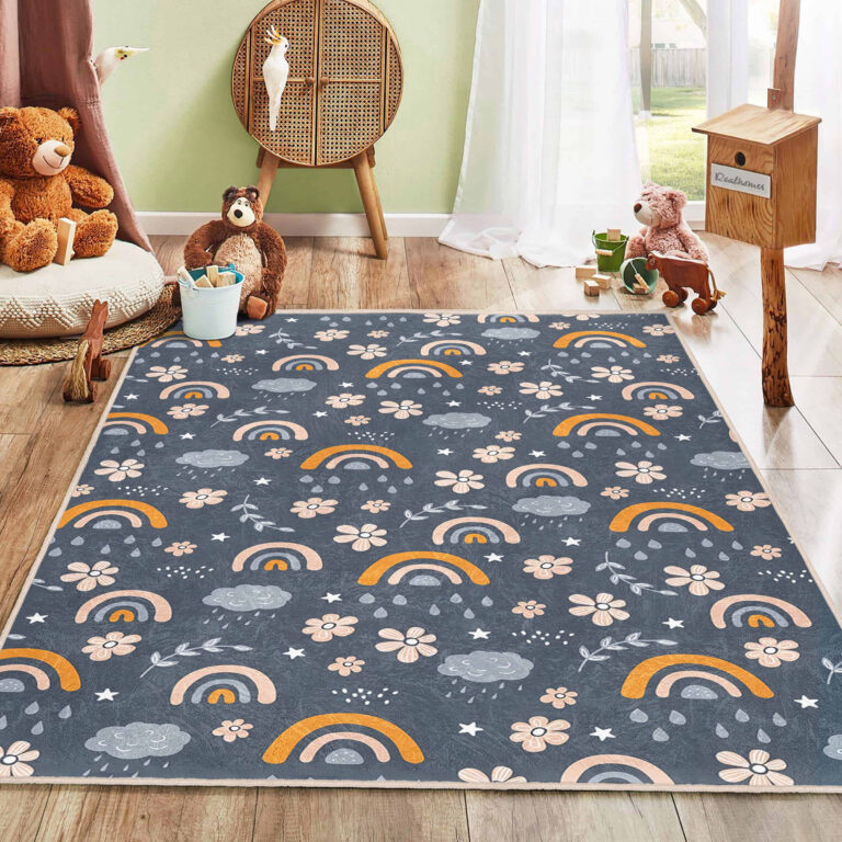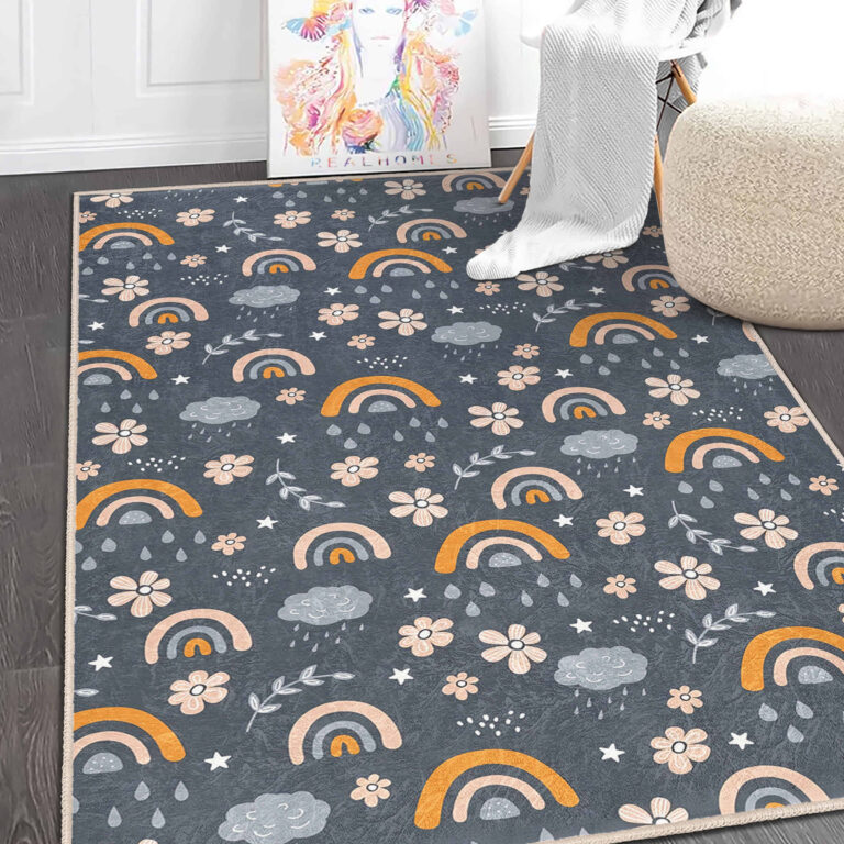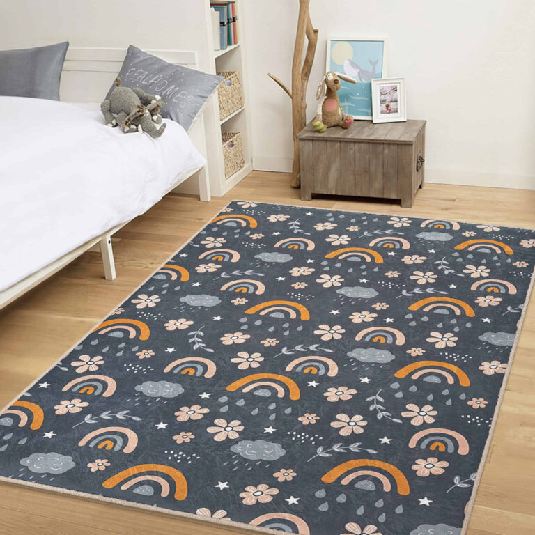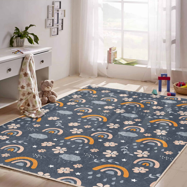 Gökkuşağı Motifli Çiçek Desenli Yıkanabilir Kaymaz Taban Çocuk Halısı