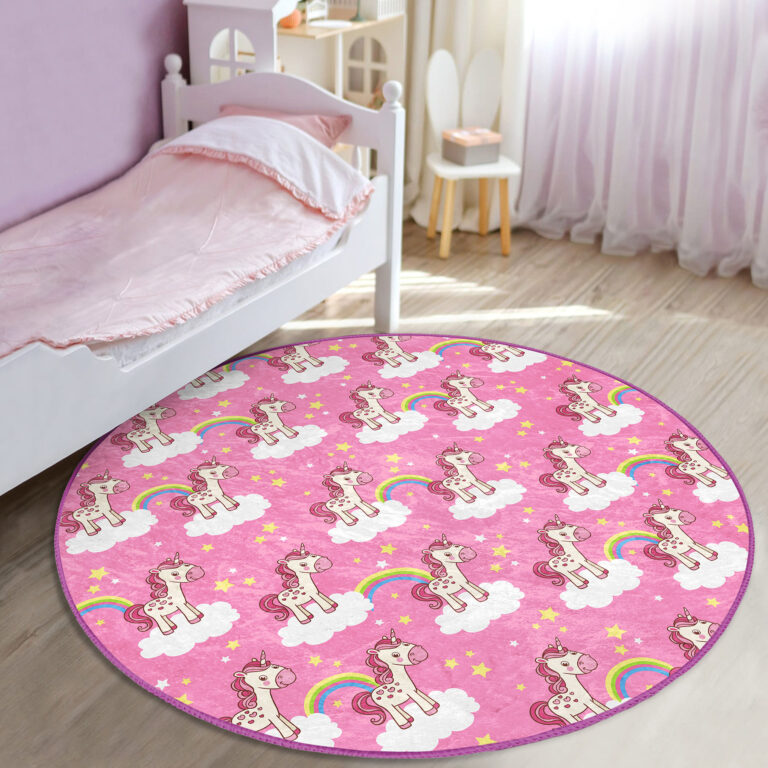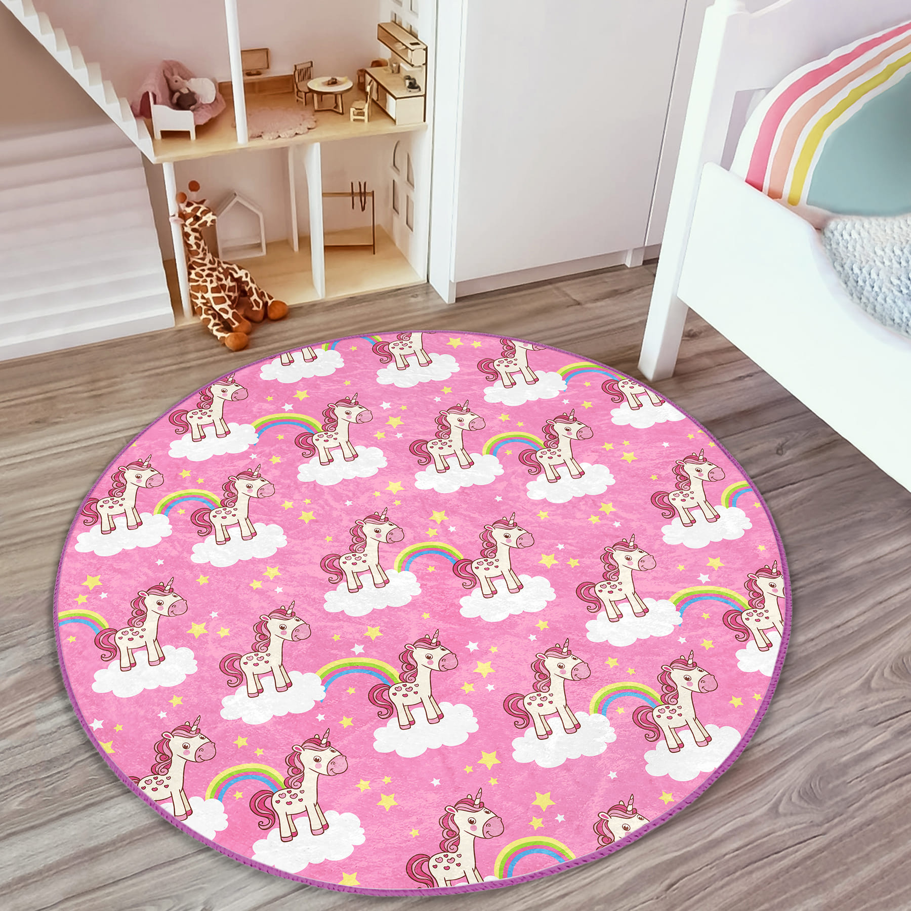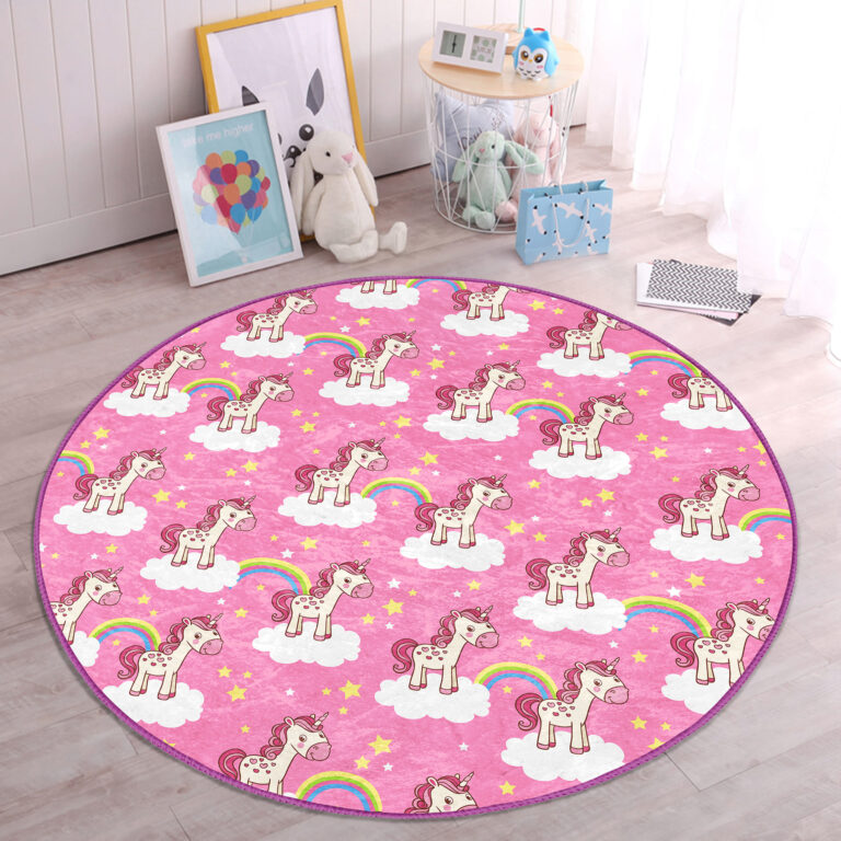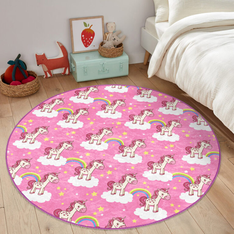 Gökkuşağı Ve Unicorn Motifli Çocuk Odası Makinede Yıkanabilir Kaymaz Tabanlı Yuvarlak Kadife Halı