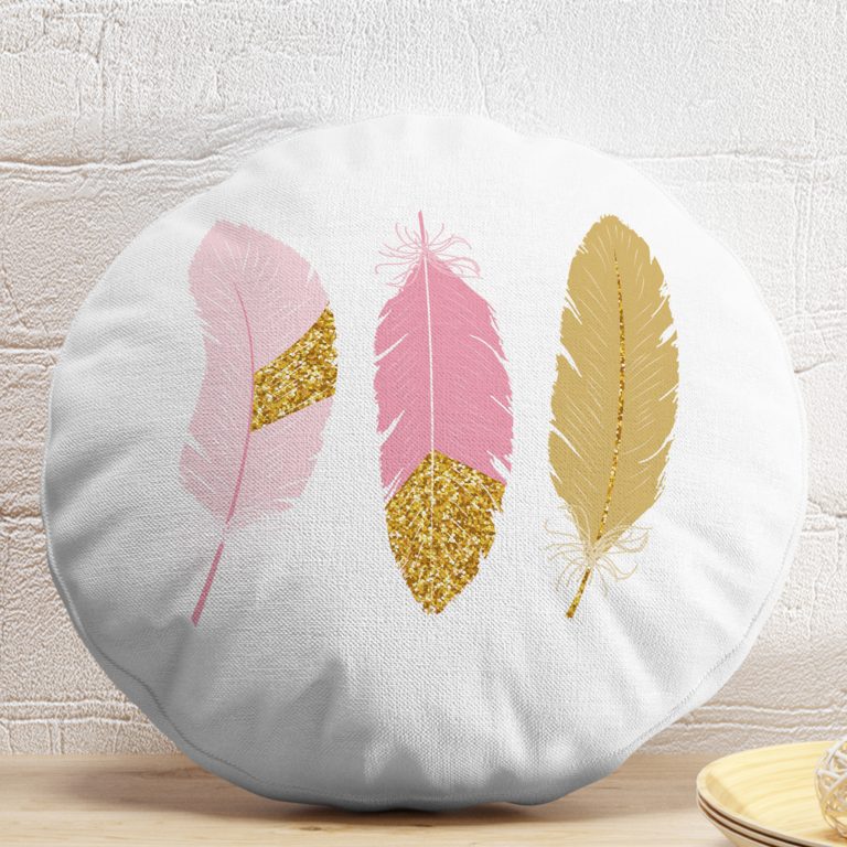 Gold Detaylı Renkli Tüy Tasarımlı Modern Yuvarlak Yastık Kırlent Kılıfı