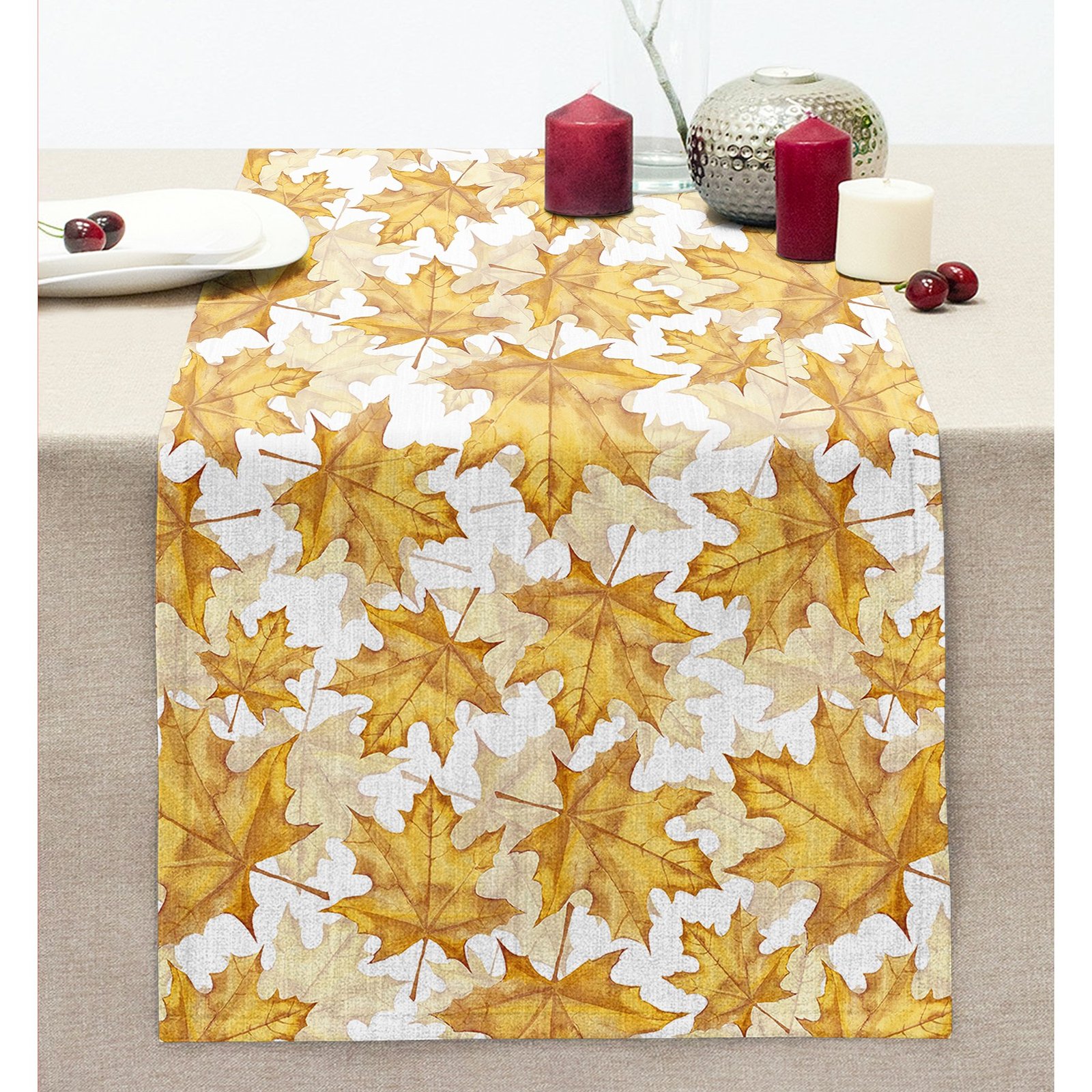 Gold Yaprak Motifli Dijital Baskılı Modern Dikişli Şönil Runner