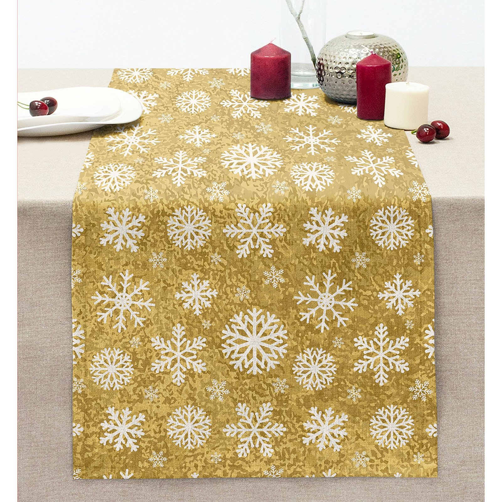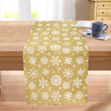 Gold Zemin Üzerinde Beyaz Renkli Kar tanesi Desenli Dijital Baskılı Modern Dikişli Şönil Runner