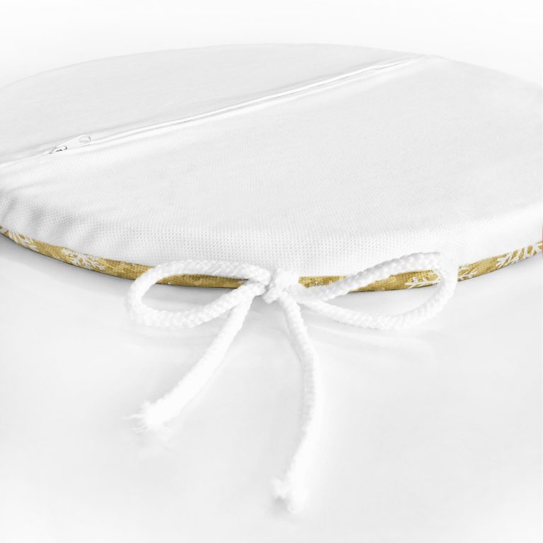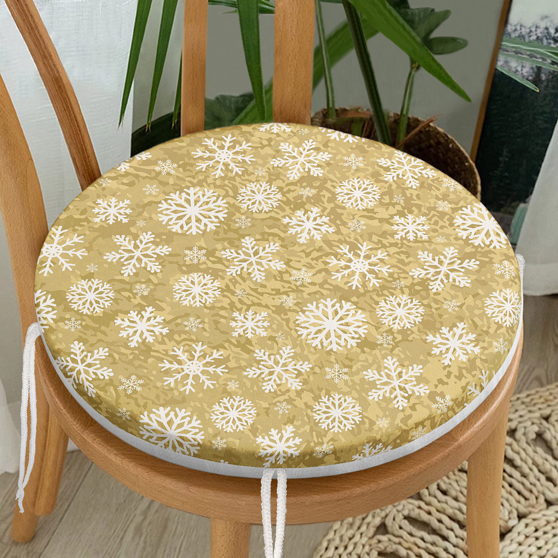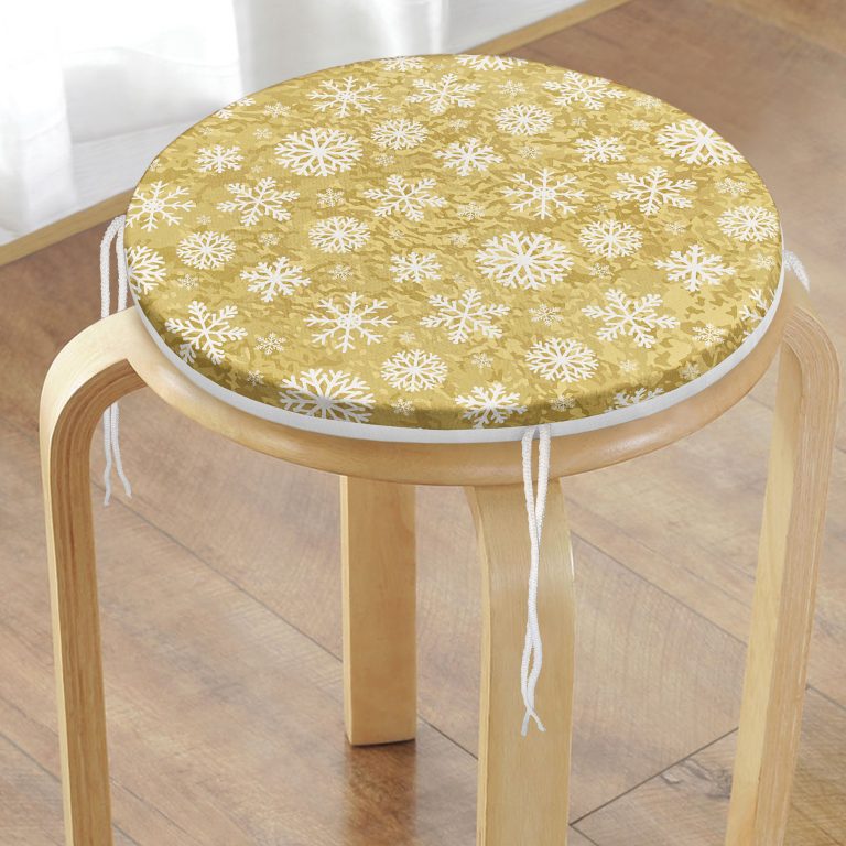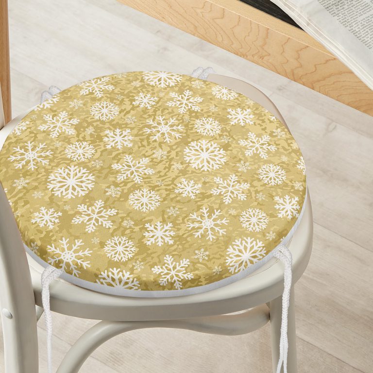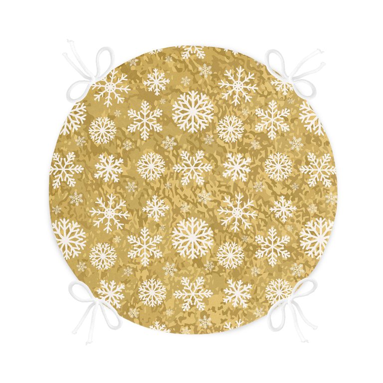 Gold Zemin Üzerinde Beyaz Renkli Kar tanesi Desenli Dijital Baskılı Modern Yuvarlak Fermuarlı Sandalye Minderi