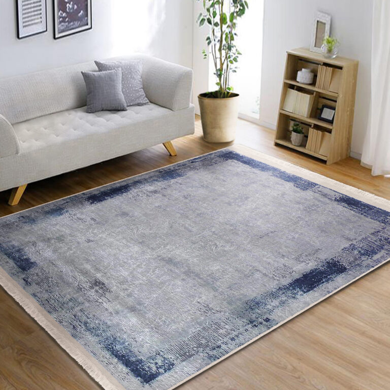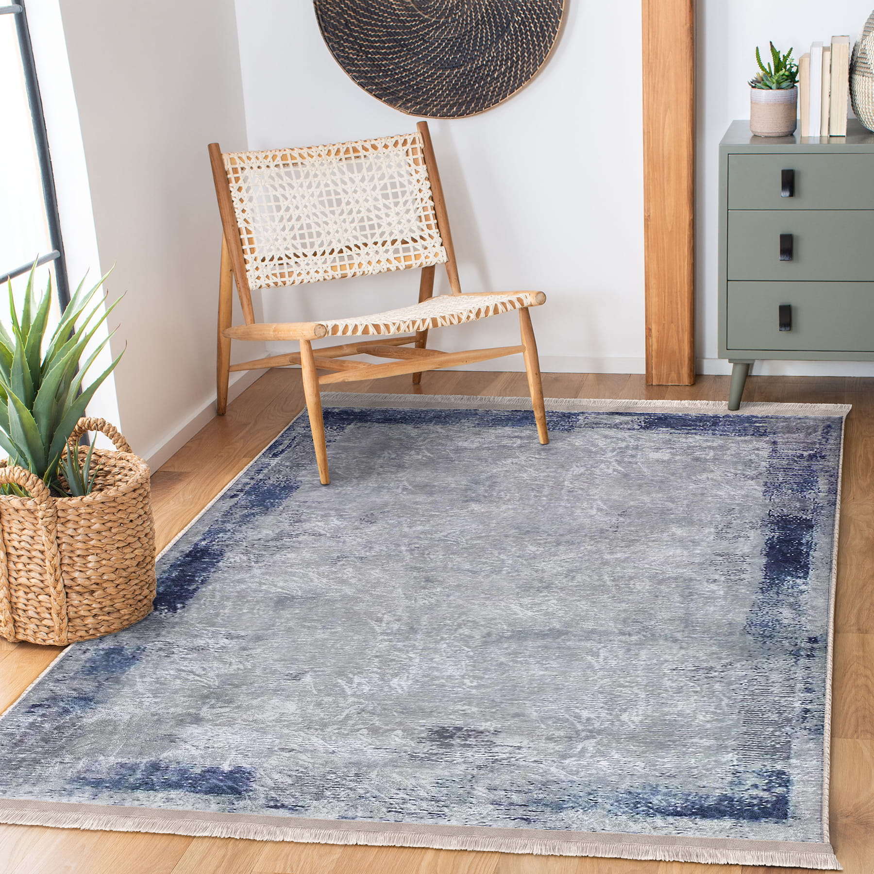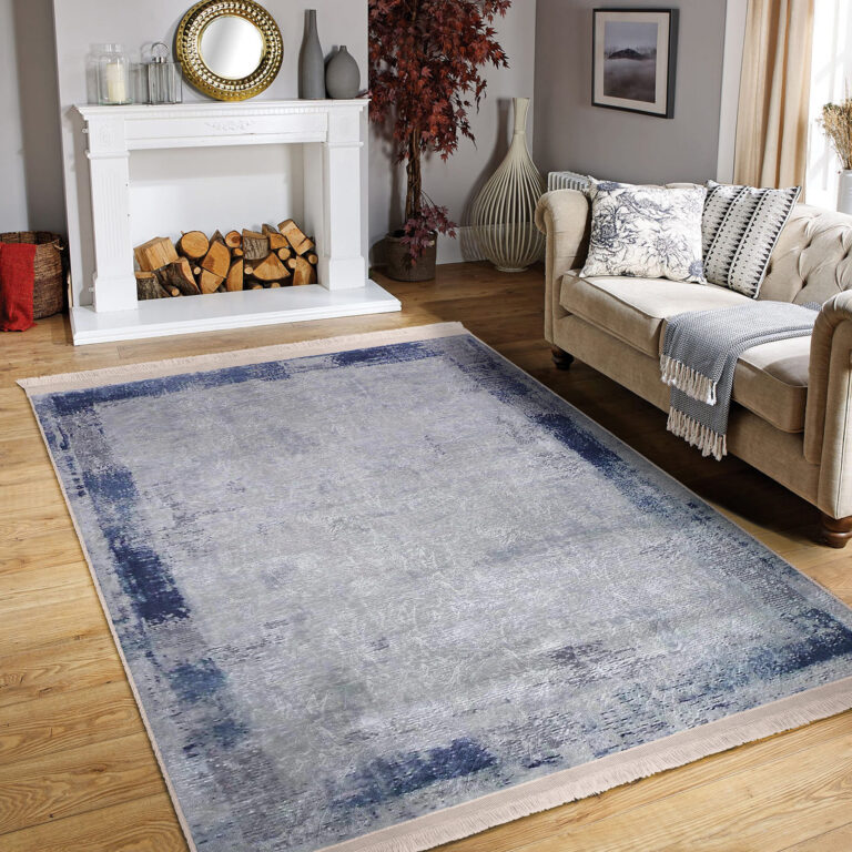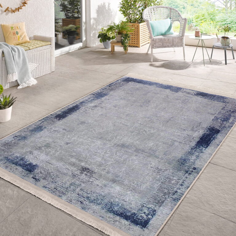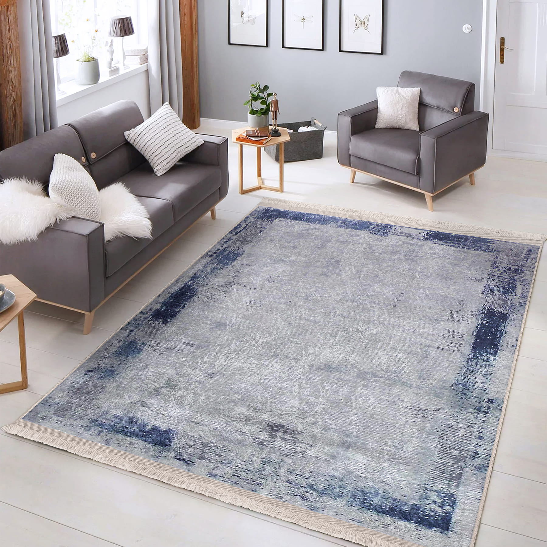 Gri – Mavi Zeminde Çerçeveli Motifli Eskitme Desenli Sade & Şık Eskitme Motifli Salon & Oturma Odası Koridor & Antre Dijital Baskılı Makinede Yıkanabilir Kaymaz Taban Saçaklı Halı