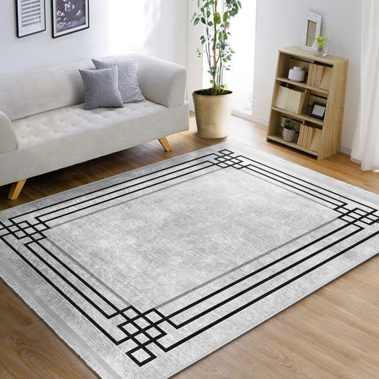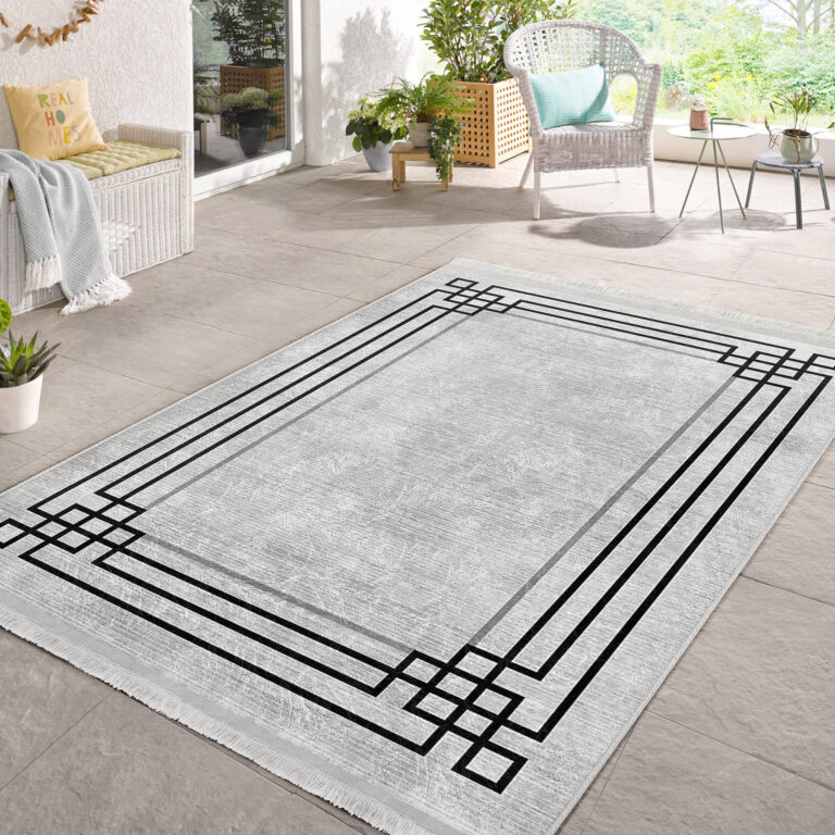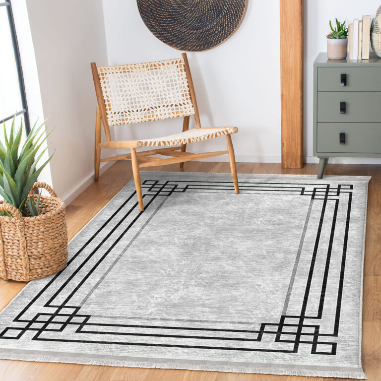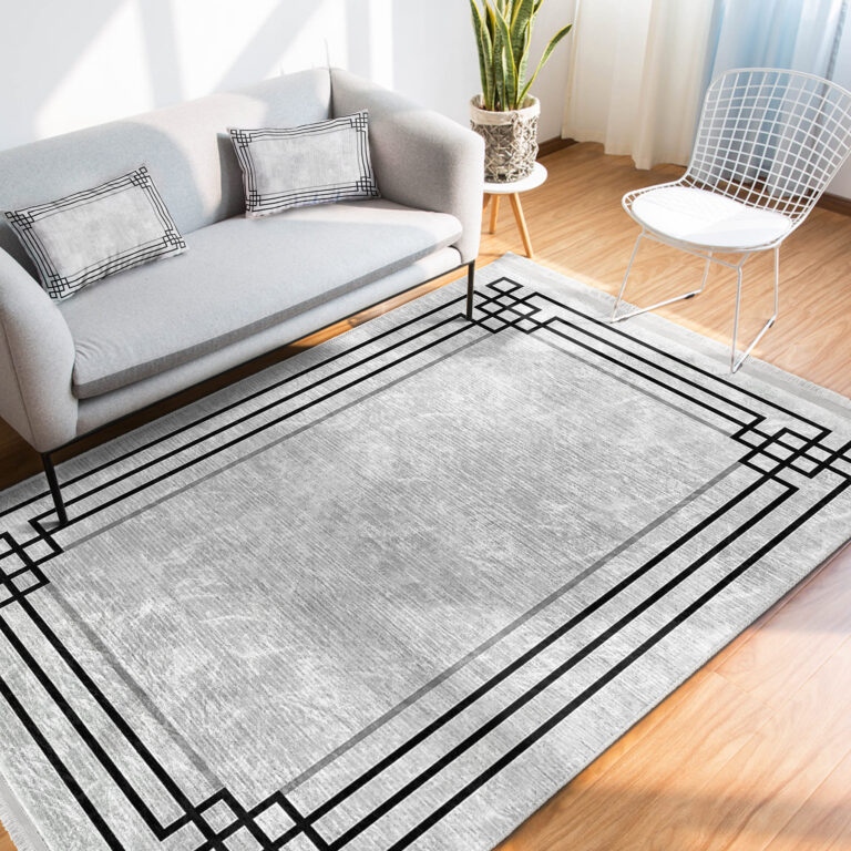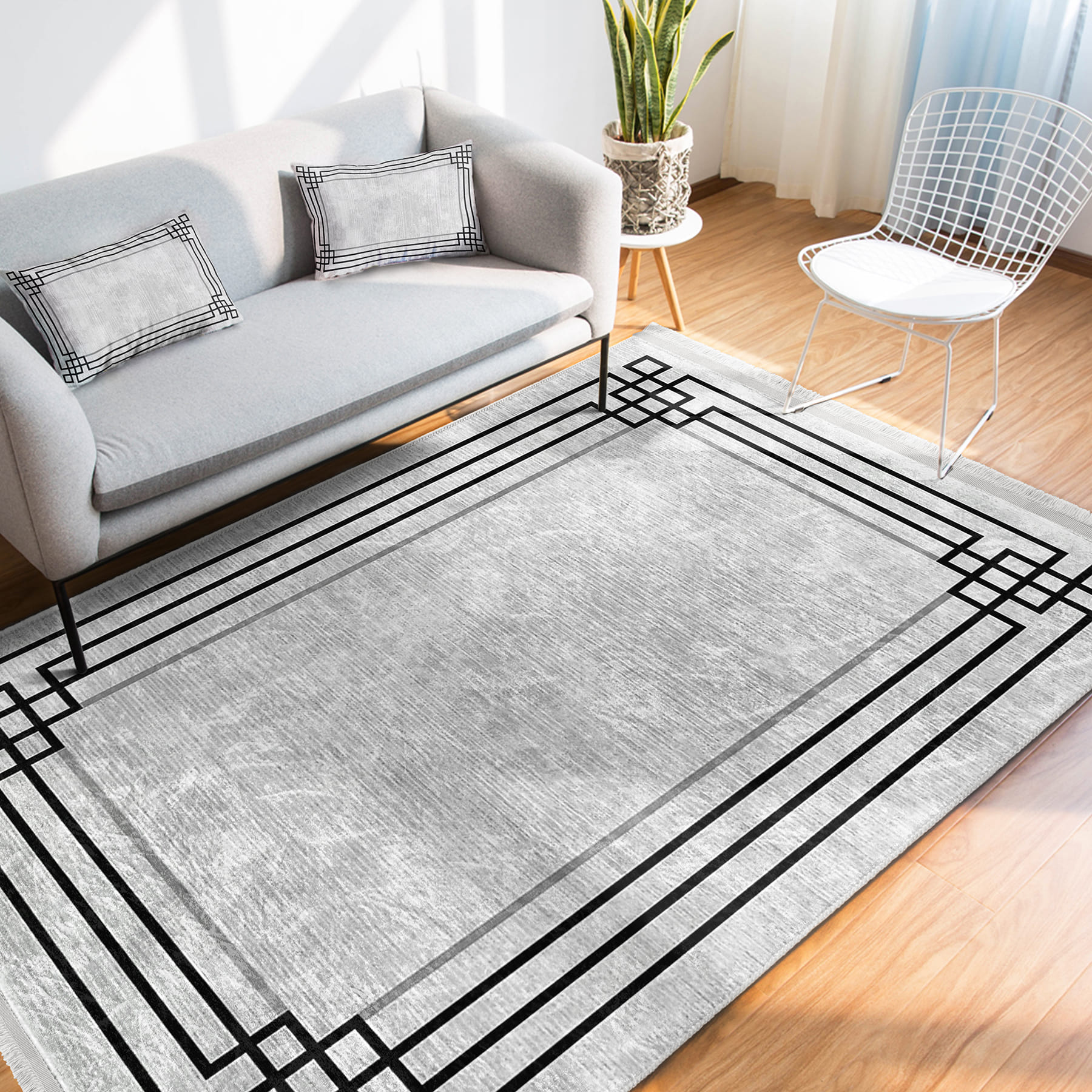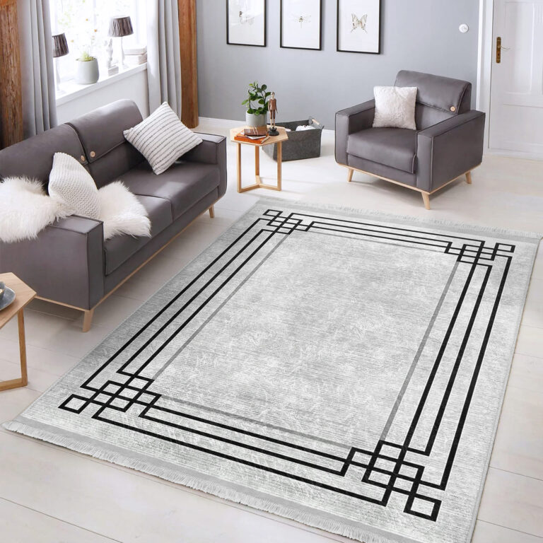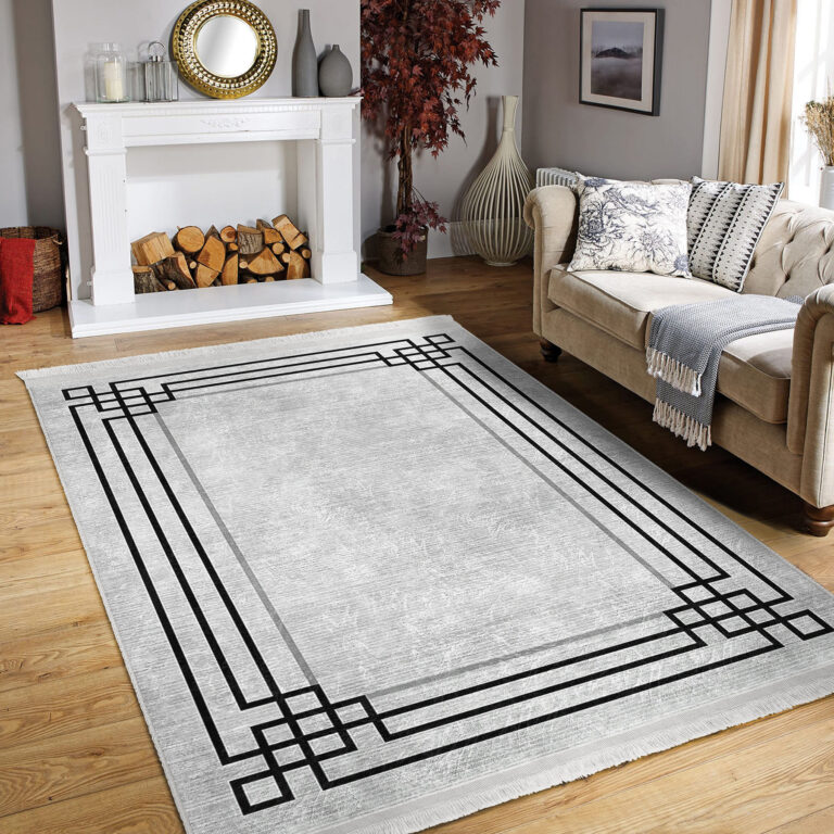 Gri – Siyah Zeminde Çerçeveli Motifli Klasik Desenli Geometrik Sade & Şık Salon & Oturma Odası Yatak Odası Dijital Baskılı Makinede Yıkanabilir Kaymaz Taban Saçaklı Halı