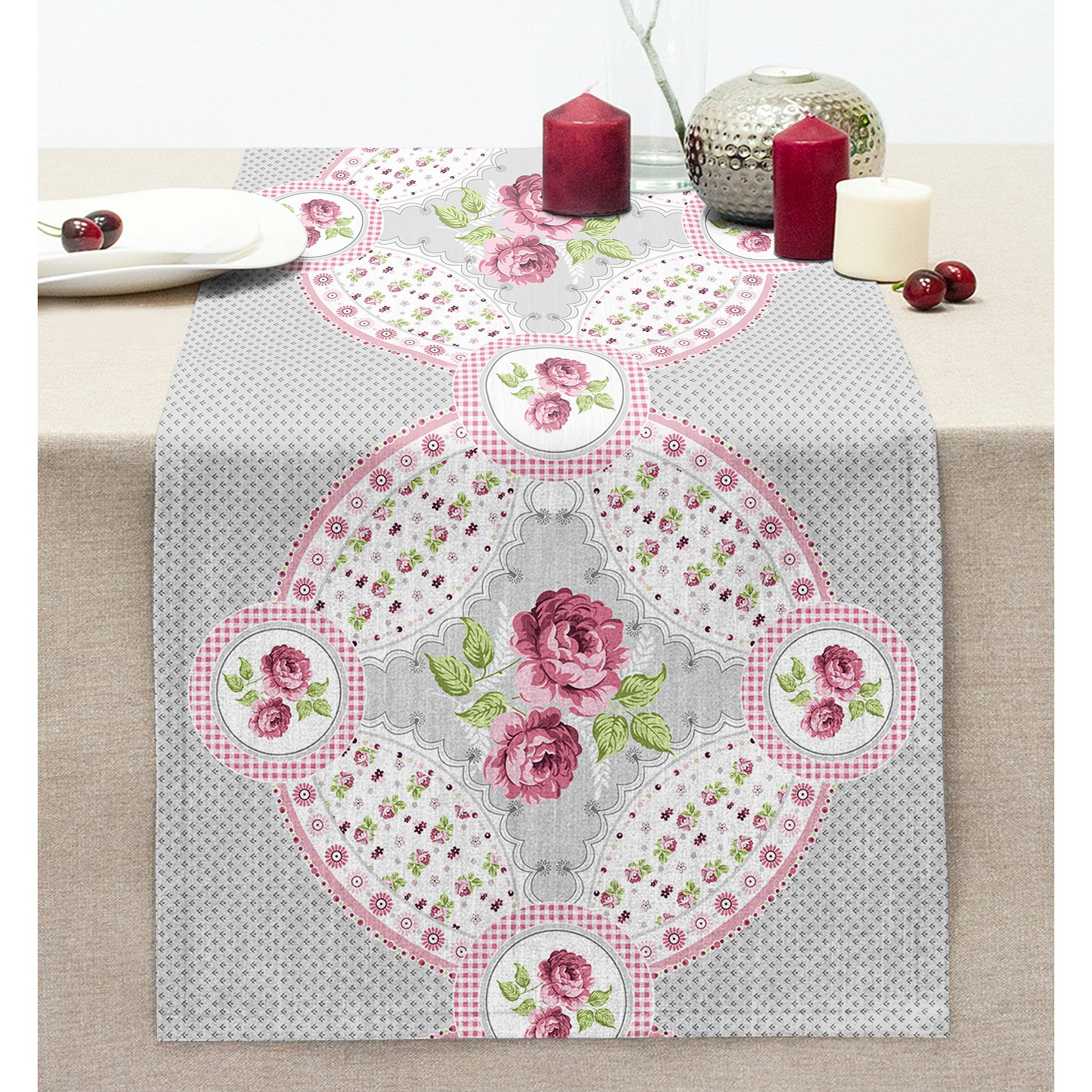 Gri Zemin Gül Temalı Dijital Baskılı Modern Dikişli Şönil Runner