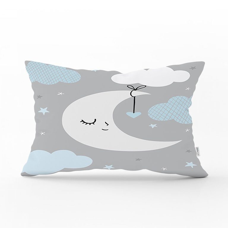 Gri Zemin Mavi Bulut ve Gri Ay Tasarımlı Bebek Odası Dikdörtgen Yastık Kırlent Kılıfı