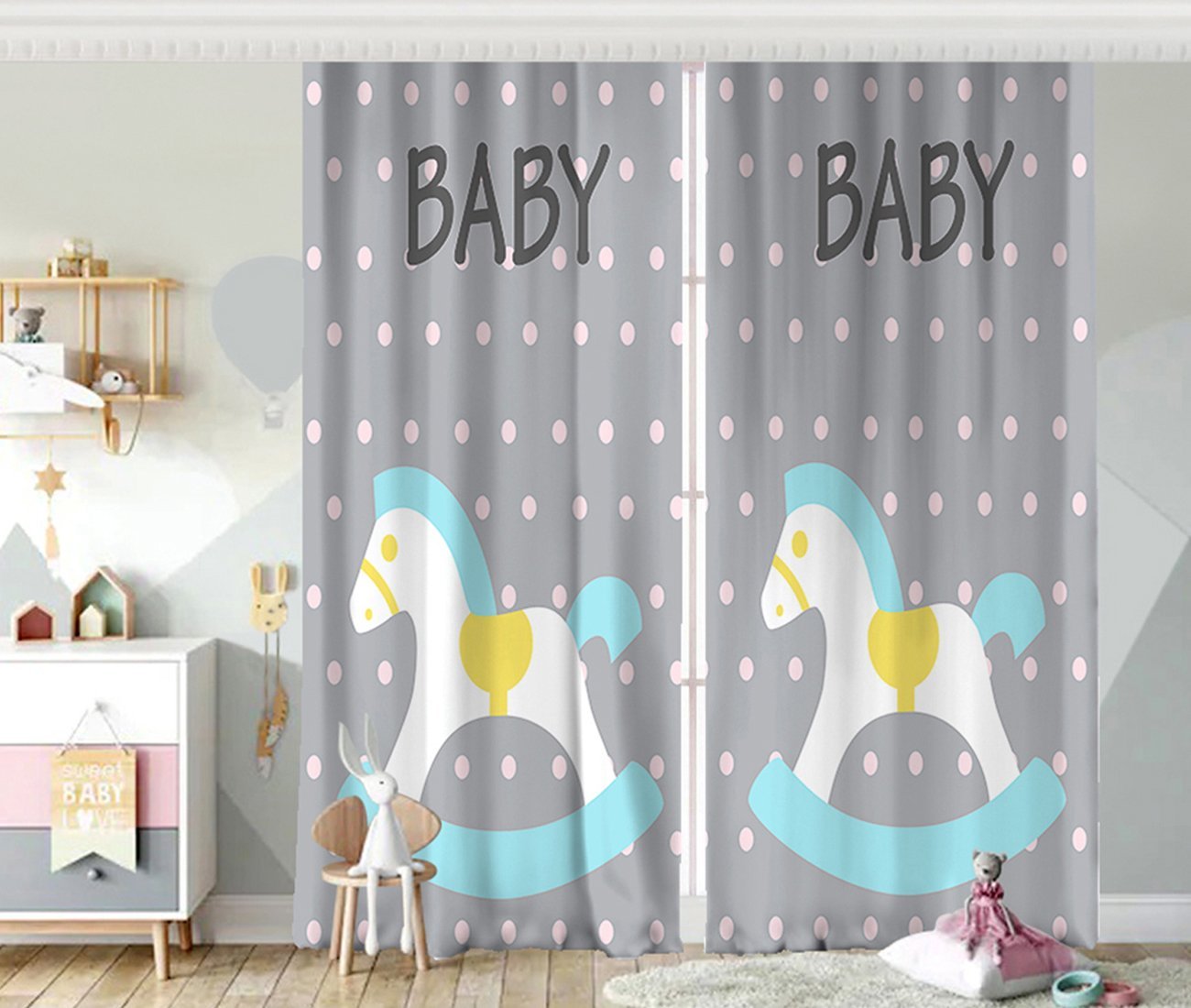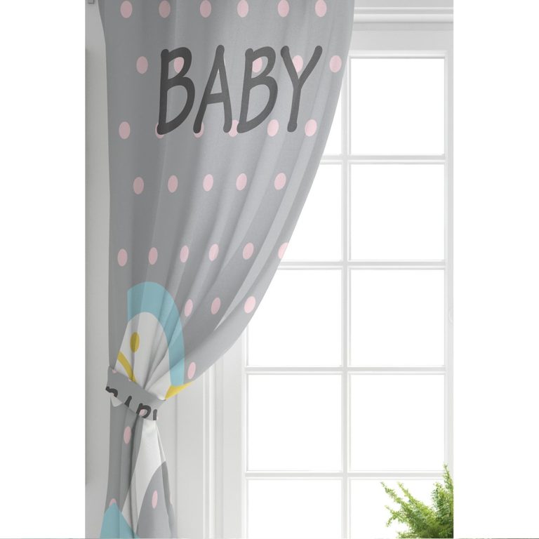 Gri Zeminde Bebek Arabası Desenli Bebek Odası Fon Perde