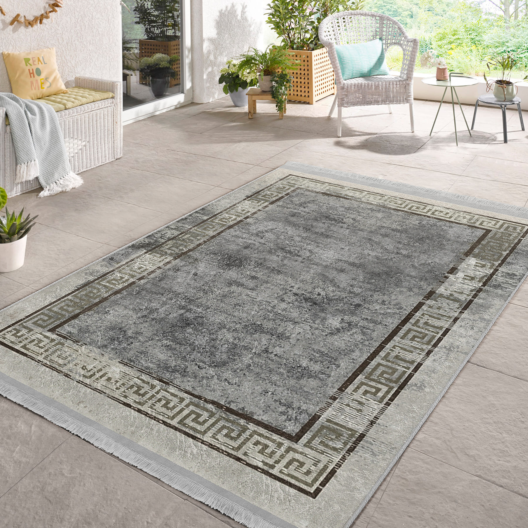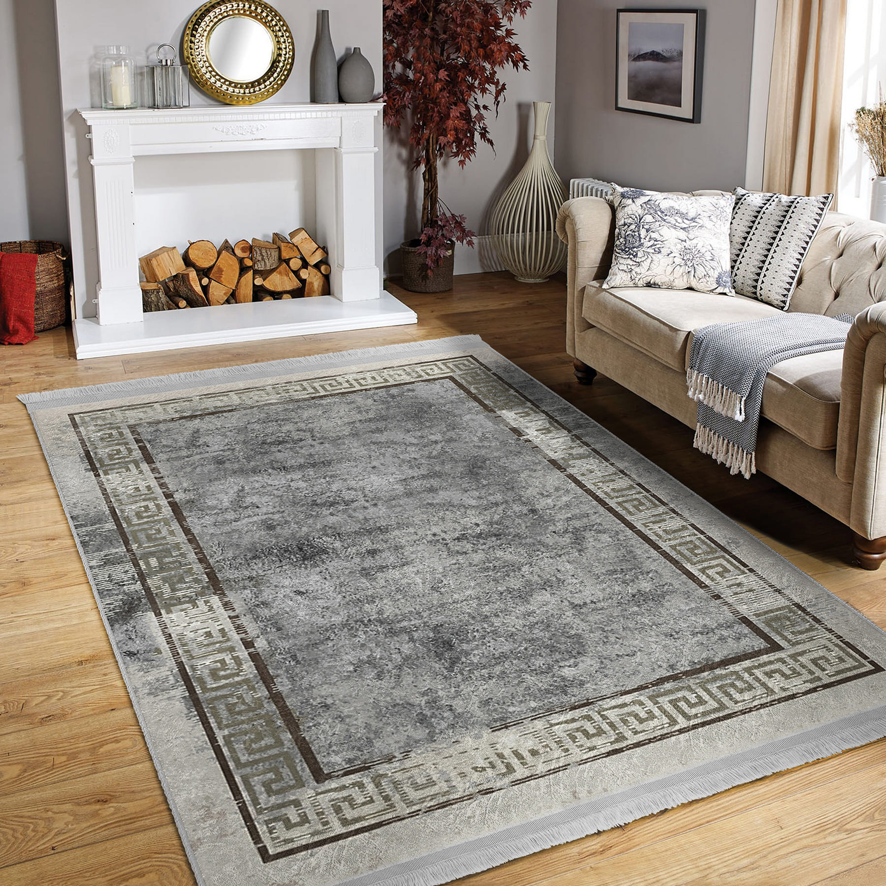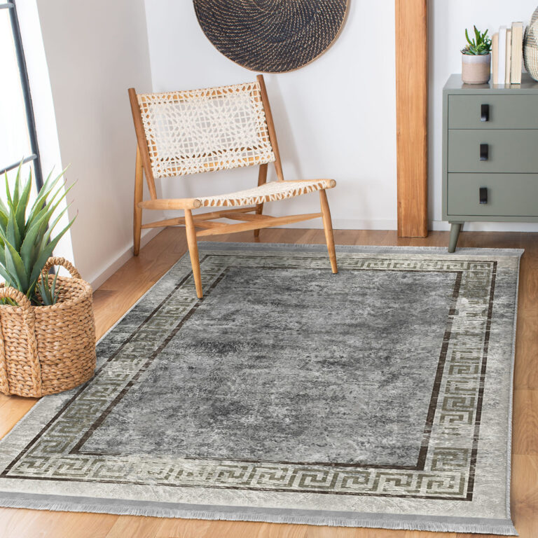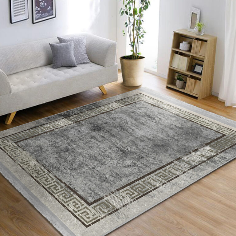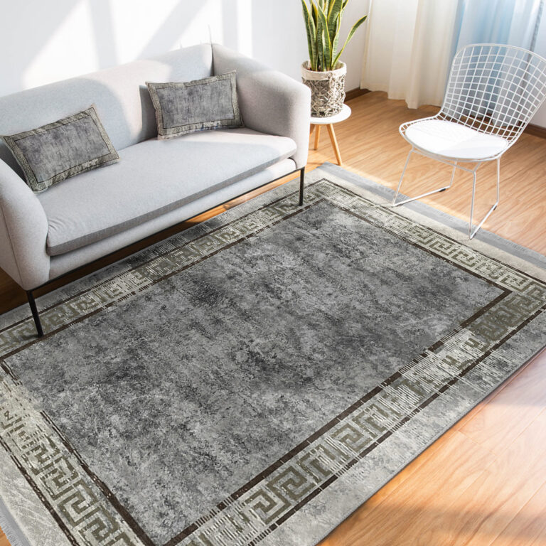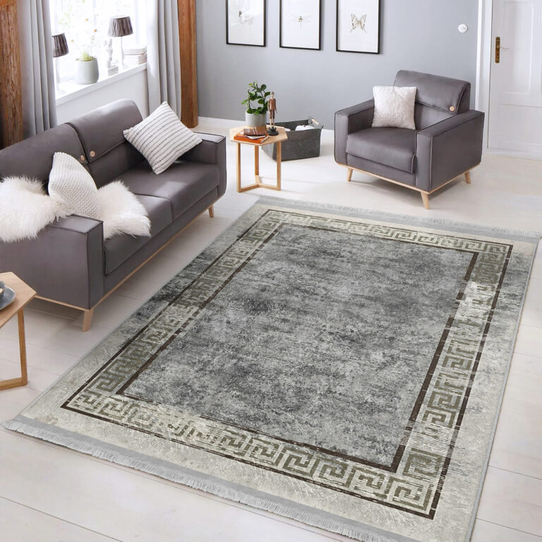 Gri Zeminde Çerçeveli Motifli Antik Desenli Geometrik Eskitme Motifli Salon & Oturma Odası Yatak Odası Dijital Baskılı Makinede Yıkanabilir Kaymaz Taban Saçaklı Halı