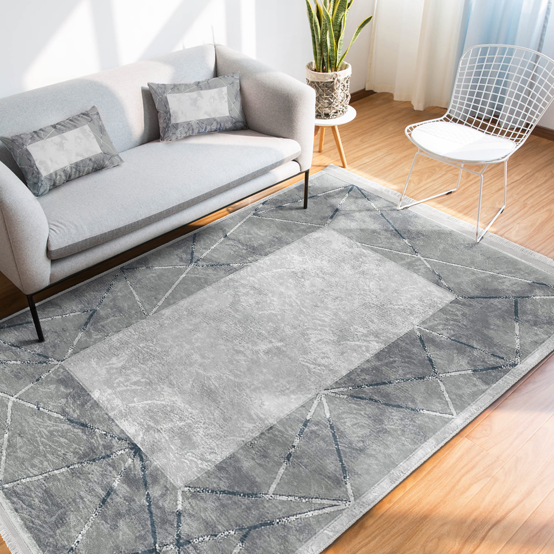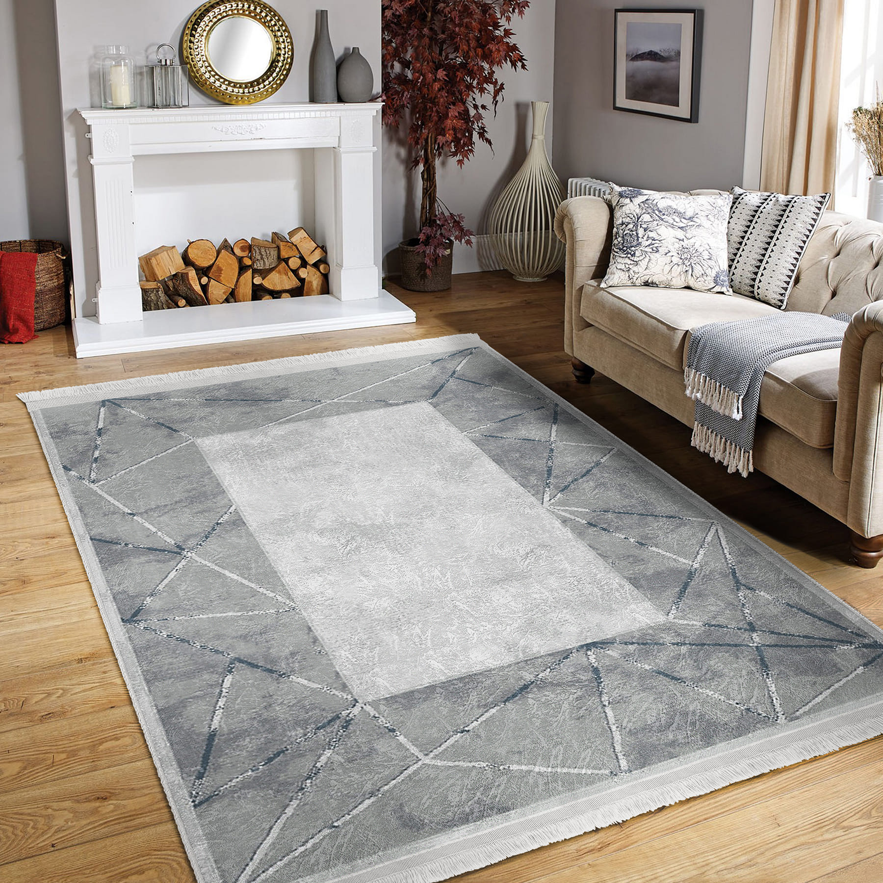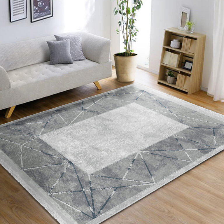 Gri Zeminde Çerçeveli Motifli Mermer Desenli Sade & Şık Geometrik Salon & Oturma Odası Ofis Dijital Baskılı Makinede Yıkanabilir Kaymaz Taban Saçaklı Halı