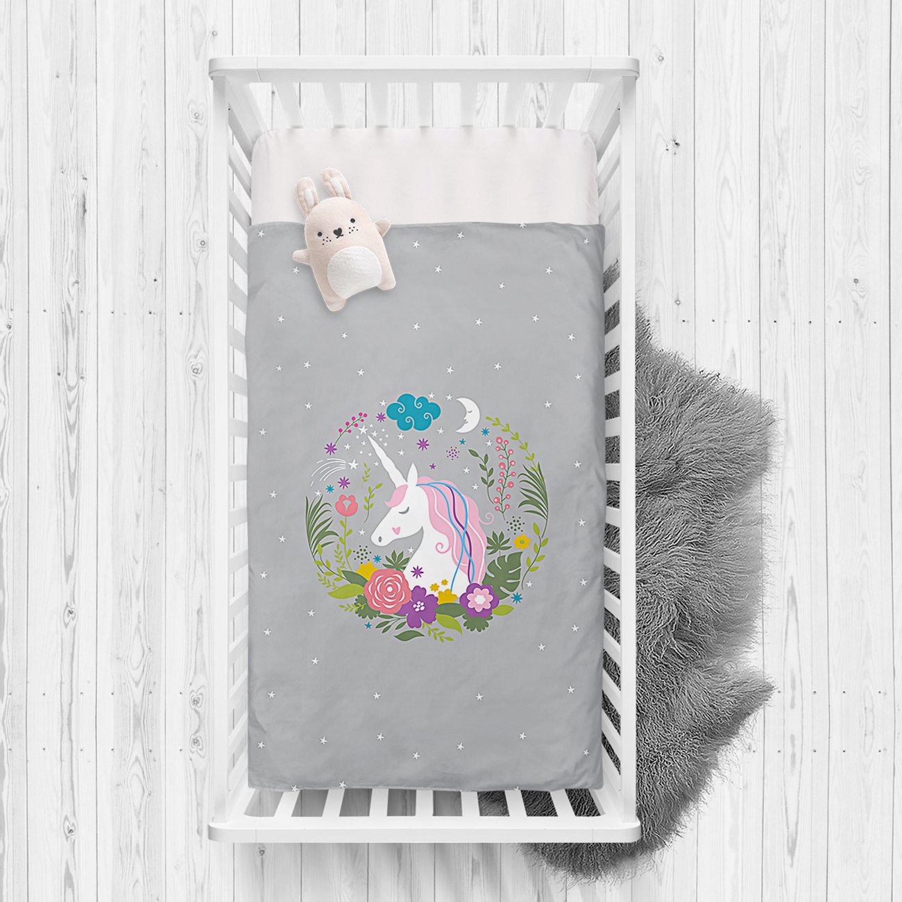Gri Zeminde Unicorn At Desenli Çocuk Odası Yatak Örtüsü