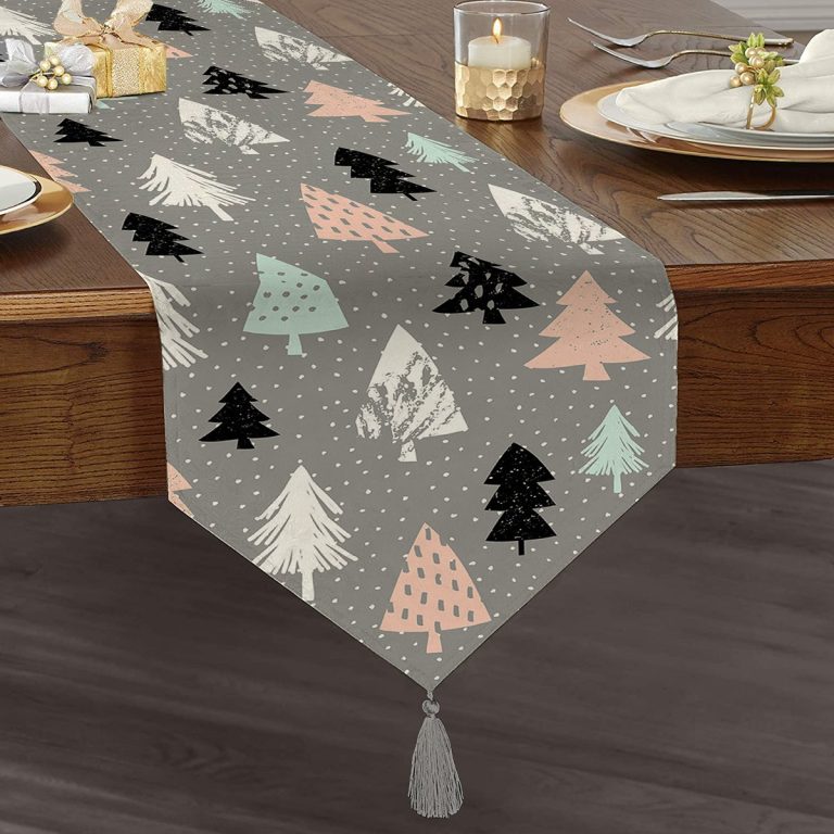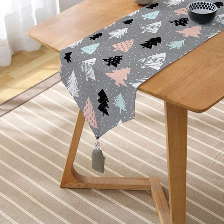 Gri Zeminli Ağaç Temalı Dijital Baskılı Dekoratif Püsküllü Şönil Üçgen Runner