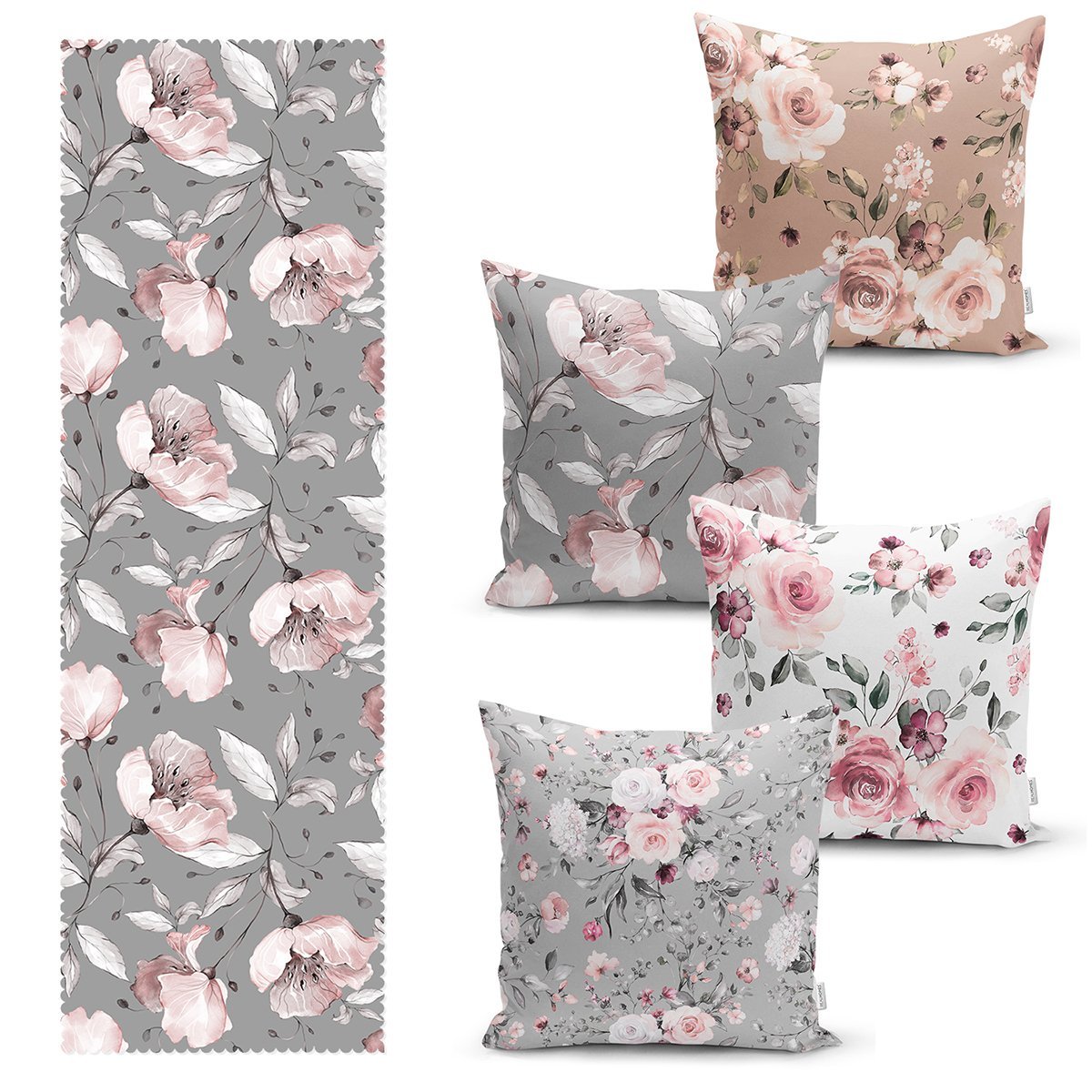 Gri Zeminli Gül Motifli 4 Kırlent Kılıfı ve 1 Runner Seti