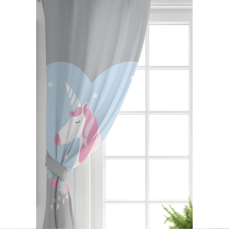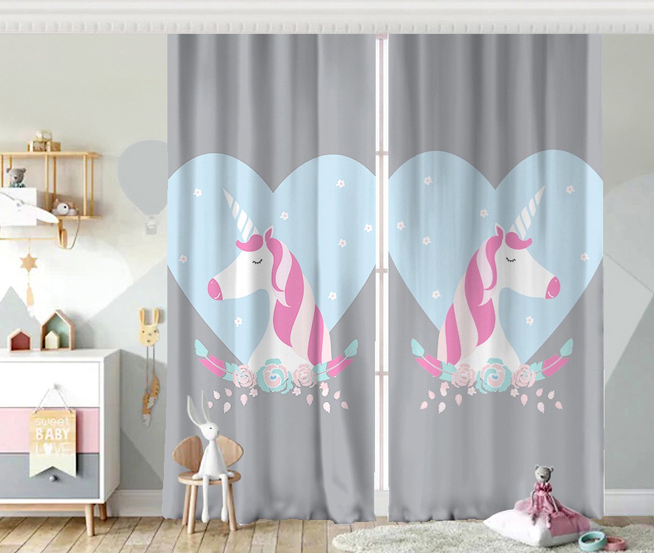 Gri Zeminli Mavi Kalpli Unicorn Desenli Çocuk Odası Fon Perde