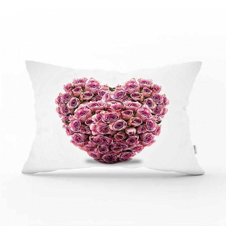 Güllü Kalp Dijital Baskılı Dekoratif Dikdörtgen Yastık Kırlent Kılıfı