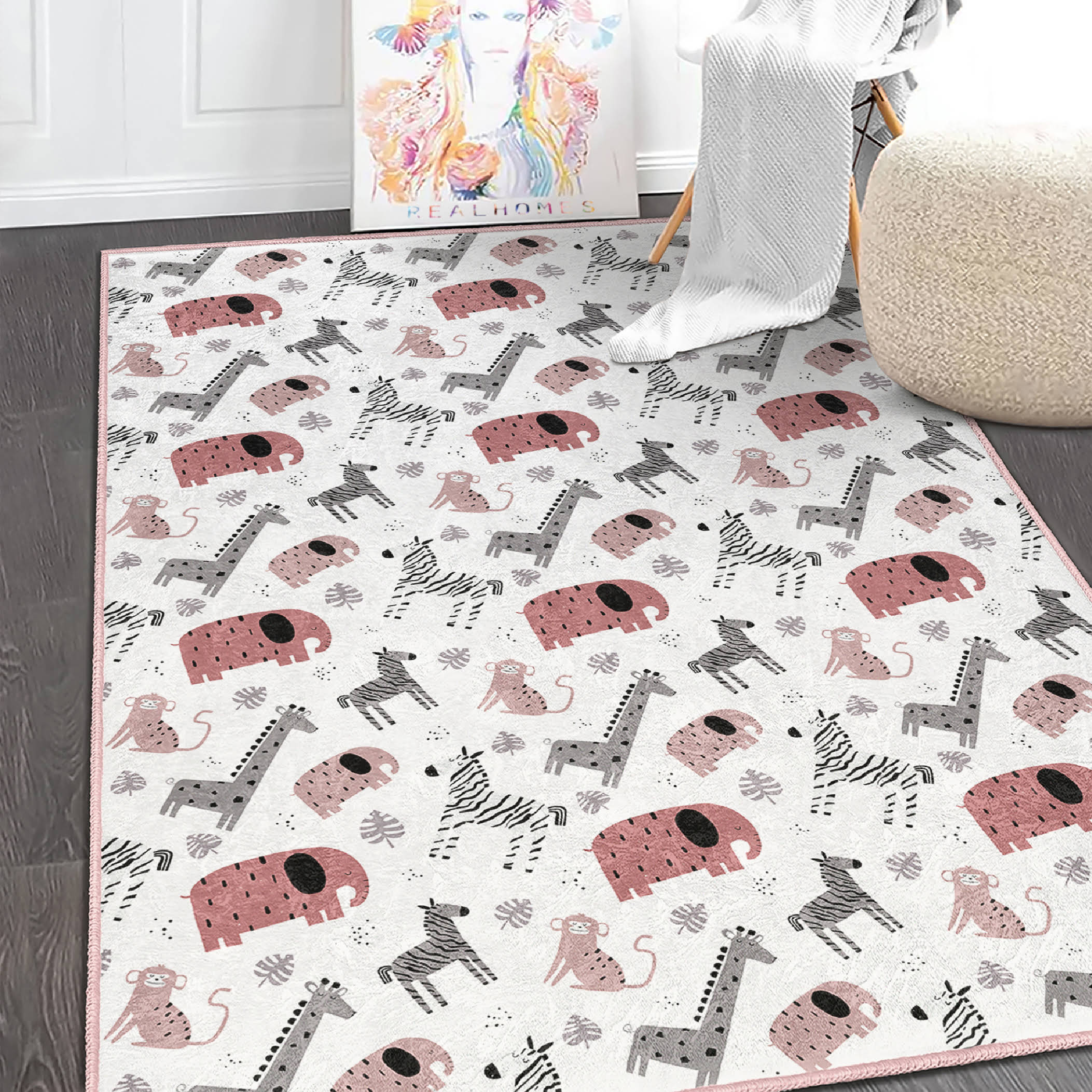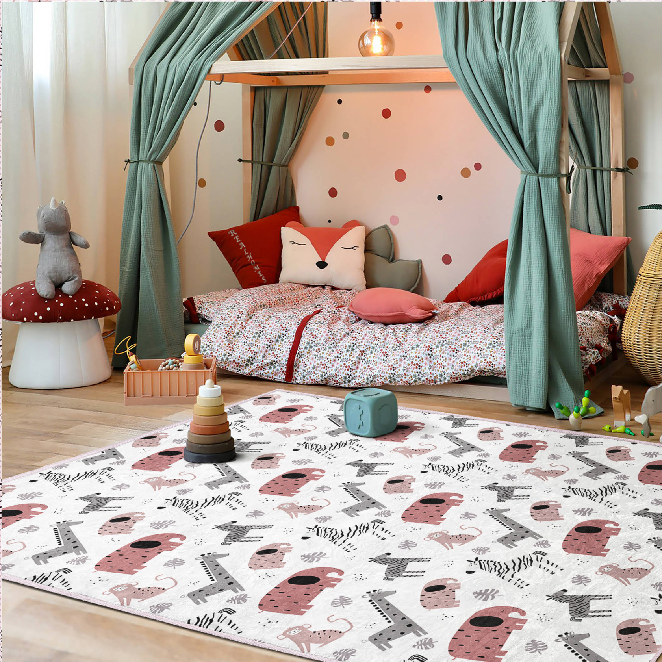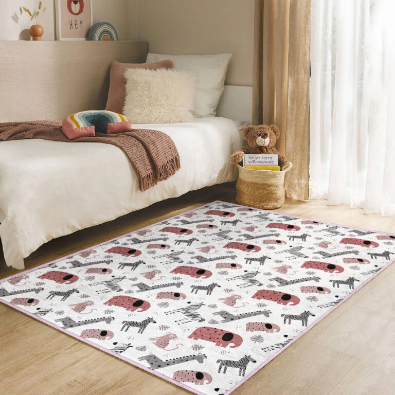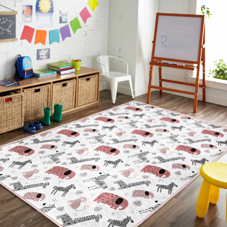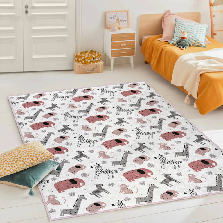 Hayvan Figürlü Renkli Çocuk Halısı – Dikdörtgen Yıkanabilir Kaymaz Tabanlı Eğlenceli Tasarım