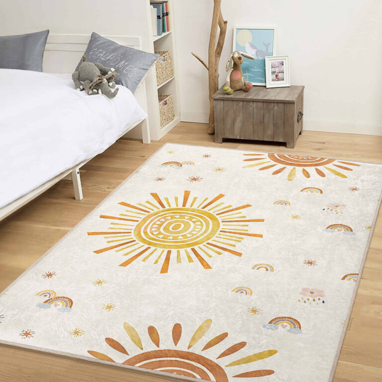 Ilgın Sarısı Güneş Desenli Renkli Çocuk Halısı – Makinede Yıkanabilir Kaymaz Tabanlı Ürün