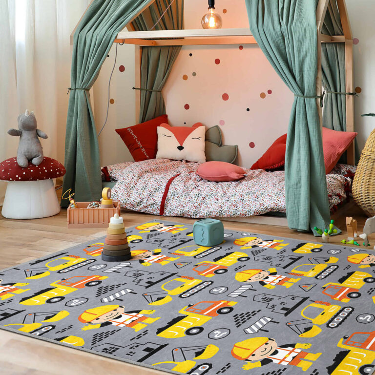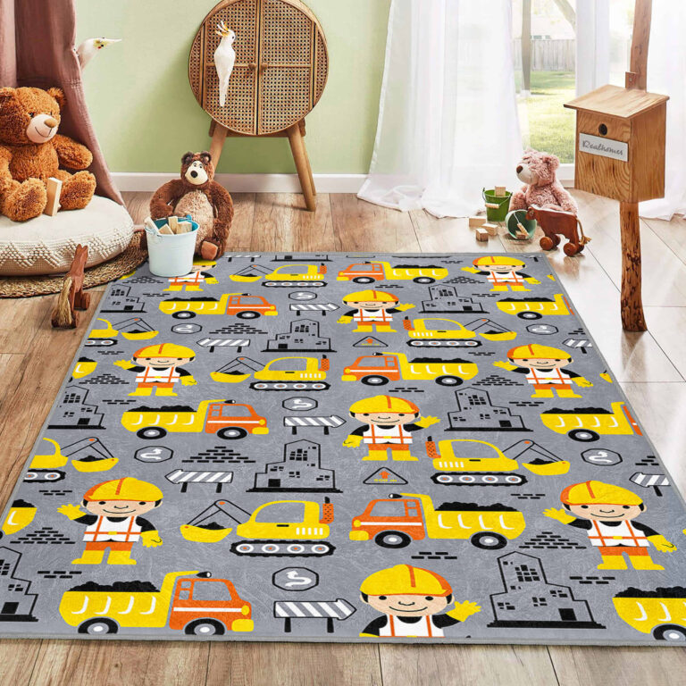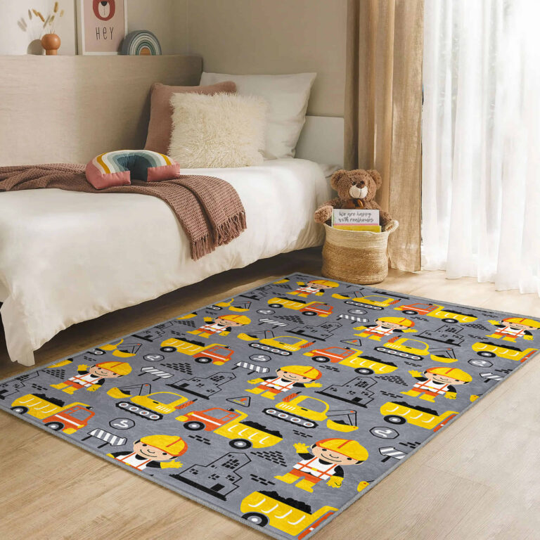 İnşaat Temalı Canlı Renklerde Çocuk Halısı – Makinede Yıkanabilir Kaymaz Tabanlı Dikdörtgen Halı