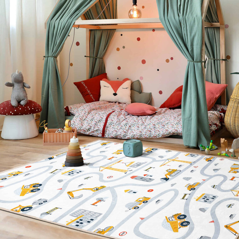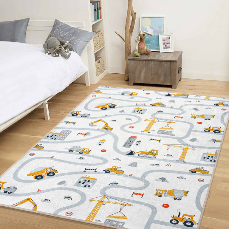 İnşaat Temalı Renkli Çocuk Halısı – Yıkanabilir Kaymaz Tabanlı Dikdörtgen Halı