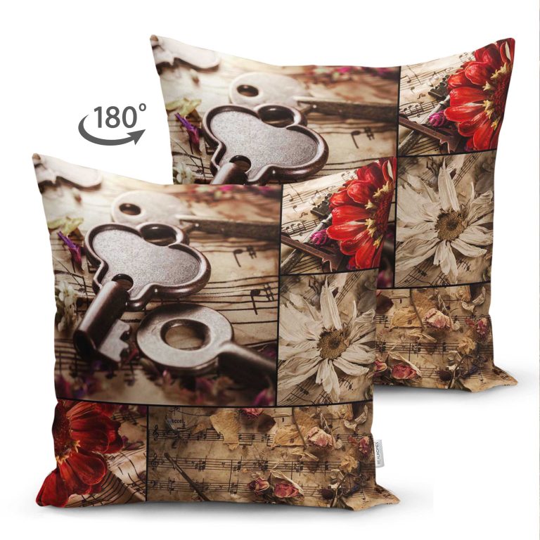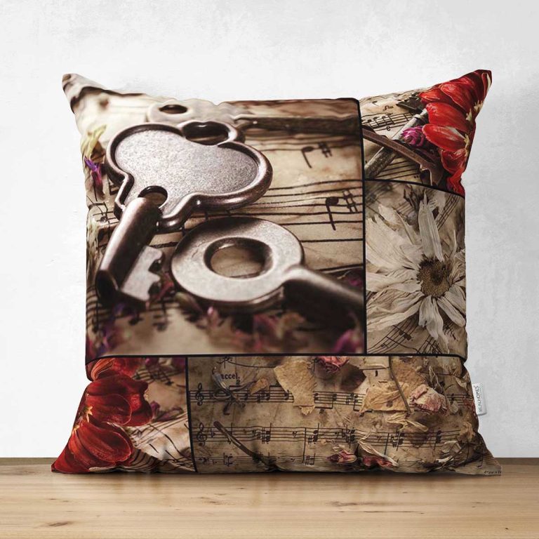 Kağıt Üzerinde Çiçek Ve Anahtar Desenli Dijital Baskılı Dekoratif Modern Süet Yastık Kırlent Kılıfı
