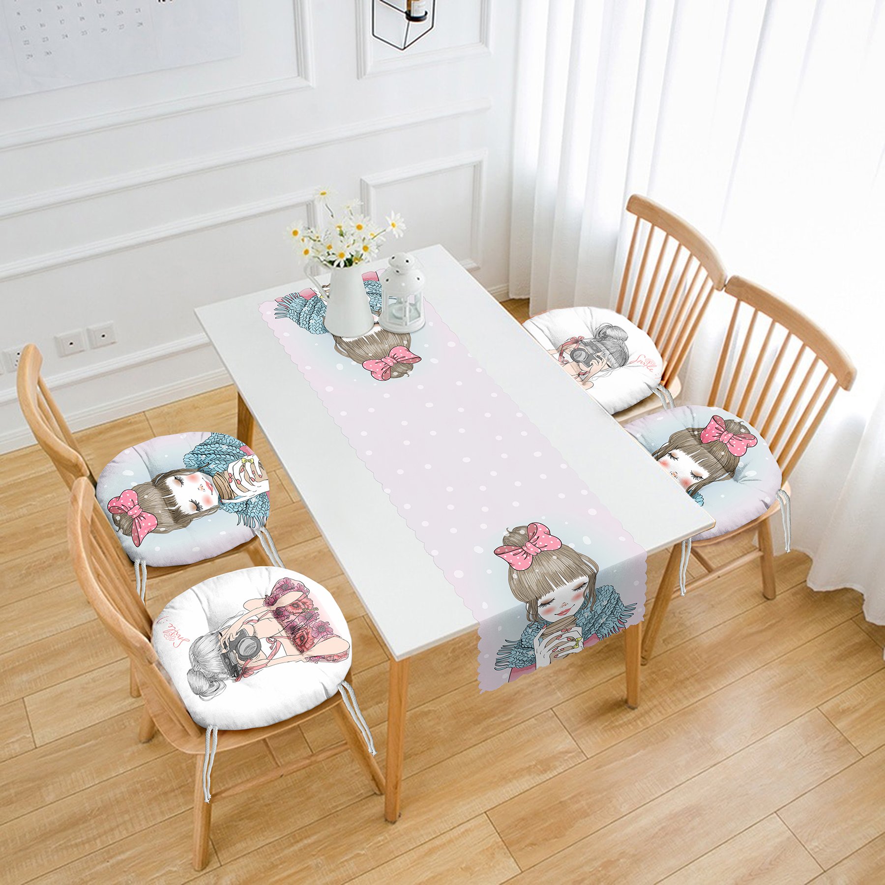Kahve İçen Kız & Fotoğraf Çeken Kız Tasarımlı 4 Yuvarlak Pofidik Sandalye Minderi ve 1 Runner Seti