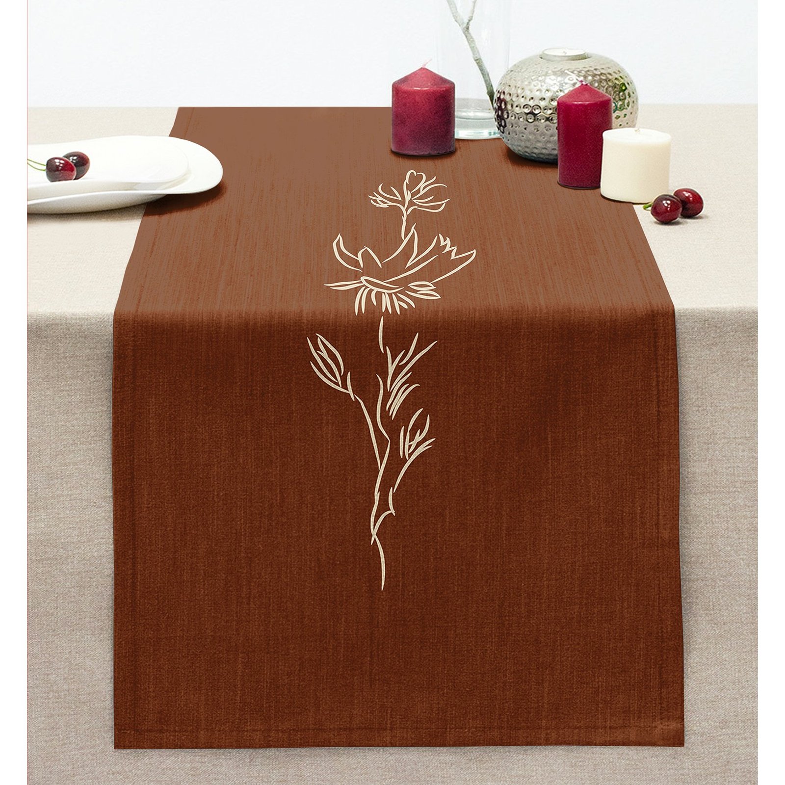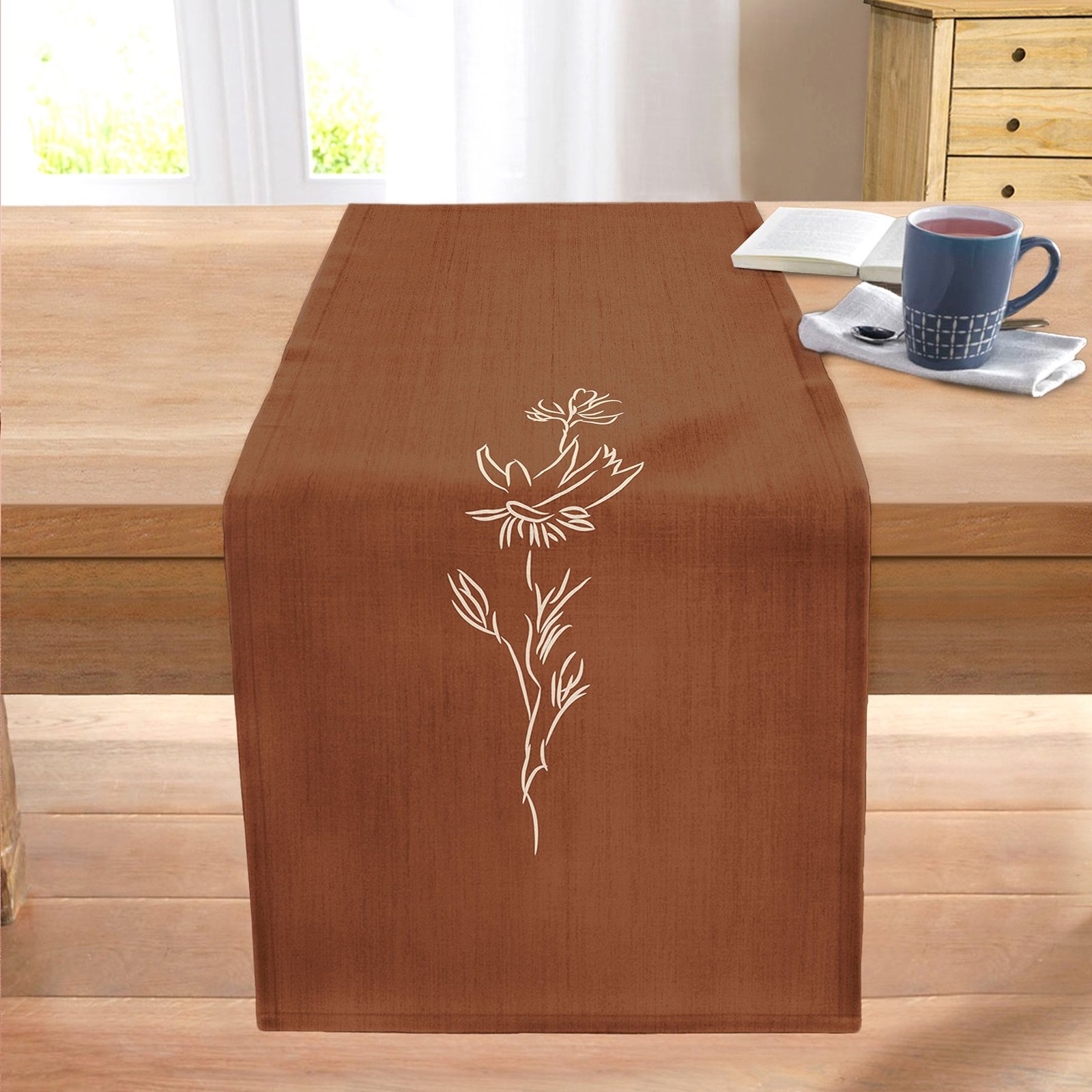 Kahve Zemin Minimalist Çizimli Dijital Baskılı Modern Dikişli Şönil Runner