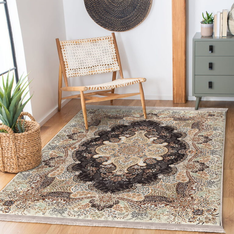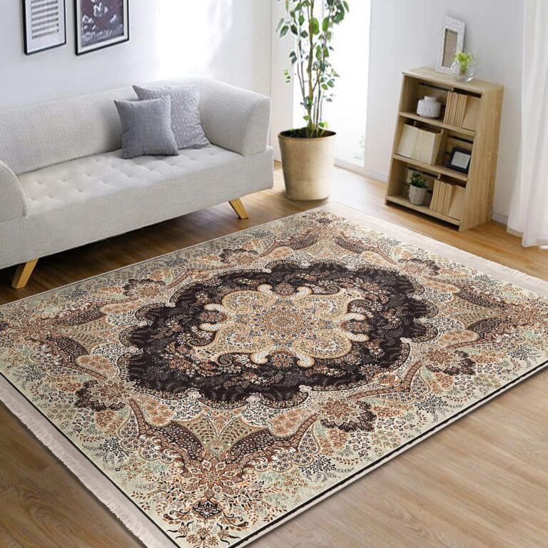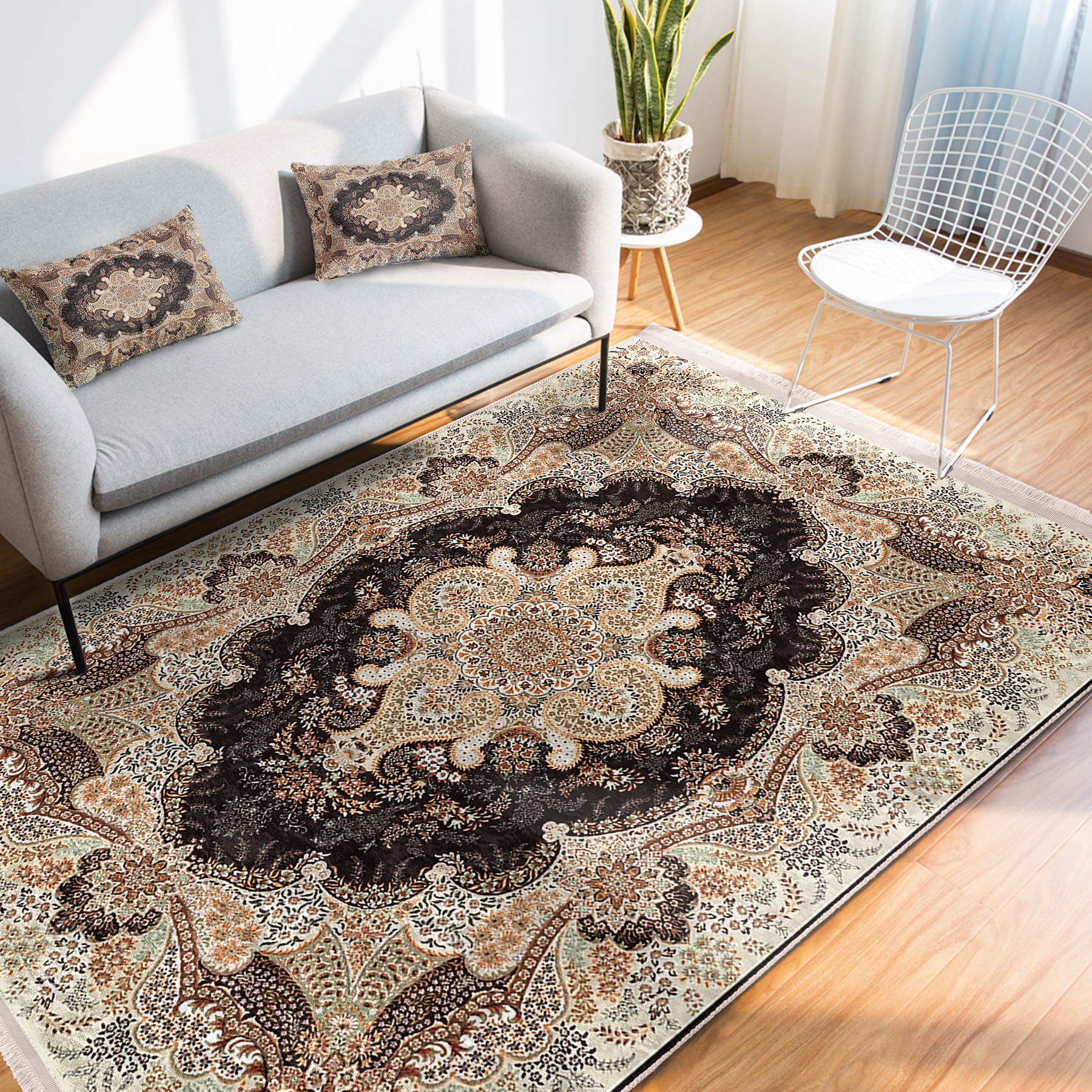 Kahverengi – Bej Zeminde Pers Motifli Dokuma Desenli Avangarde Eskitme Motifli Salon & Oturma Odası Yatak Odası Dijital Baskılı Makinede Yıkanabilir Kaymaz Taban Saçaklı Halı
