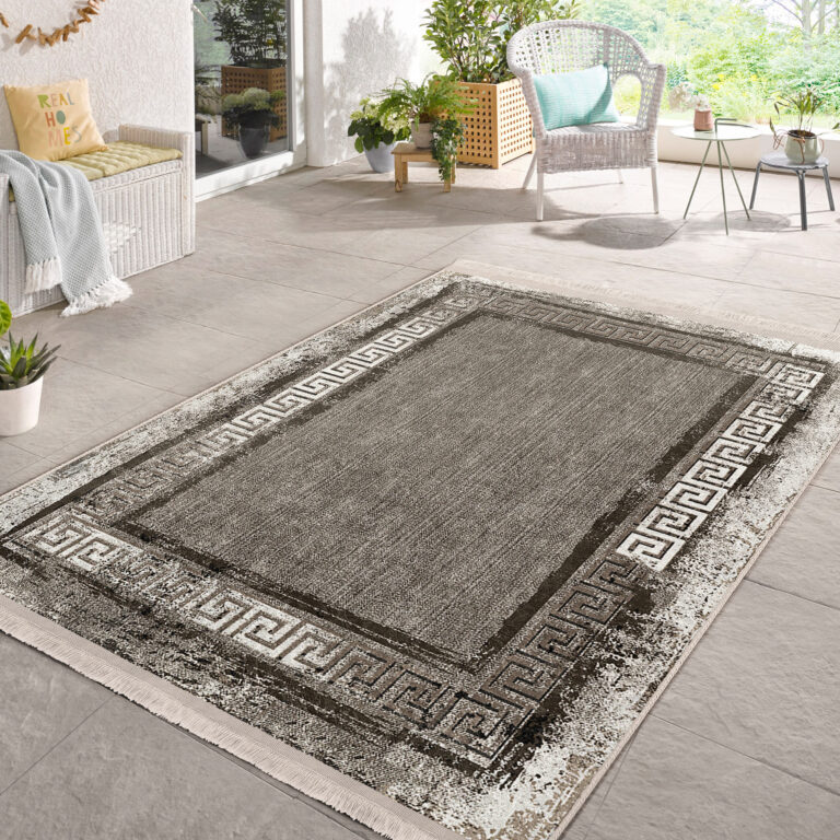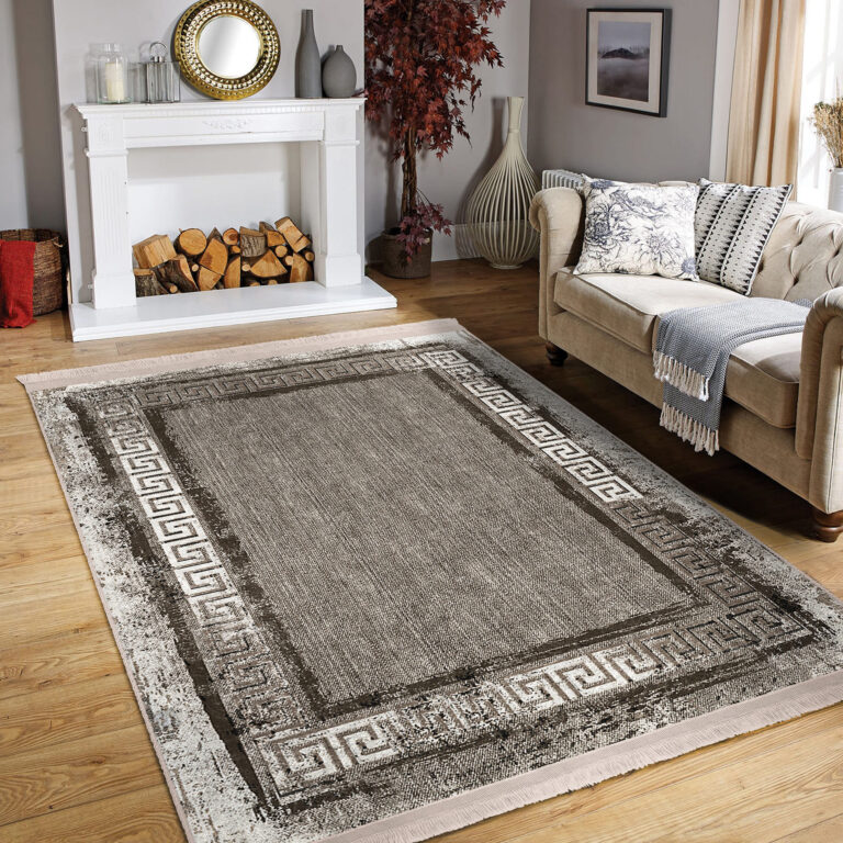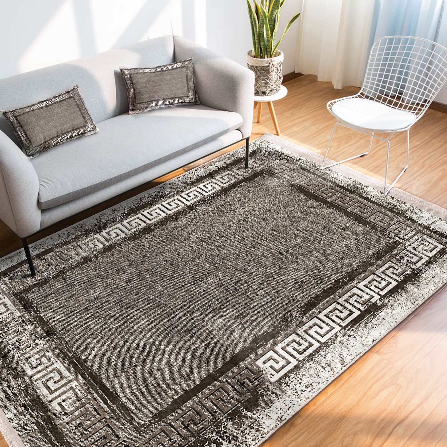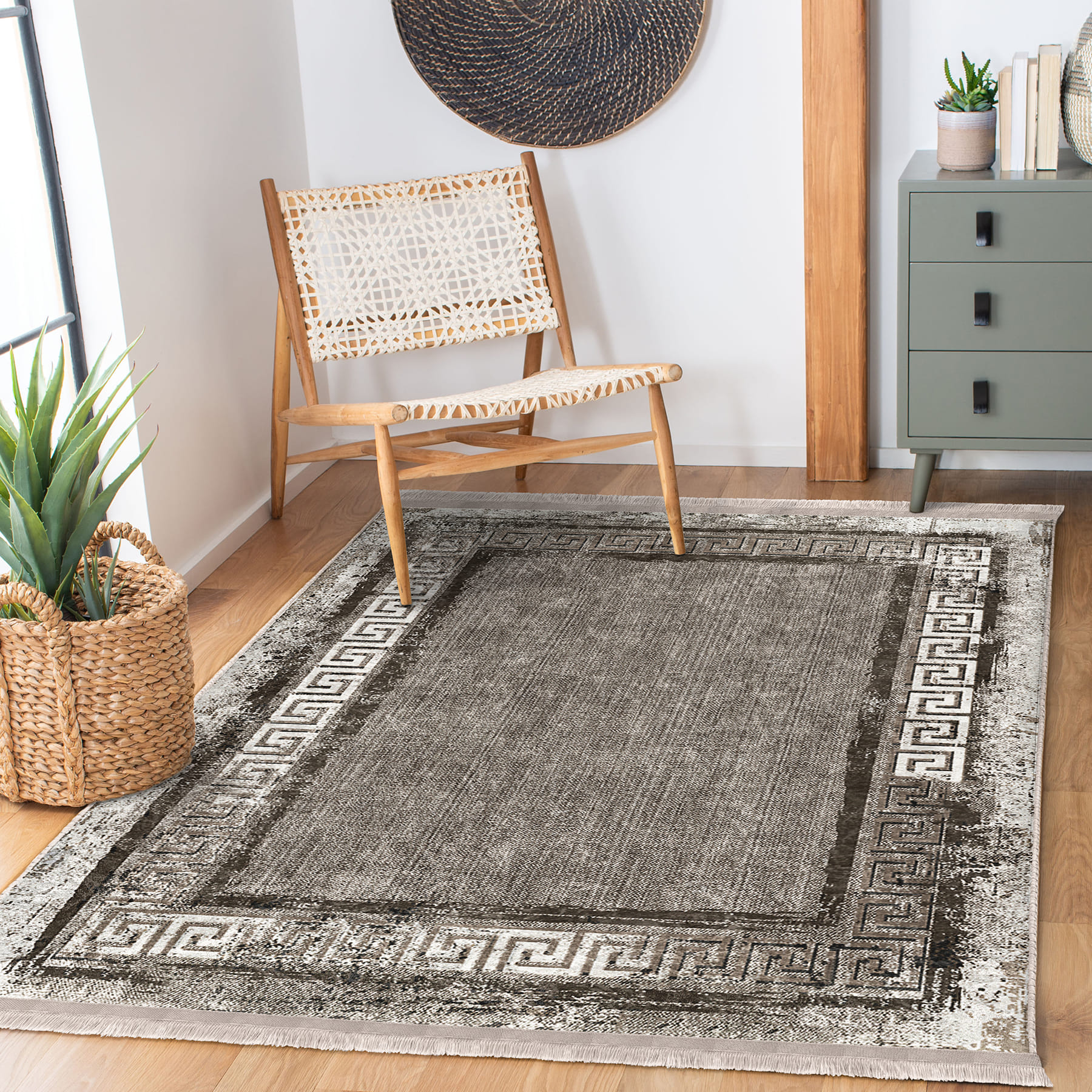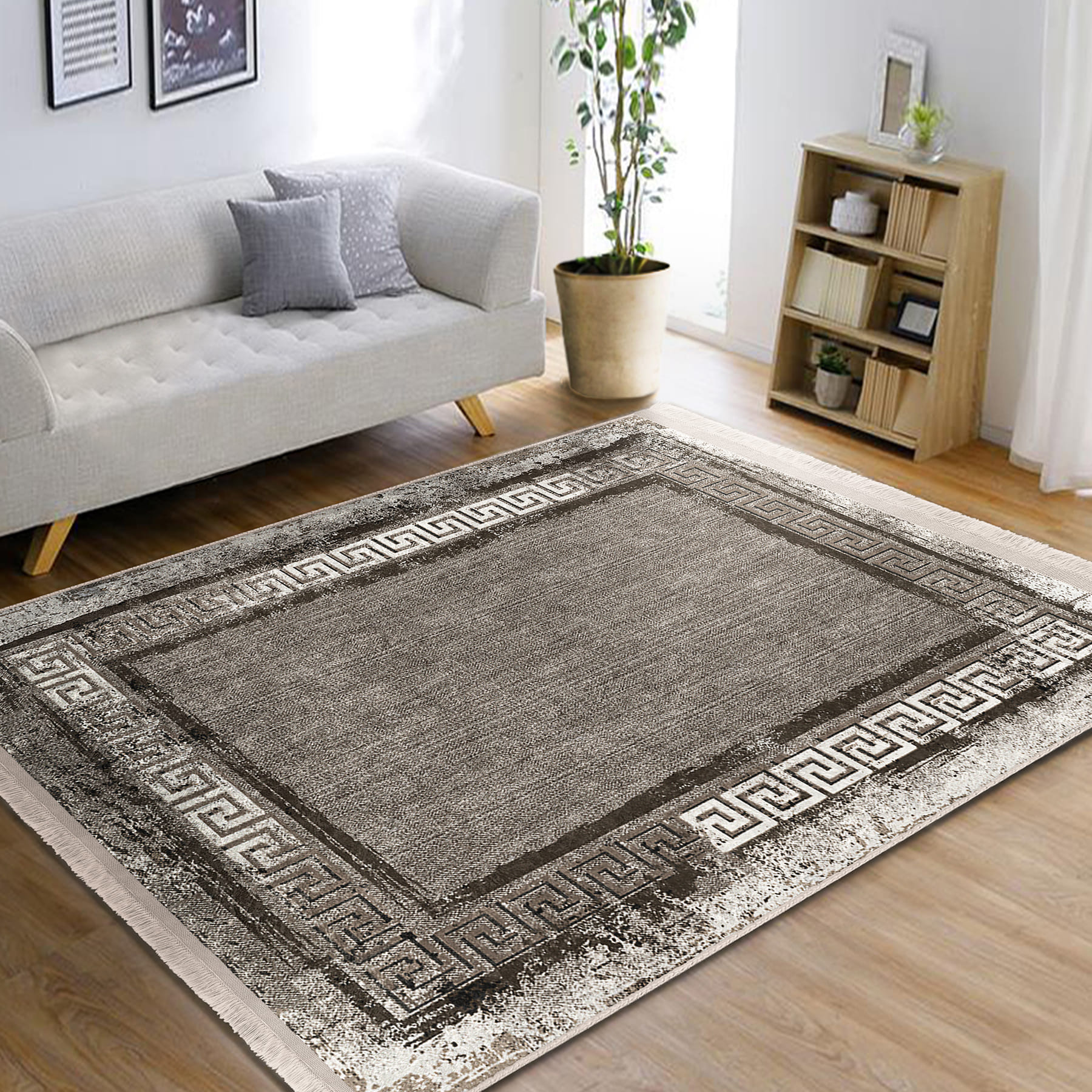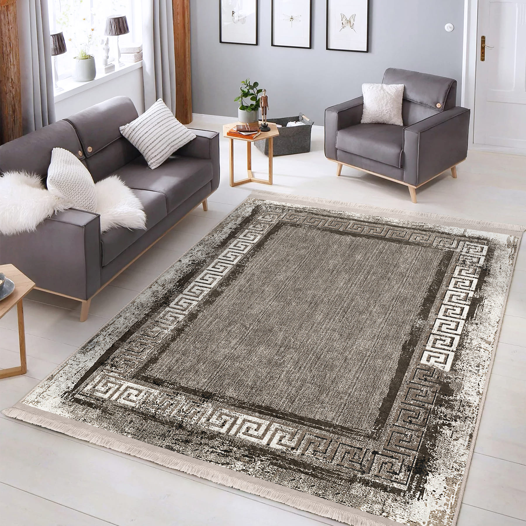 Kahverengi Zeminde Çerçeveli Motifli Eskitme Desenli Klasik Eskitme Motifli Salon & Oturma Odası Yatak Odası Dijital Baskılı Makinede Yıkanabilir Kaymaz Taban Saçaklı Halı