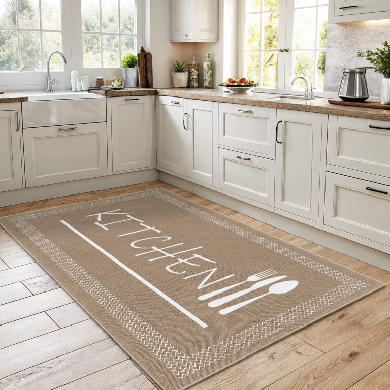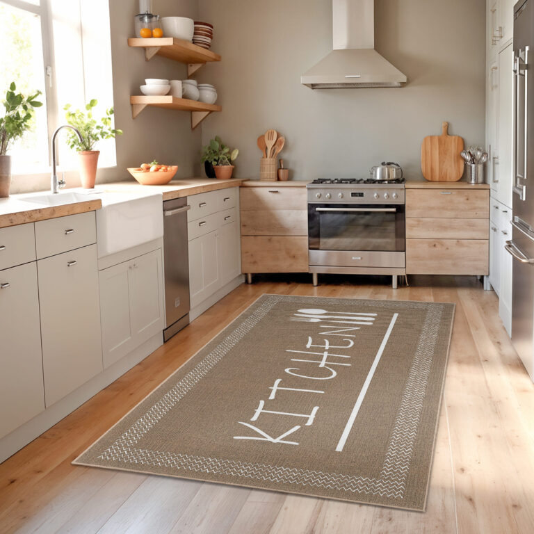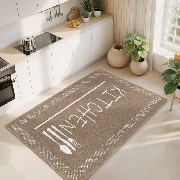 Kahverengi Zeminde Modern Yazı Desenli Mutfak Halısı – Yıkanabilir ve Kaymaz Tabanlı