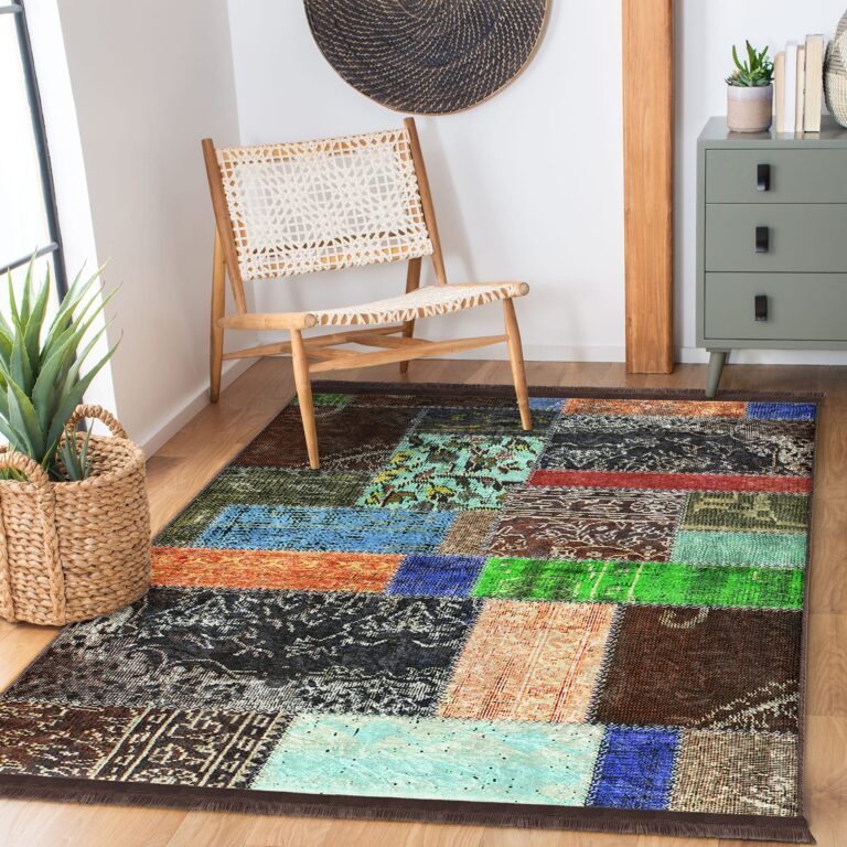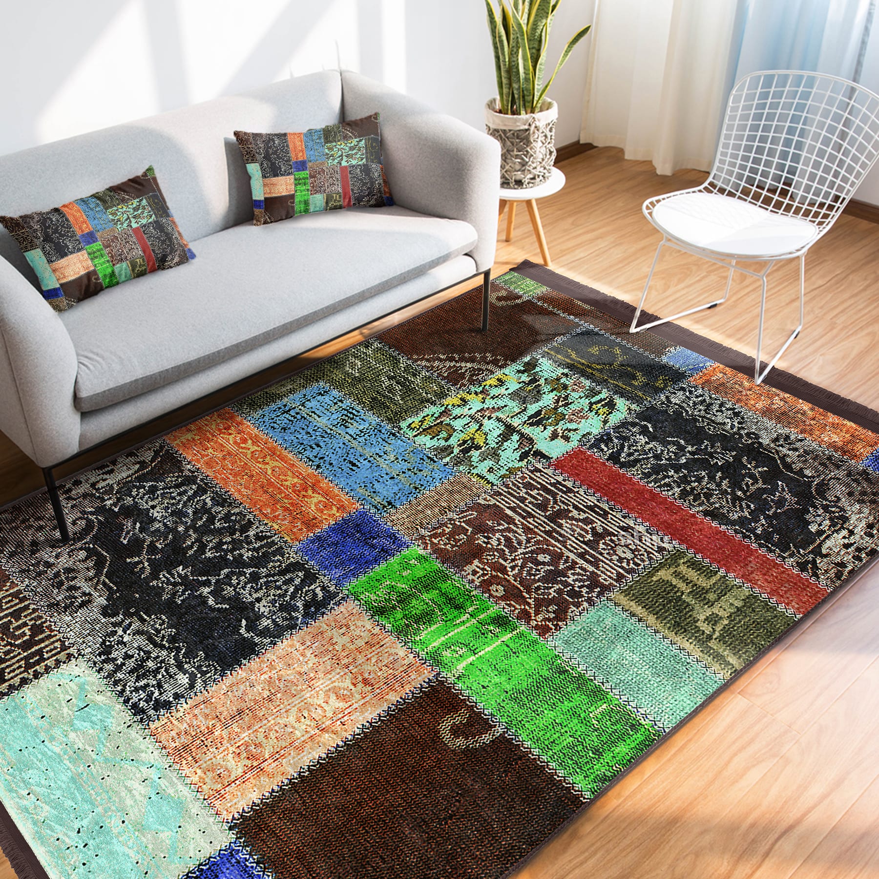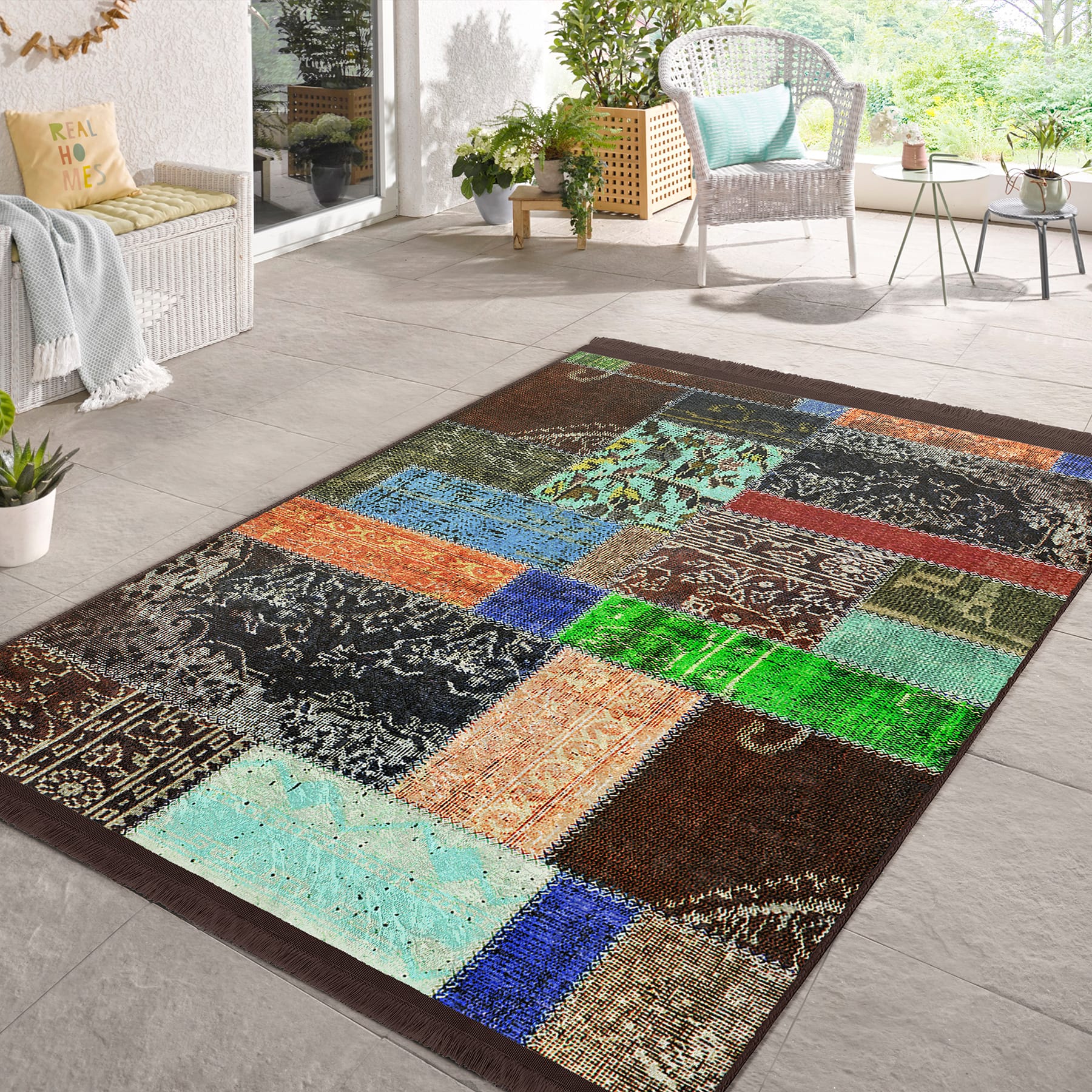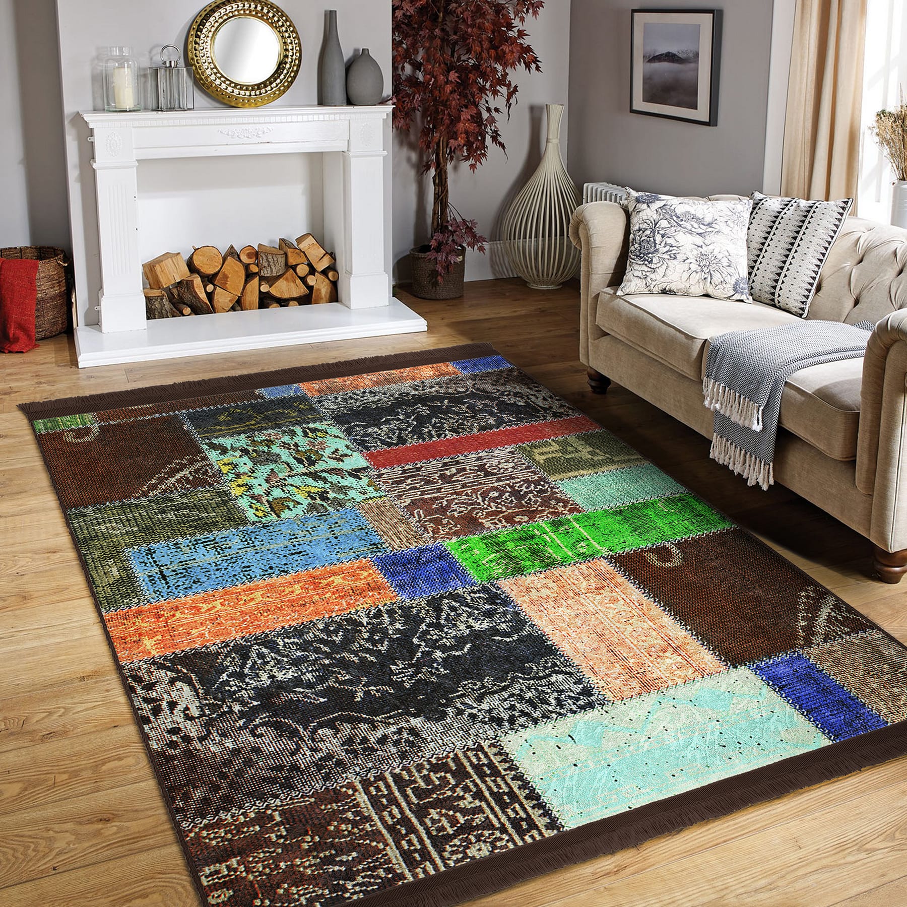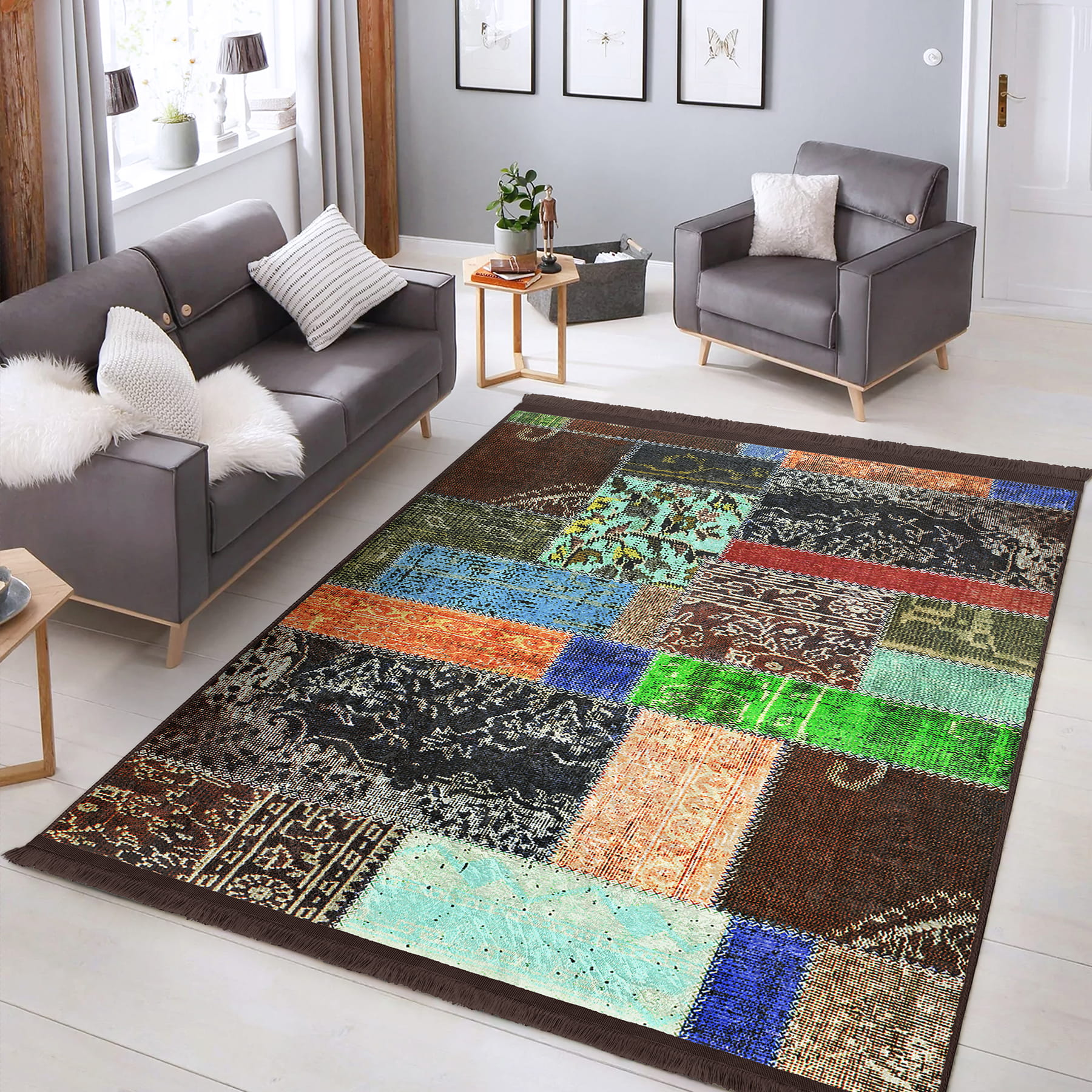 Kahverengi Zeminde Patchwork Motifli Etnik Desenli Vintage Eskitme Motifli Koridor & Antre Dış Mekan & Outdoor Dijital Baskılı Makinede Yıkanabilir Kaymaz Taban Saçaklı Halı