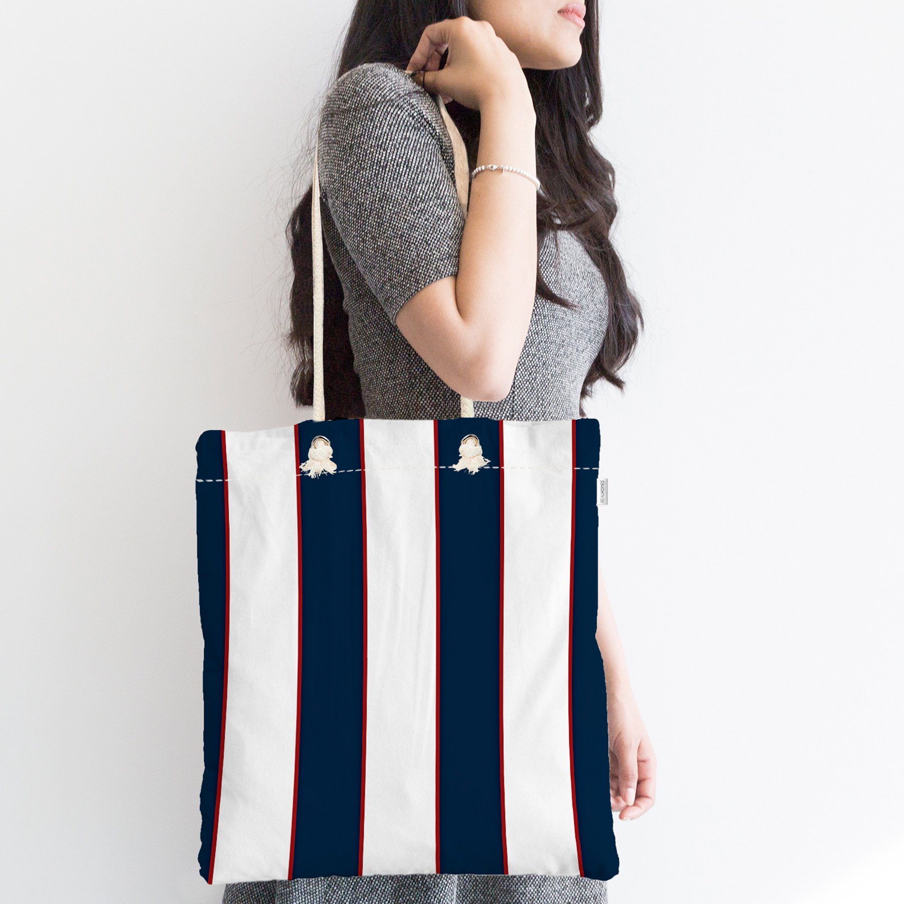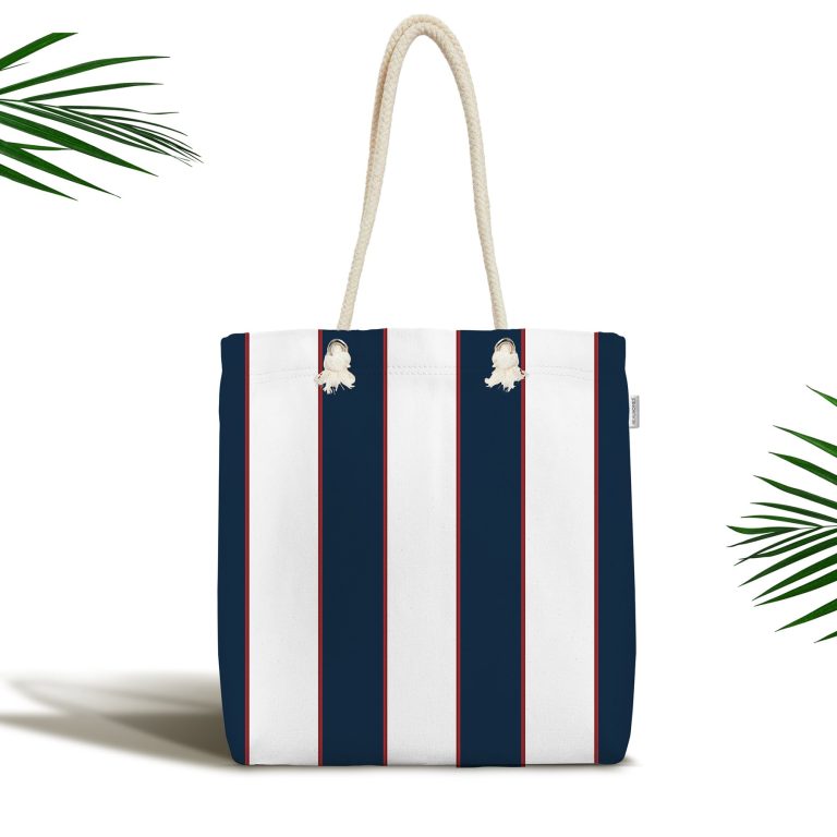 Kırmızı Detaylı Lacivert Beyaz Çizgili Fermuarlı Kumaş Plaj Çantası