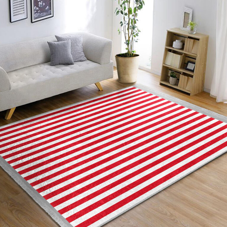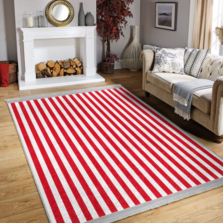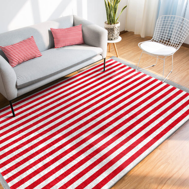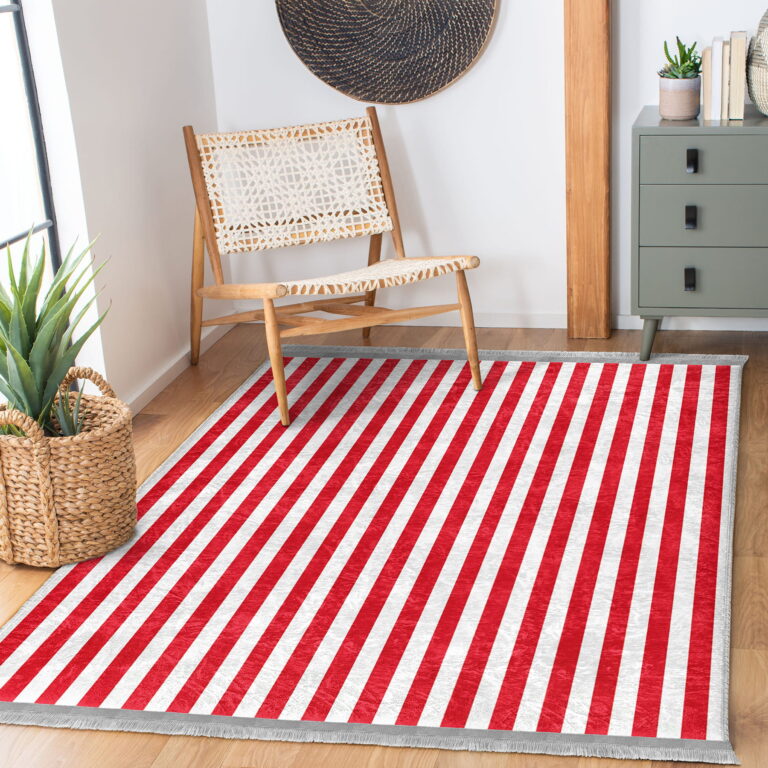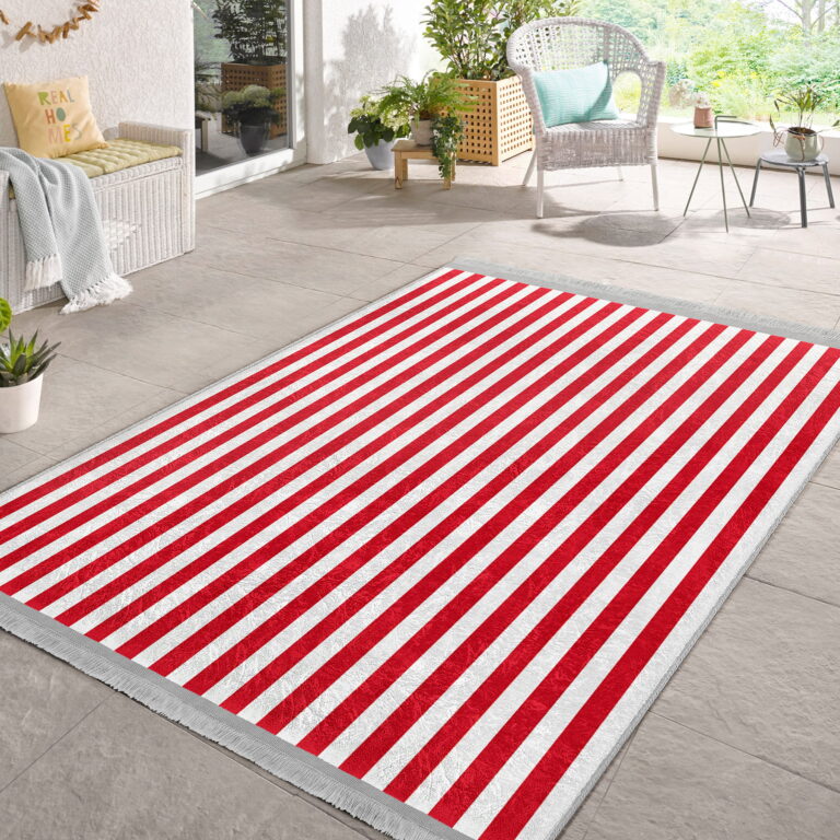 Kırmızı Zeminde Çizgili Motifli Geometrik Desenli Geometrik Sade & Şık Çocuk & Genç Odası Banyo Dijital Baskılı Makinede Yıkanabilir Kaymaz Taban Saçaklı Halı
