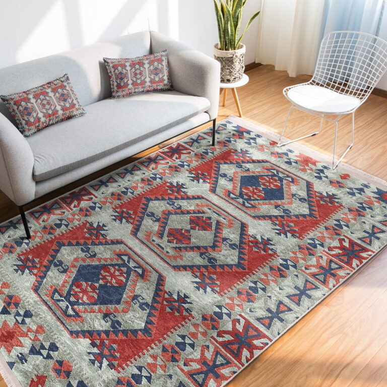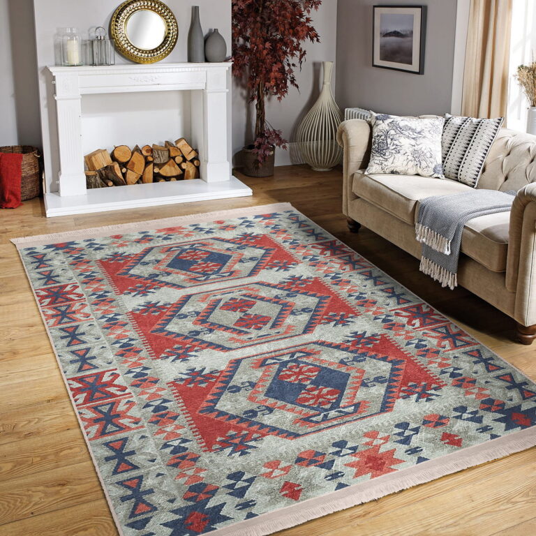 Kırmızı Zeminde Kilim Motifli Geleneksel Desenli Avangarde Etnik Motifler Salon & Oturma Odası Yatak Odası Dijital Baskılı Makinede Yıkanabilir Kaymaz Taban Saçaklı Halı