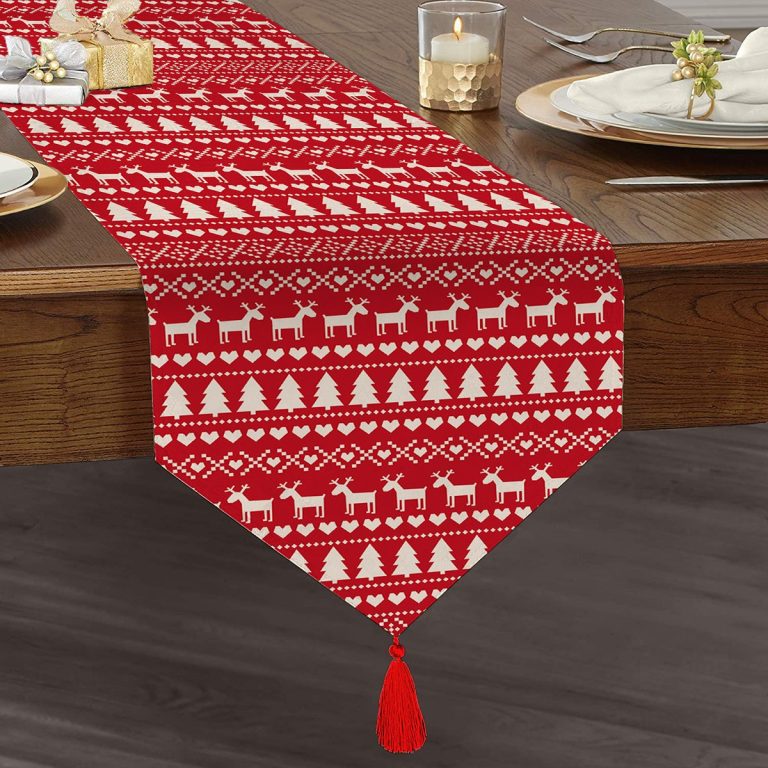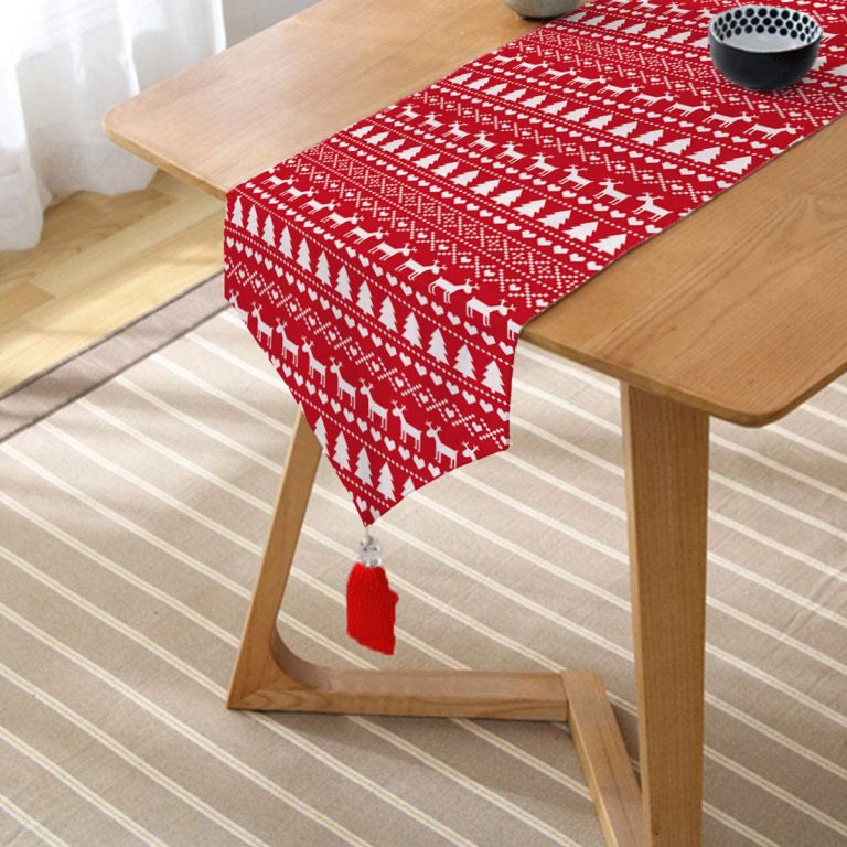 Kırmızı Zeminde Yılbaşı Motifleri Dijital Baskılı Püsküllü Şönil Üçgen Runner