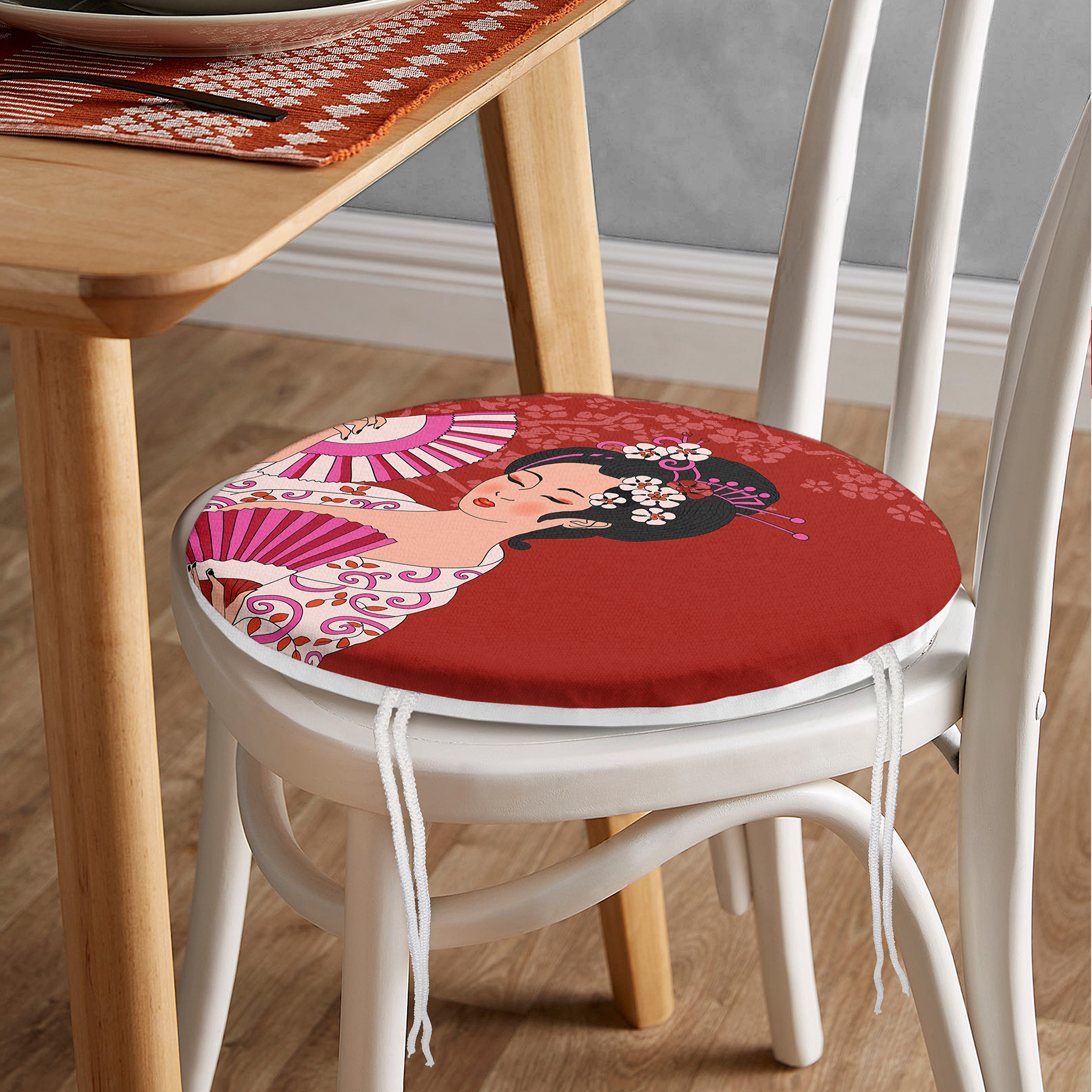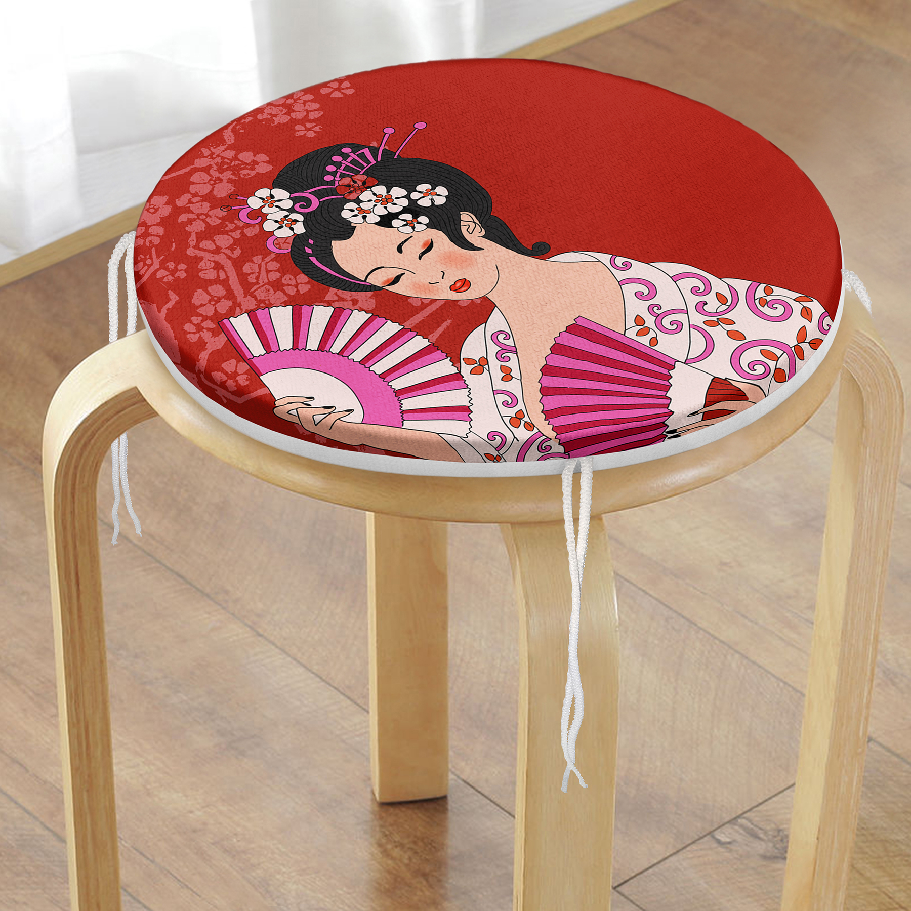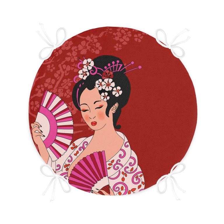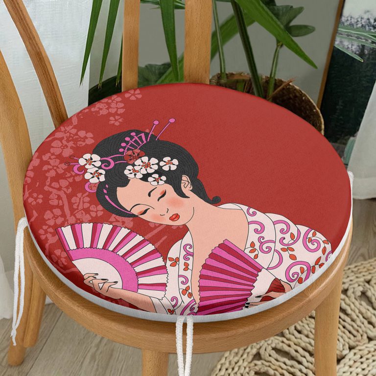 Kırmızı Zeminli Pembe Yelpazeli Japon Kız Dijital Baskılı Yuvarlak Fermuarlı Sandalye Minderi