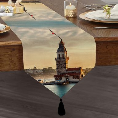 Kız Kulesi Dijital Baskılı Dekoratif Püsküllü Şönil Üçgen Runner