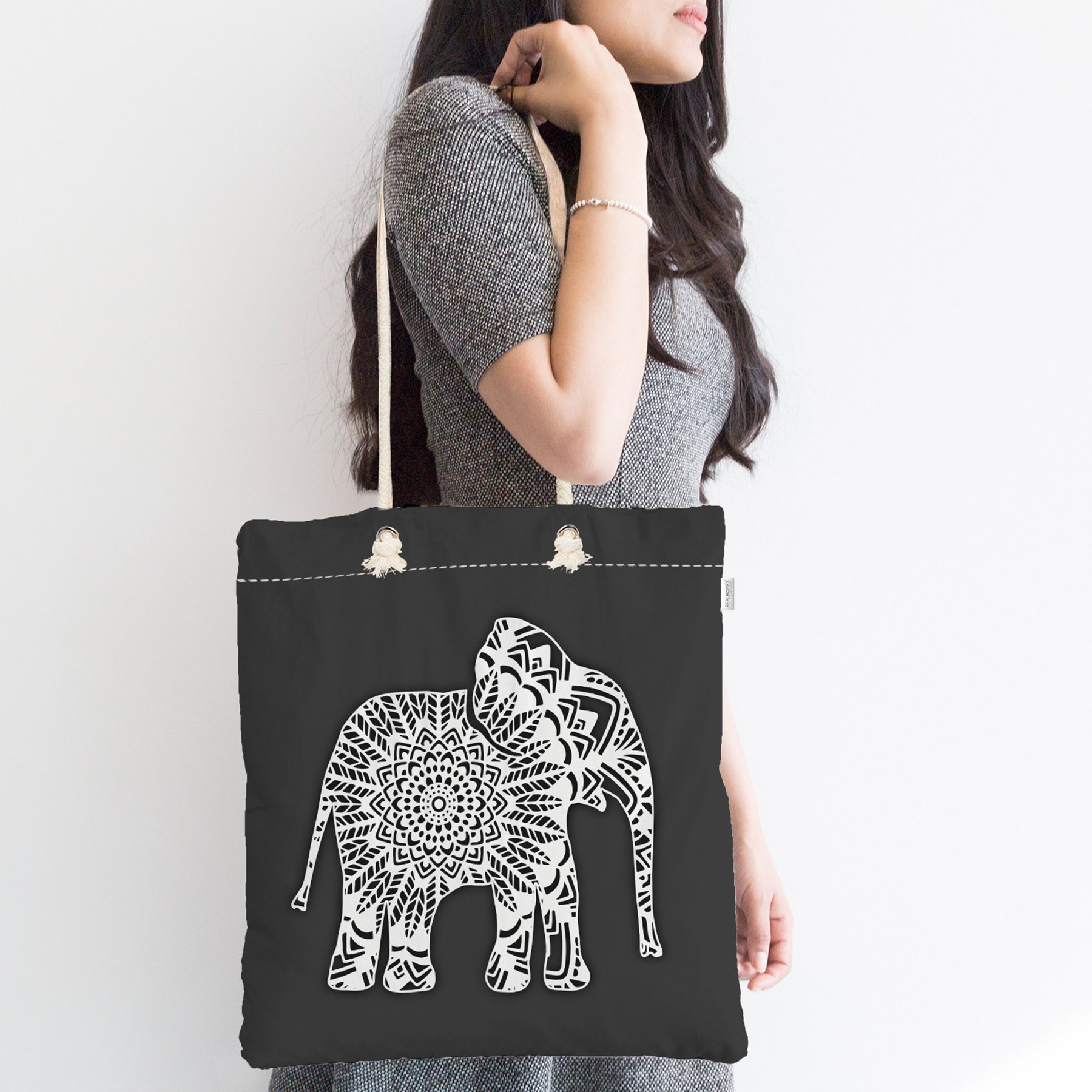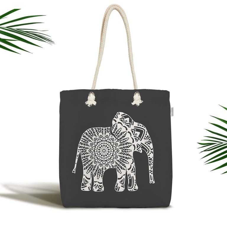 Koyu Füme Zemin Etnik Fil Motifli Dekoratif Fermuarlı Kumaş Plaj Çantası