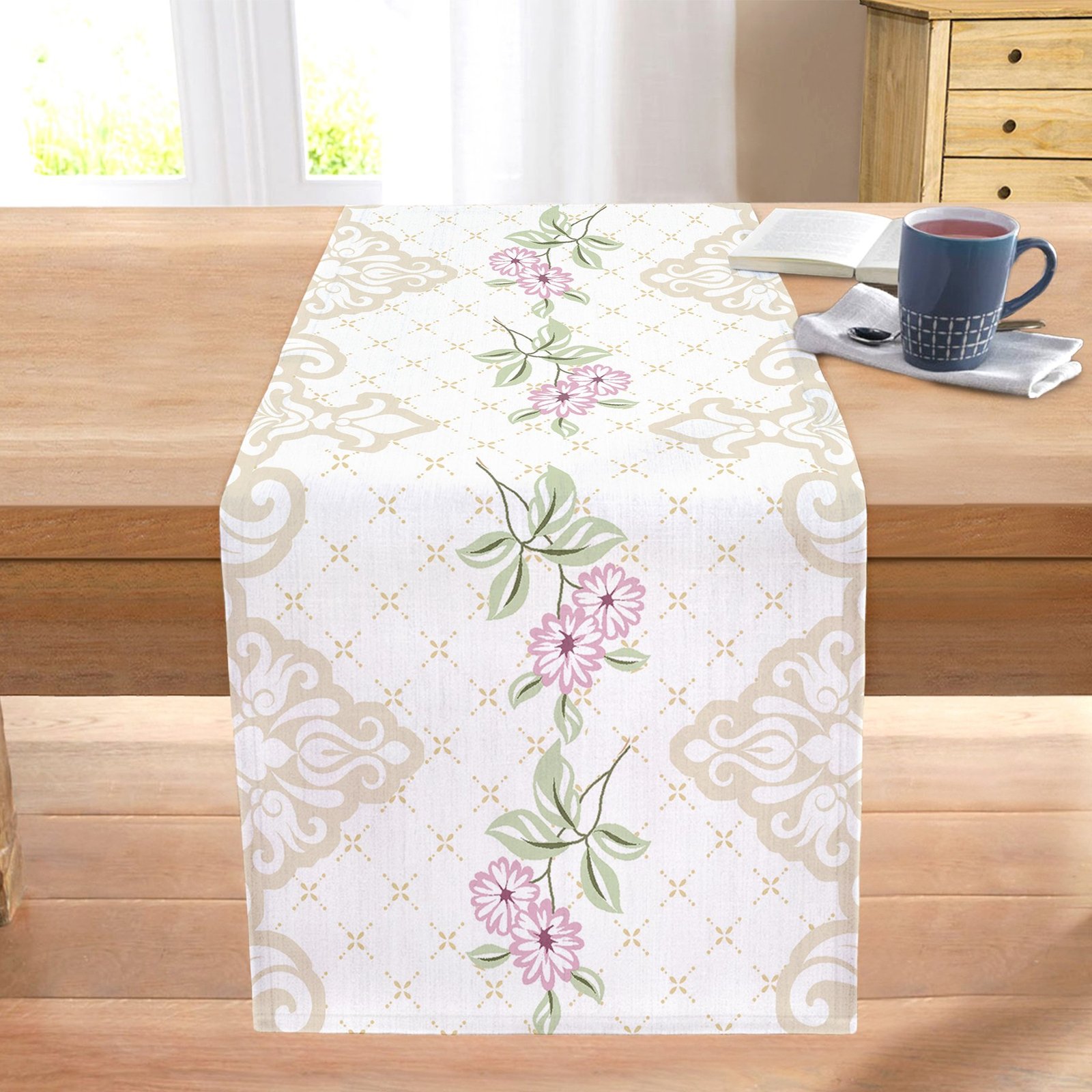 Krem Çizgili Zemin Çiçek Temalı Modern Dikişli Şönil Runner