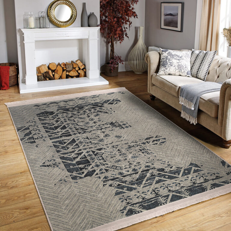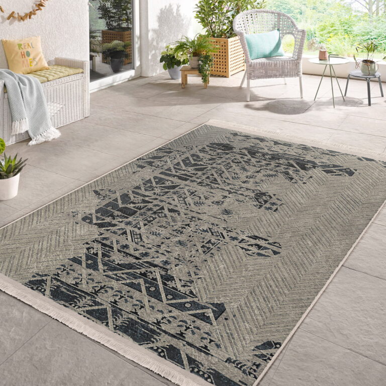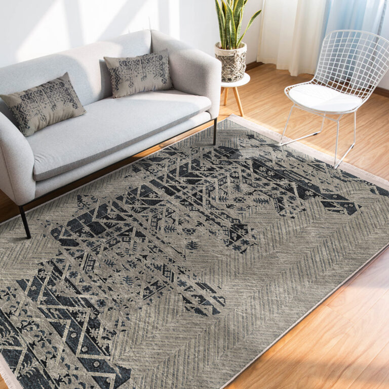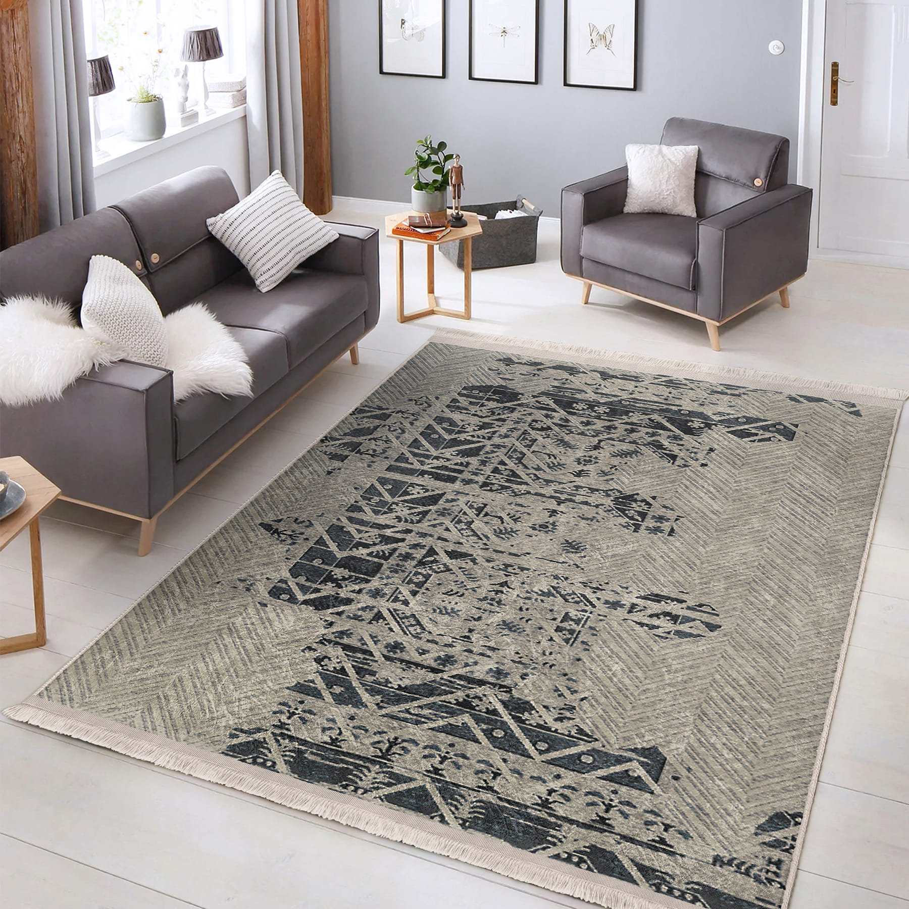 Krem – Gri Zeminde Antik Motifli Geleneksel Desenli Eskitme Motifli Avangarde Salon & Oturma Odası Yatak Odası Dijital Baskılı Makinede Yıkanabilir Kaymaz Taban Saçaklı Halı