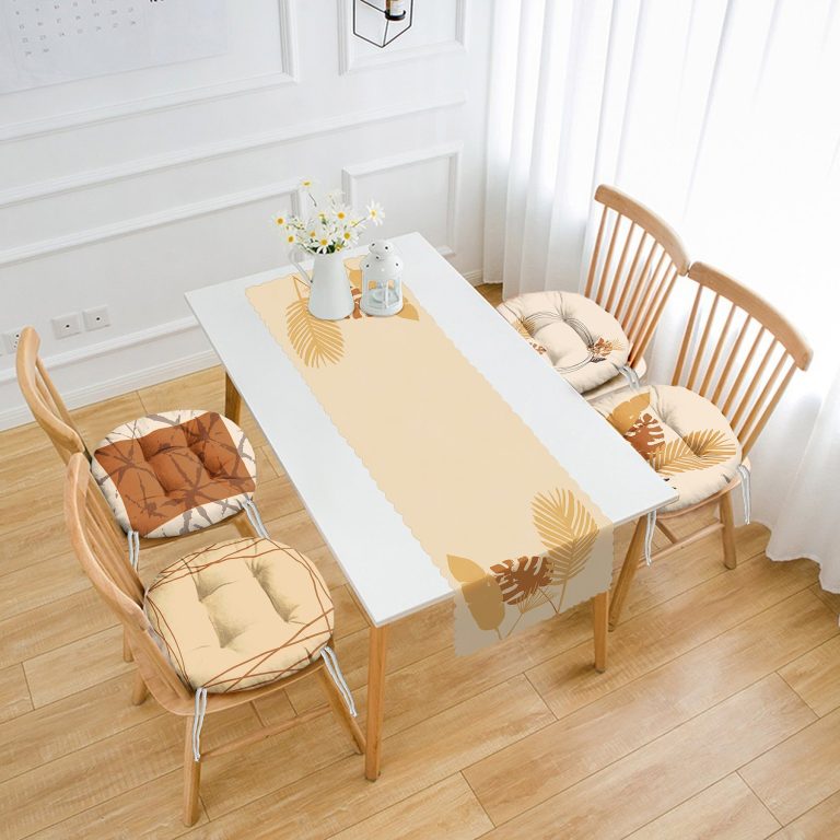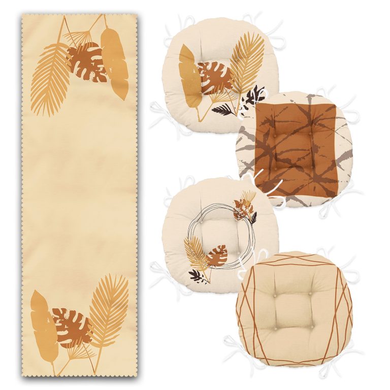 Krem Renkli Özel Tasarım 4 Yuvarlak Pofidik Sandalye Minderi ve 1 Runner Seti