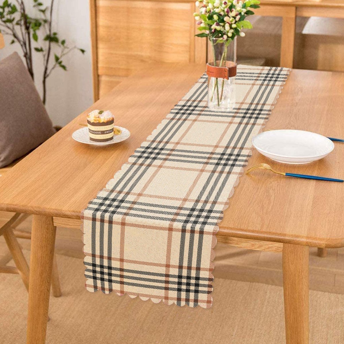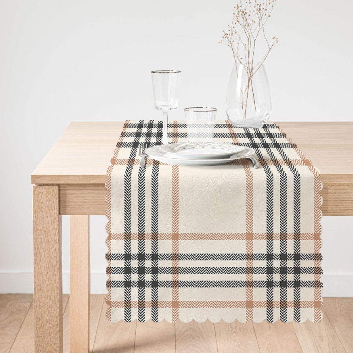 Krem Renkte Ekose Desenli Dekoratif Özel Tasarım Runner